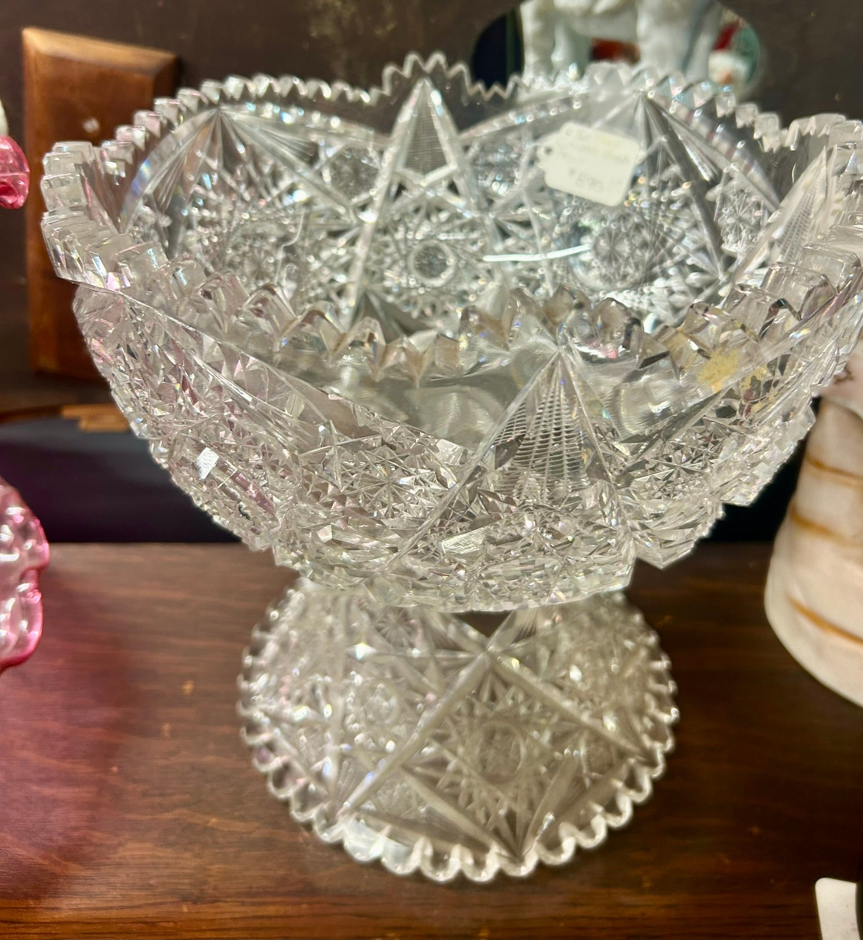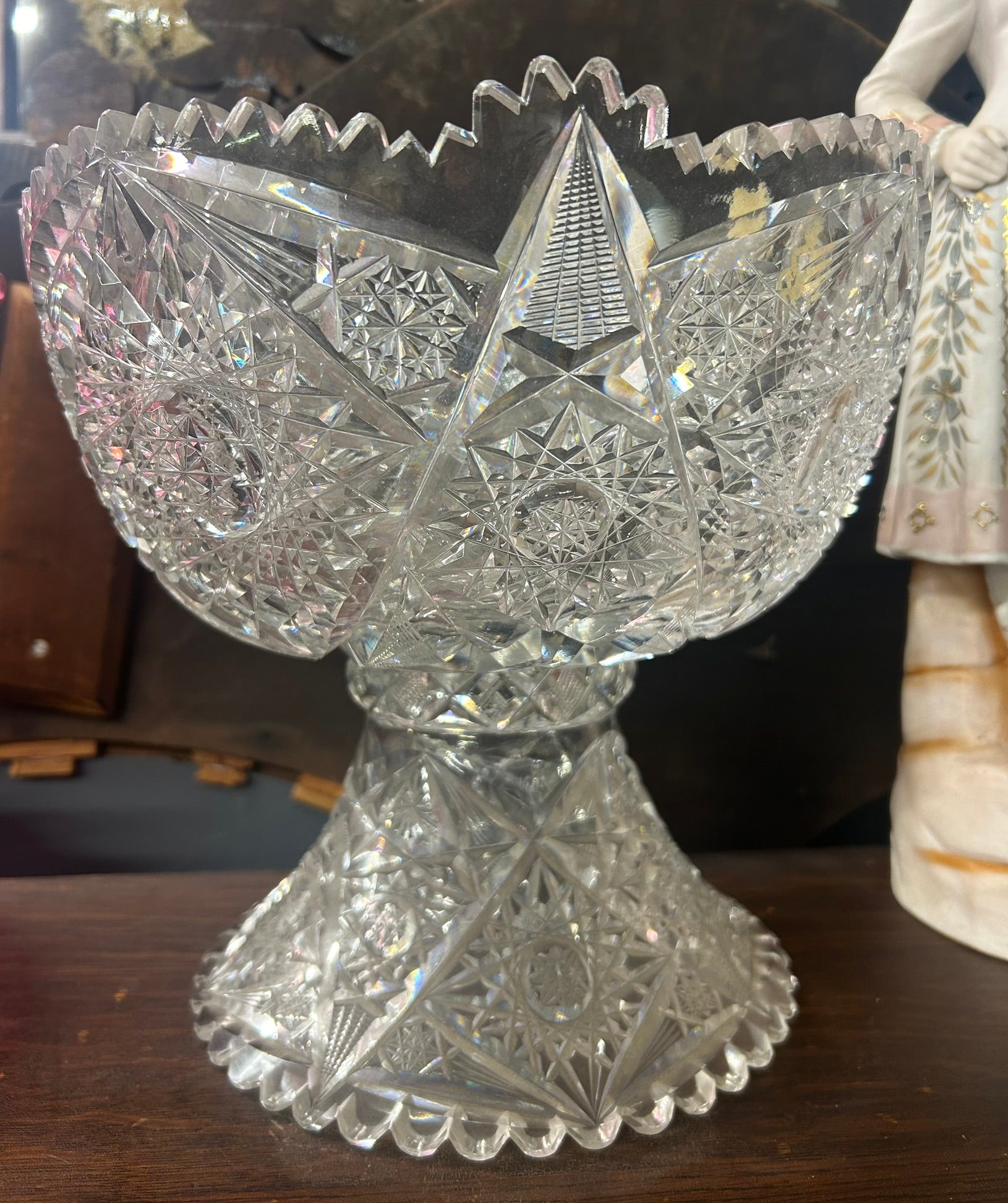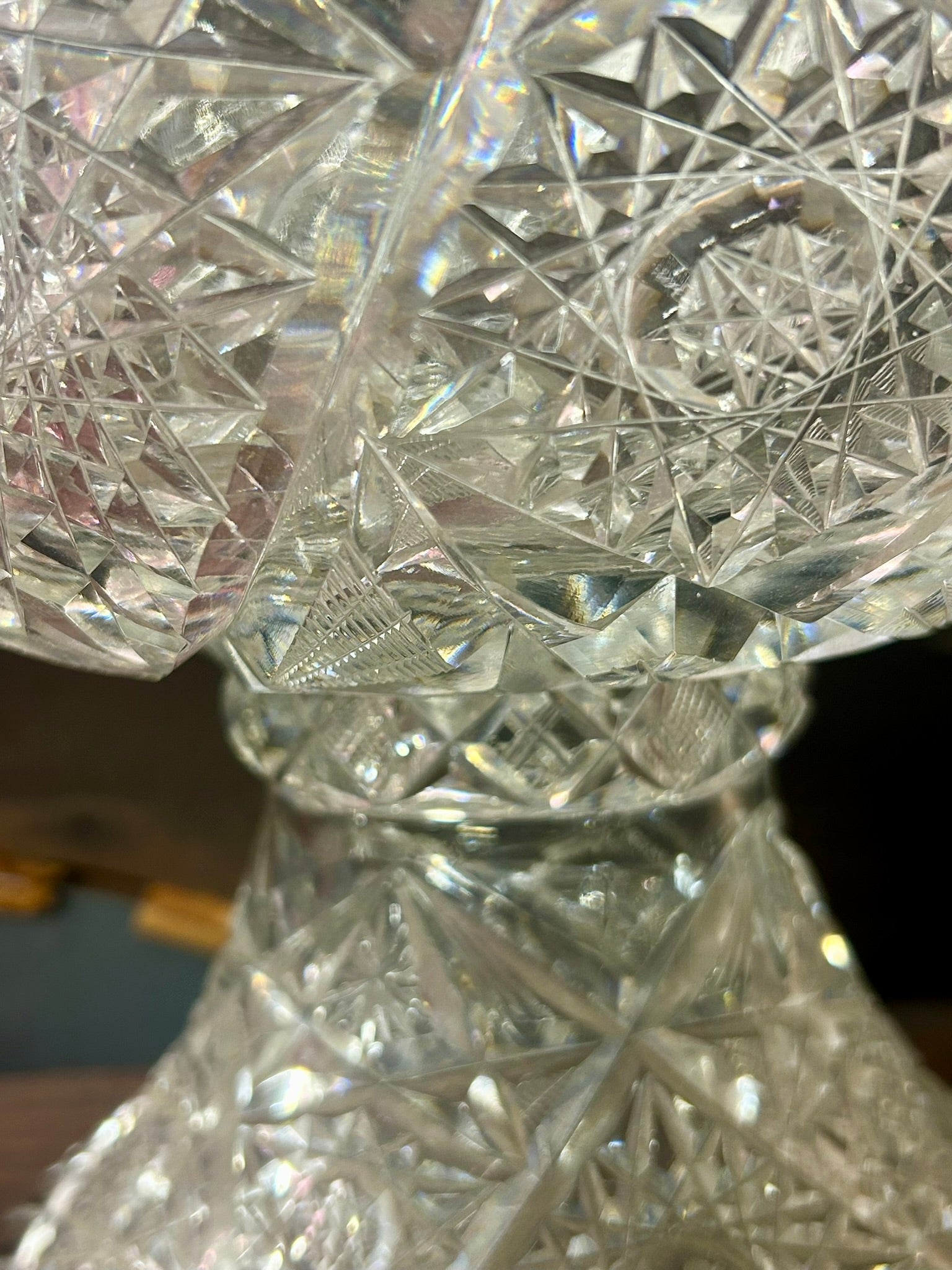 ANTIQUE CUT GLASS TWO PIECE PUNCH BOWL 9 1/2" TALL AND 10" WIDE. CALL, TEXT, OR E-MAIL FOR MORE INFORMATION