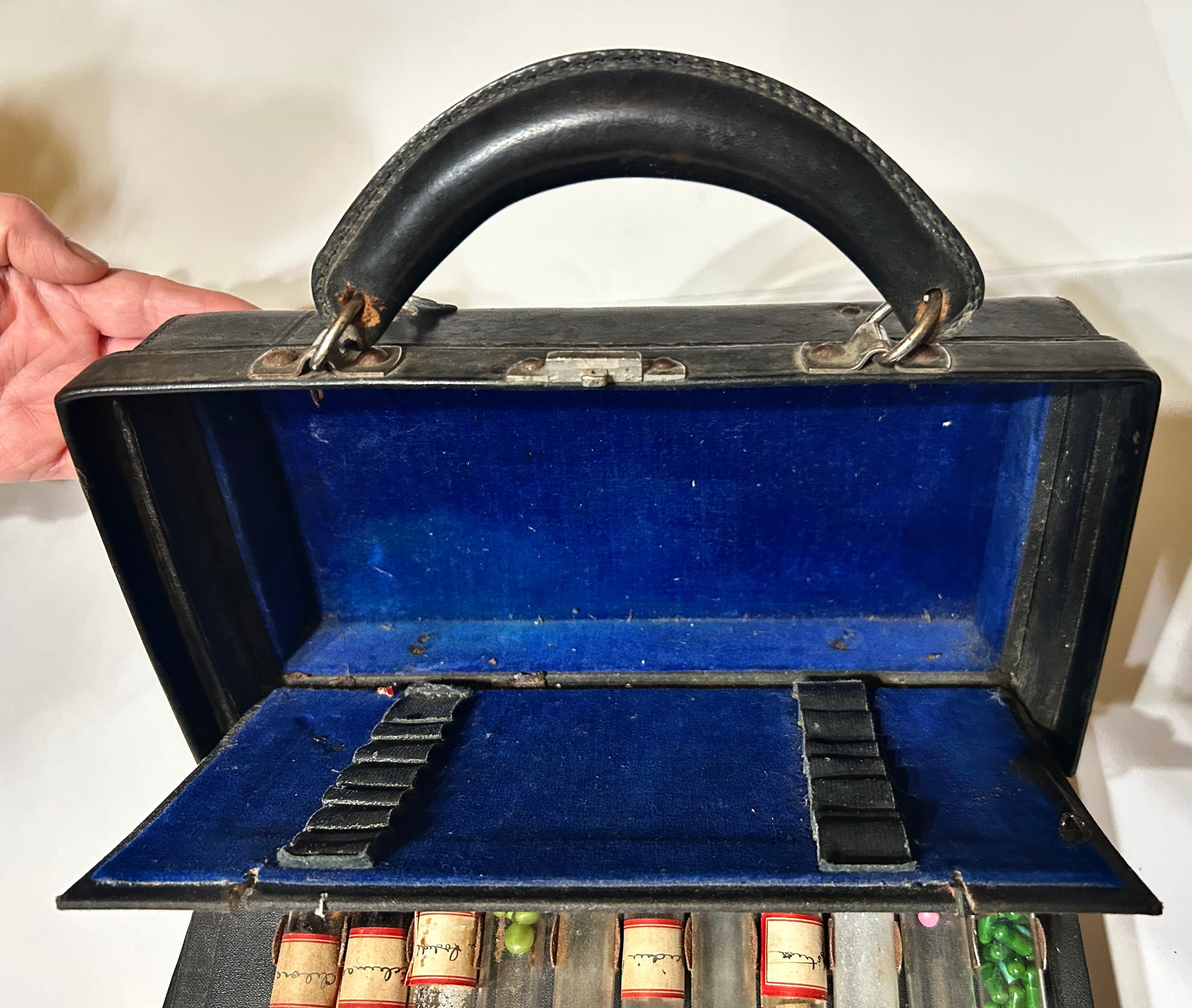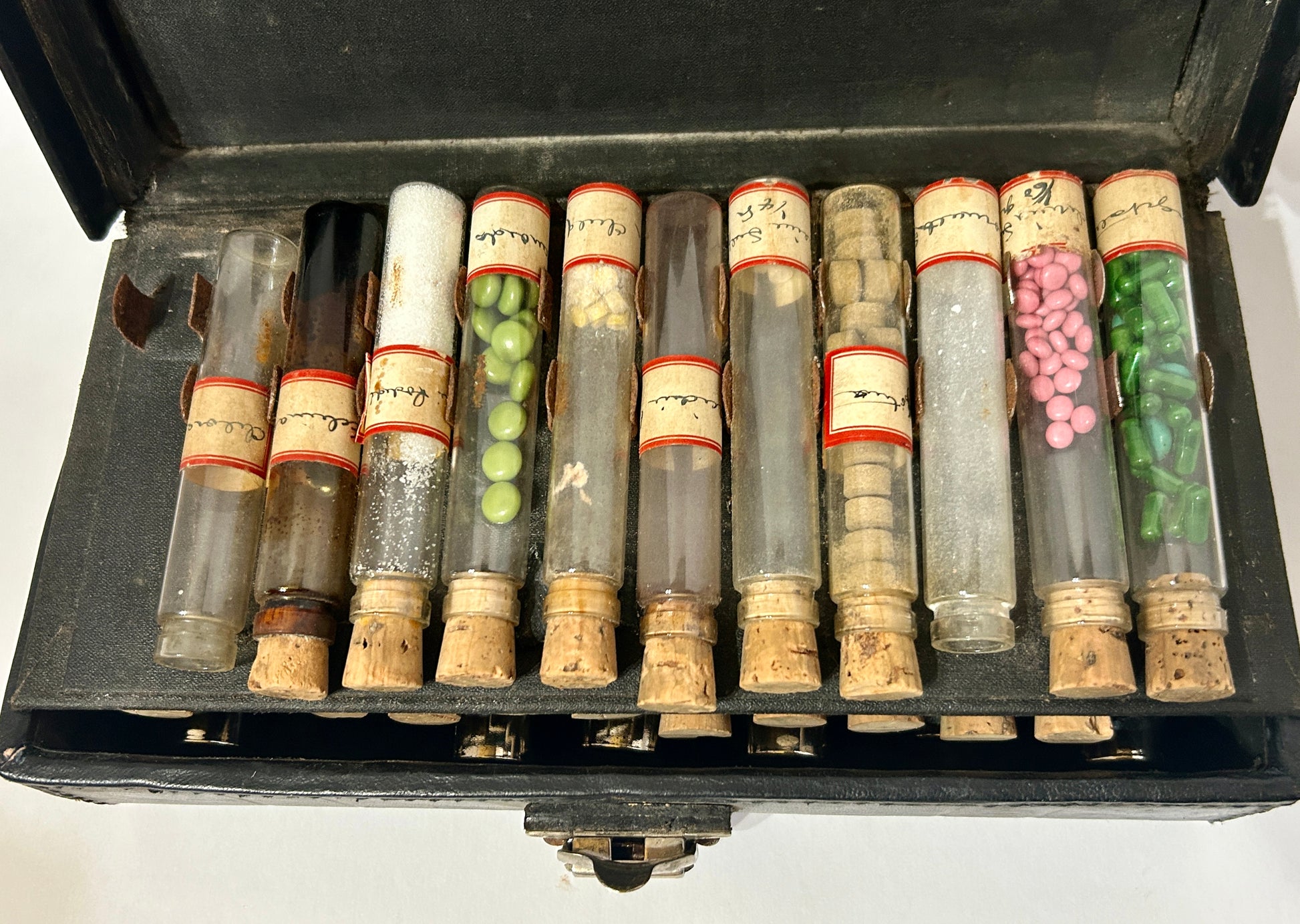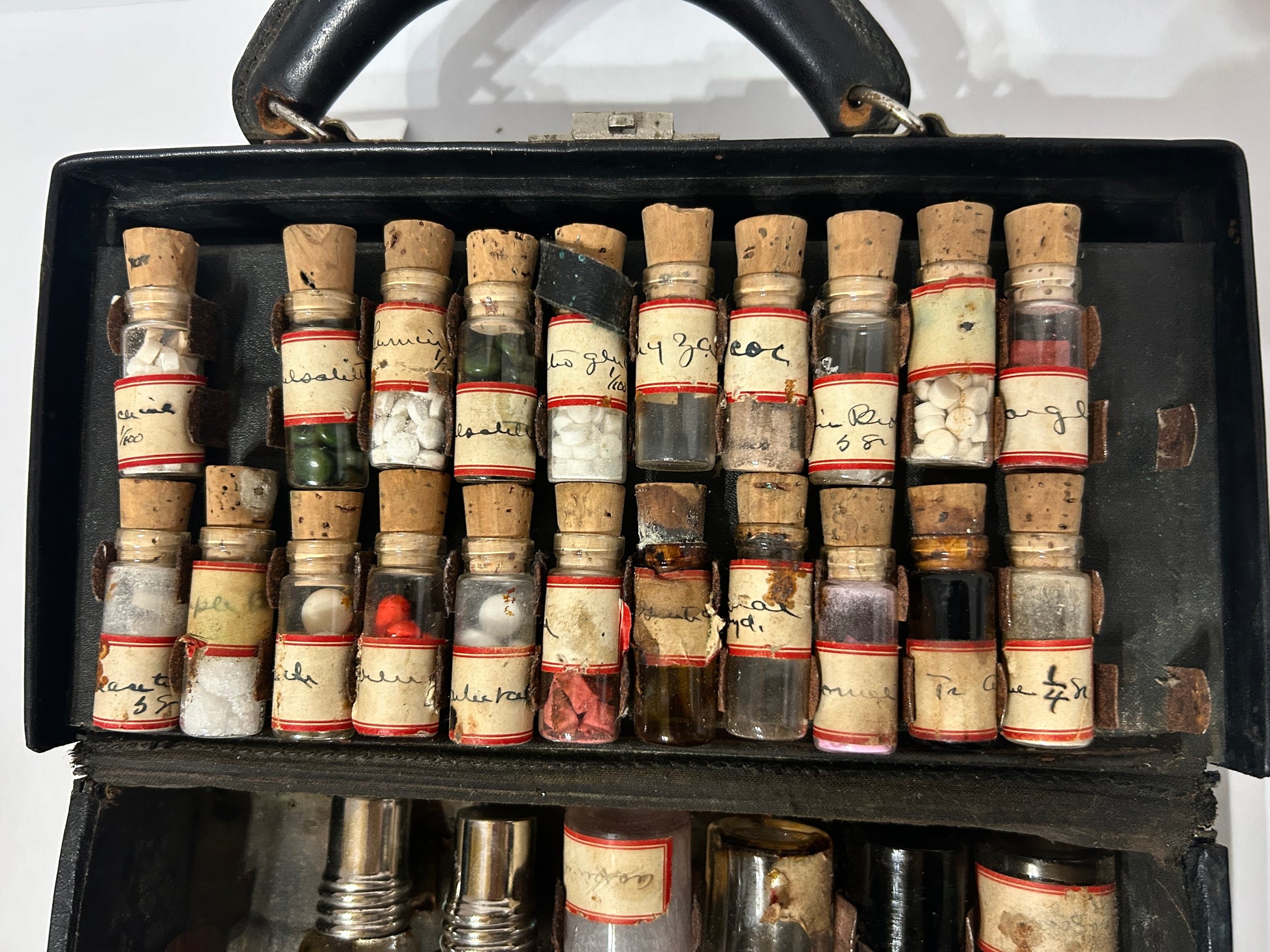 ANTIQUE DOCTORS MEDICINE KIT COMPLETE WITH CONTENTS 10 1/2" WIDE X 5 1/2" X 5 1/2". CALL OR TEXT FOR MORE INFORMATION