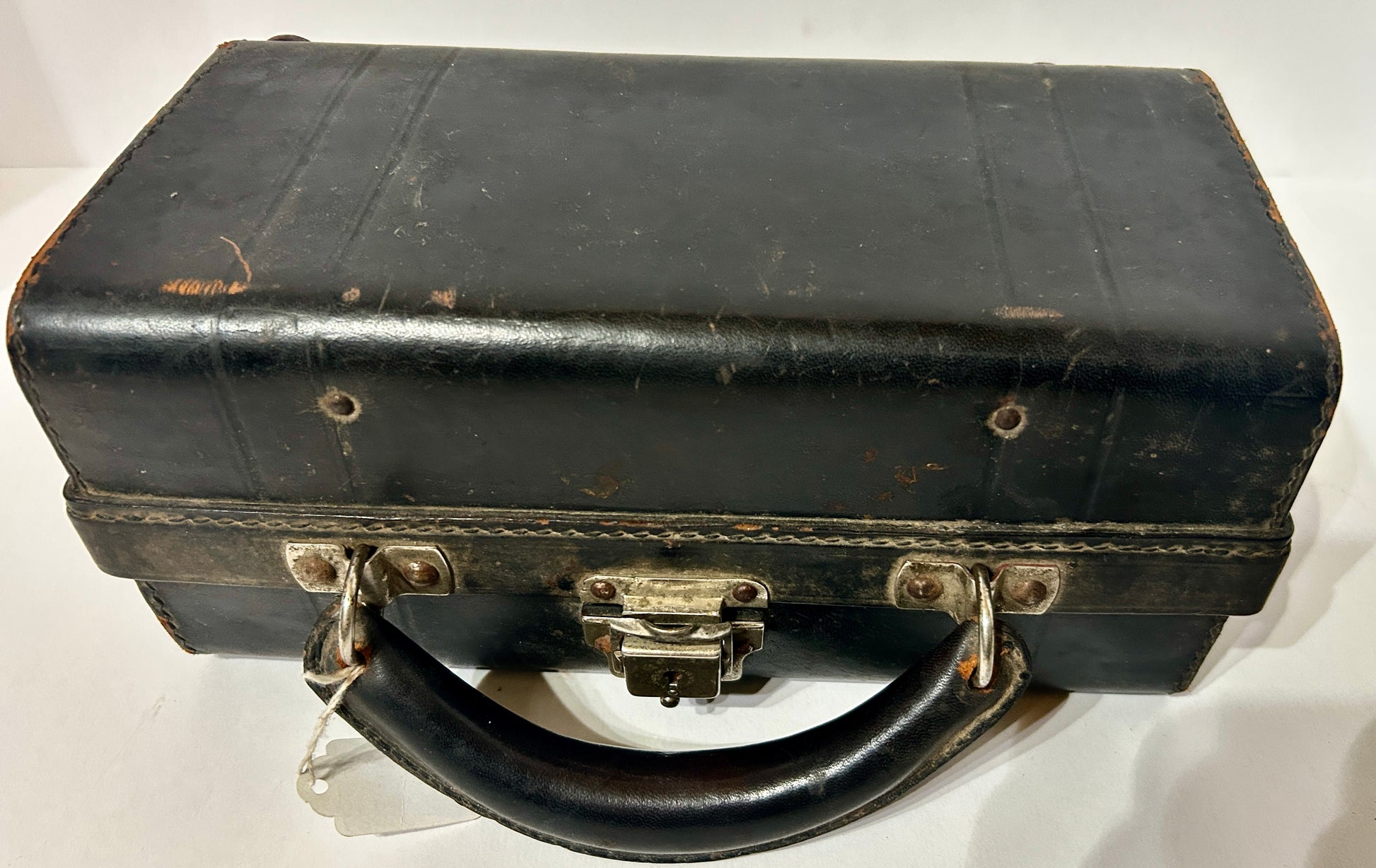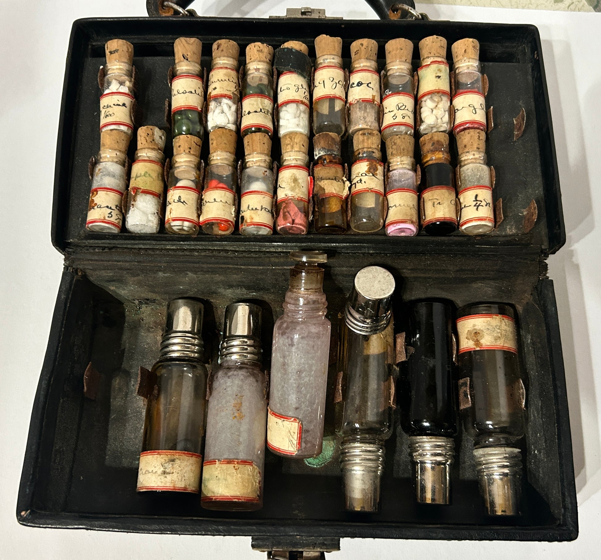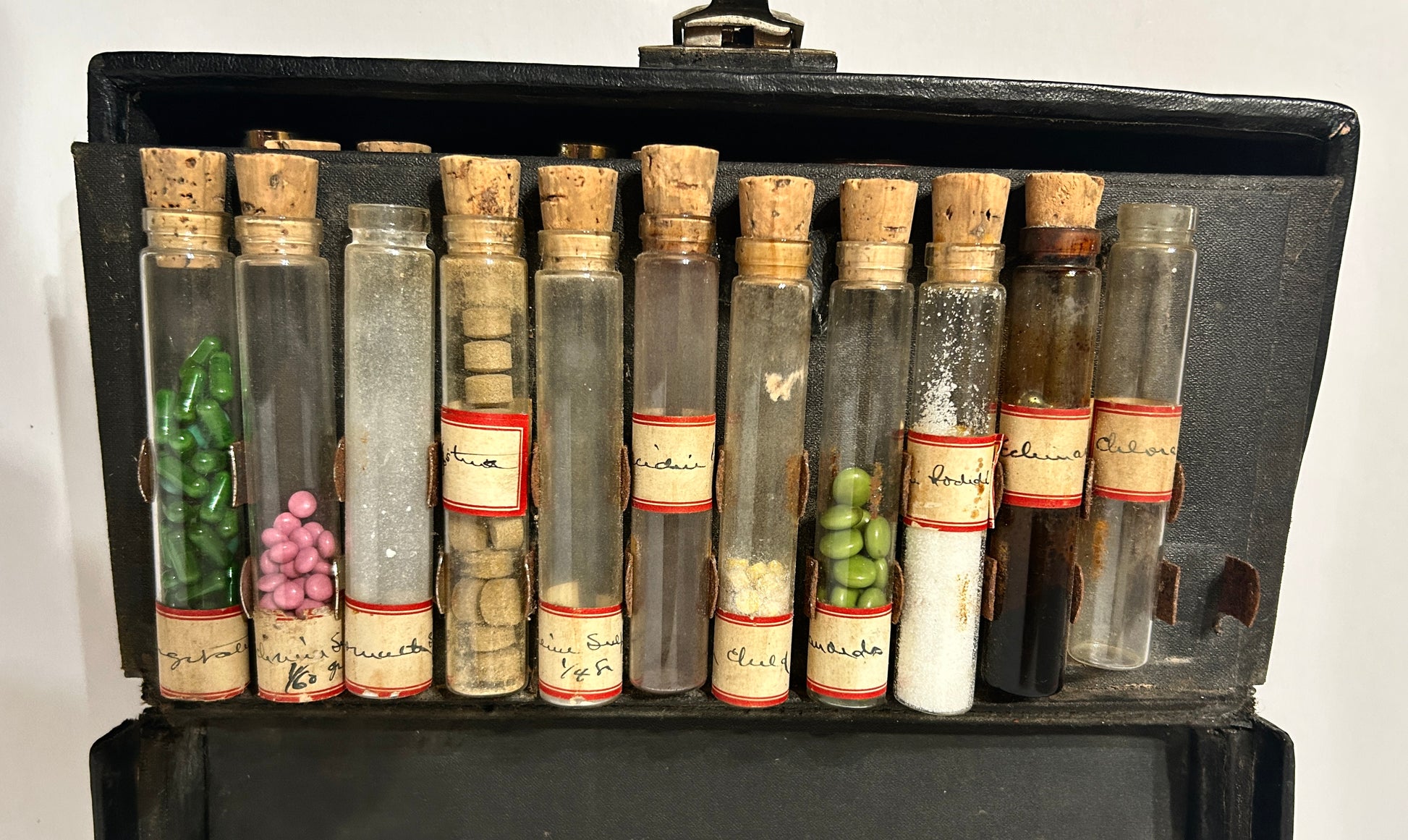 ANTIQUE DOCTORS MEDICINE KIT COMPLETE WITH CONTENTS 10 1/2" WIDE X 5 1/2" X 5 1/2". CALL OR TEXT FOR MORE INFORMATION
