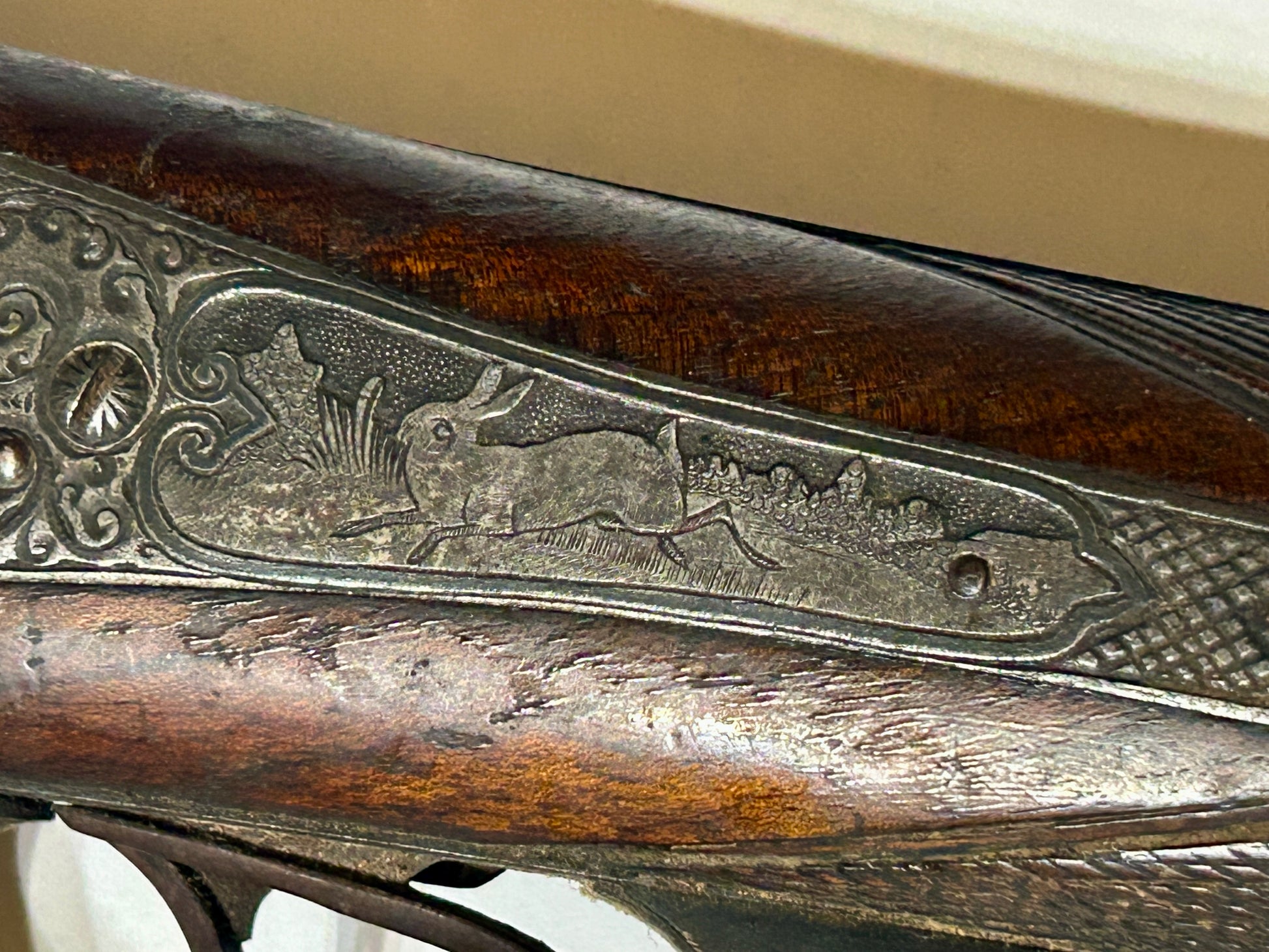 ANTIQUE FANCY SHOTGUN RECEIVER AND STOCK ONLY WITH LOTS OF ANIMAL ENGRAVINGS NOTE THAT ONE HAMMER IS BROKEN and NO BARRELS, 24" LONG. CALL OR TEXT FOR MORE INFORMATION