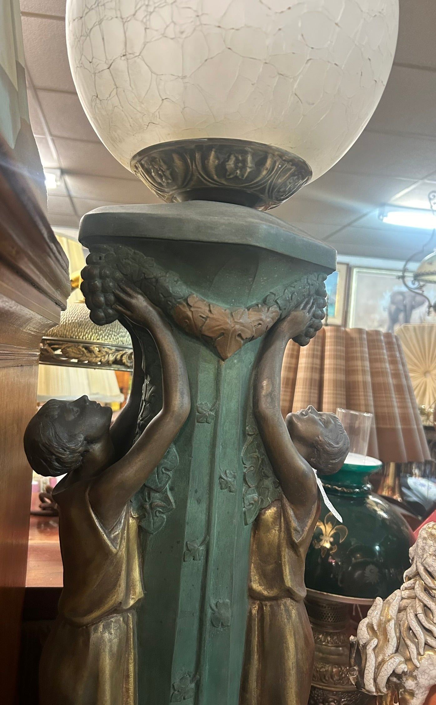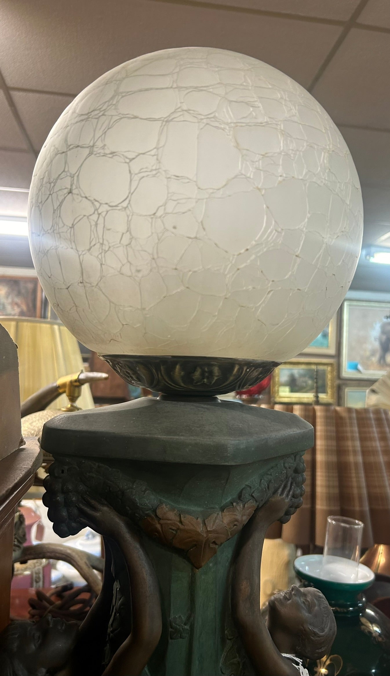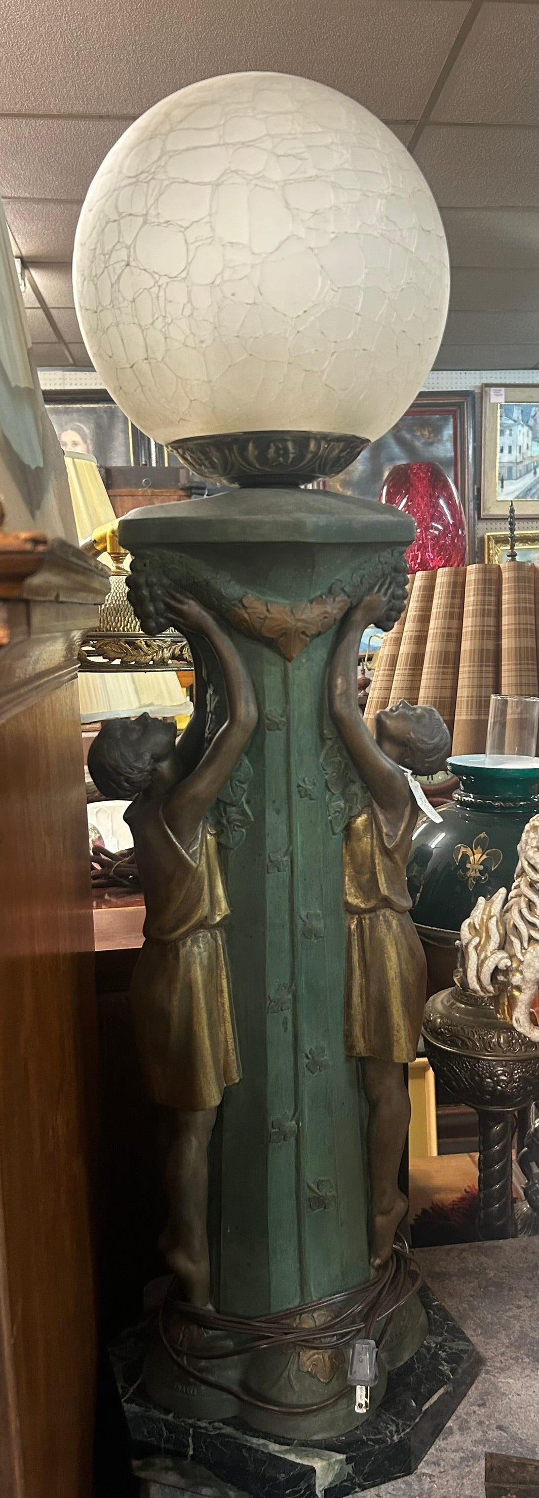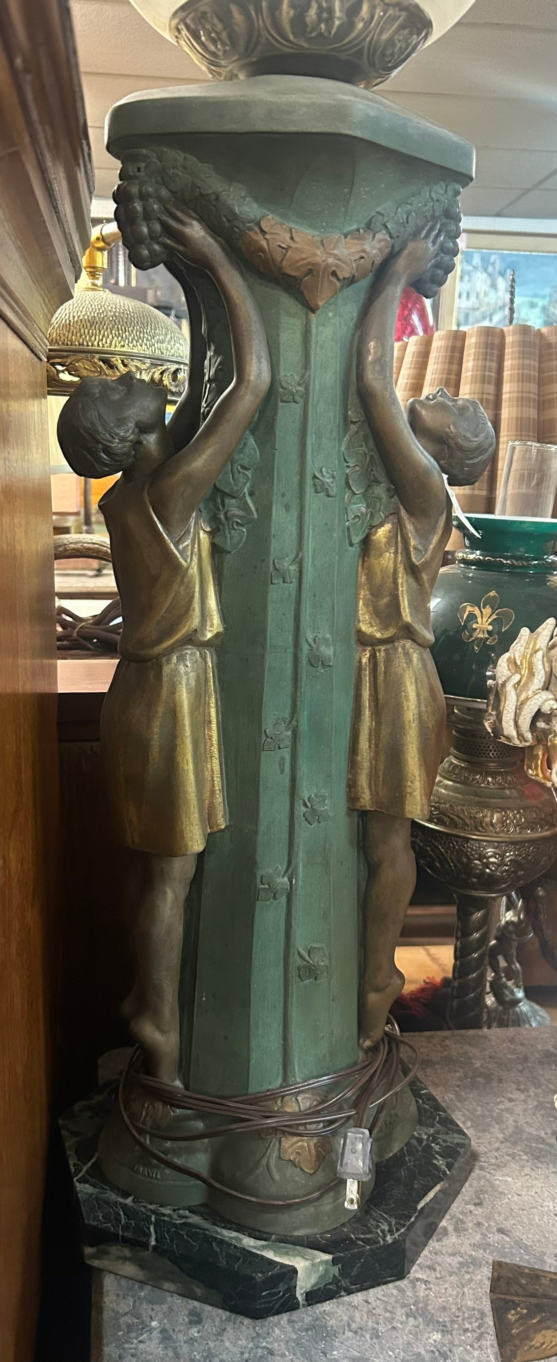 ANTIQUE FRENCH FIGURAL METAL DOUBLE LADY TABLE LAMP WITH BALL SHADE, 31" TALL. CALL, TEXT, OR E-MAIL FOR MORE INFORMATION