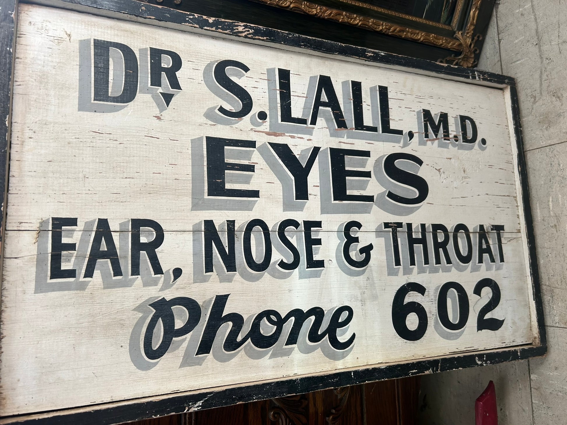 ANTIQUE DR. S. LALL, M.D. EYES, EAR, NOSE & THROAT WOODEN HAND PAINTED DOUBLE SIDED SIGN 19" X 31". CALL, TEXT, OR E-MAIL FOR MORE INFORMATION