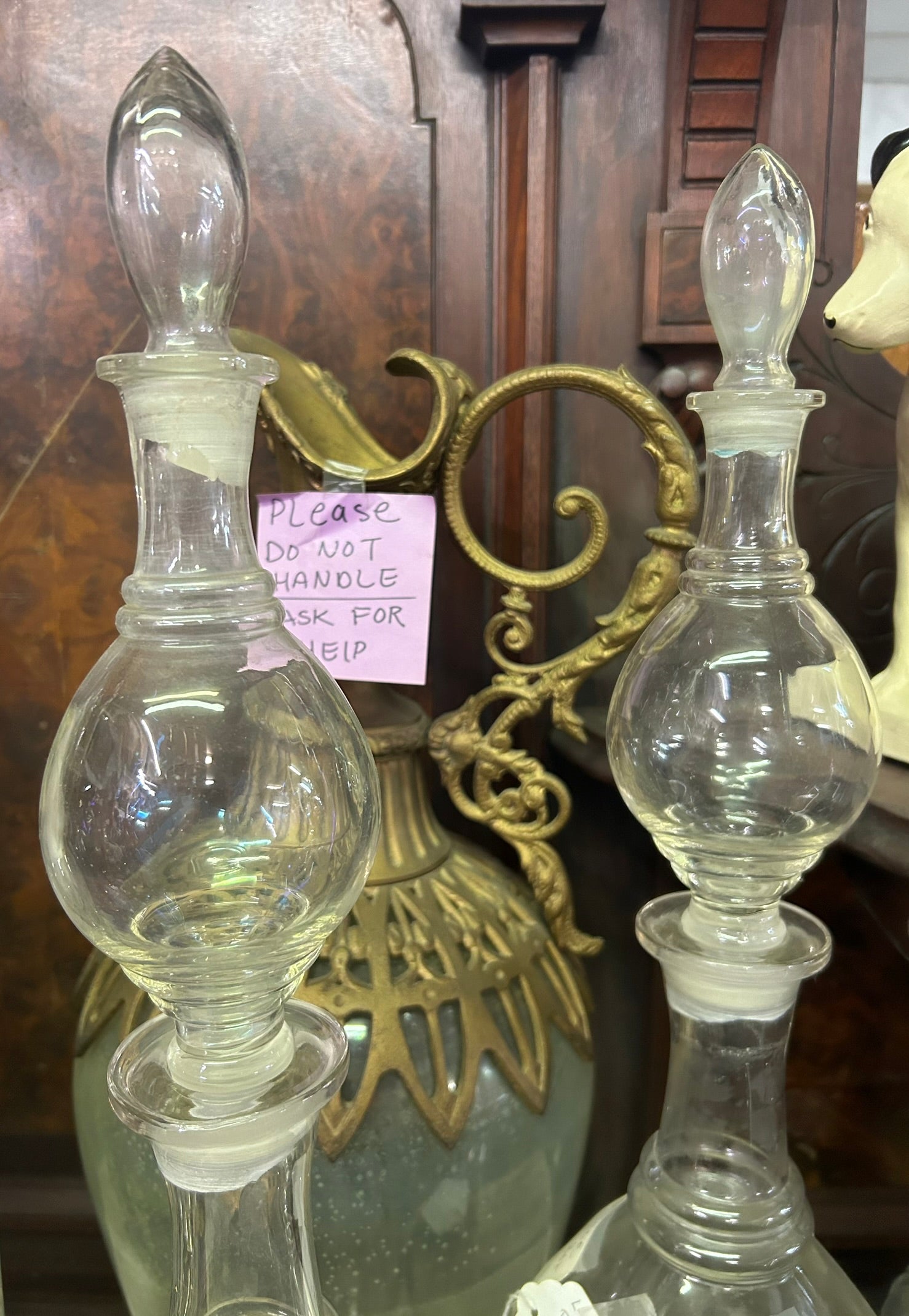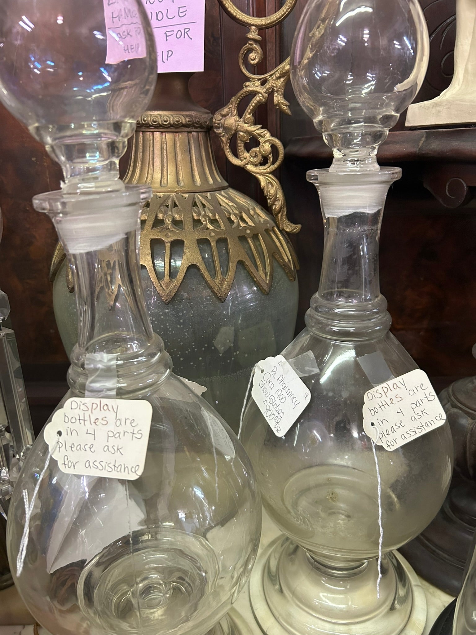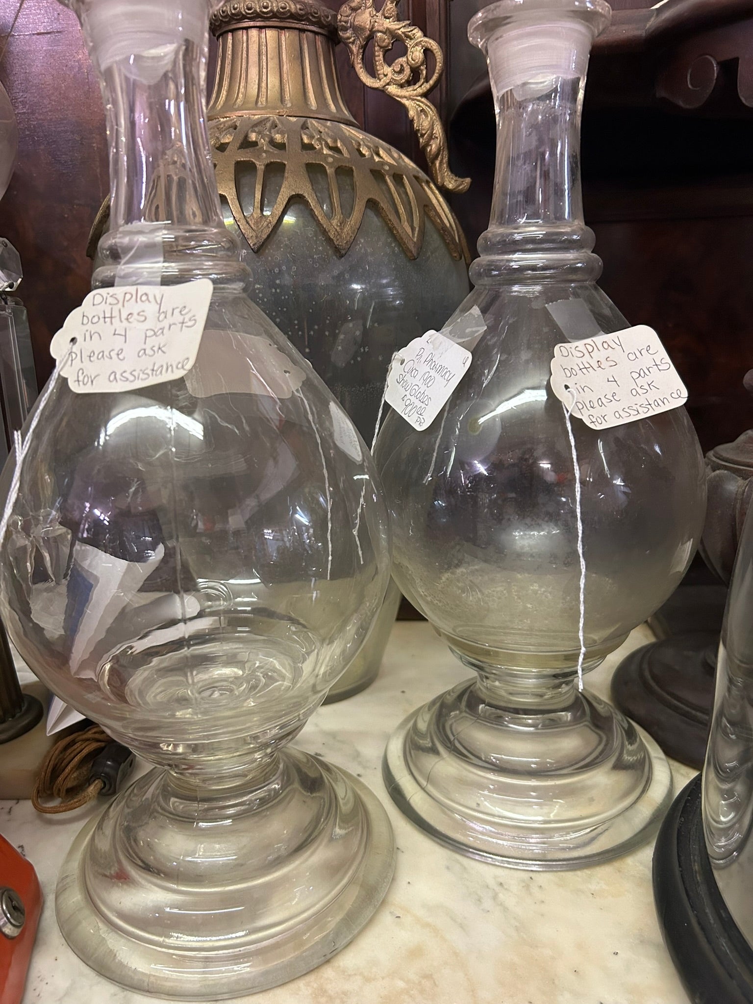 ANTIQUE DRUG STORE LARGE PAIR OF GLASS DISPLAY BOTTLES 26" TALL. CALL OR TEXT FOR MORE INFORMATION