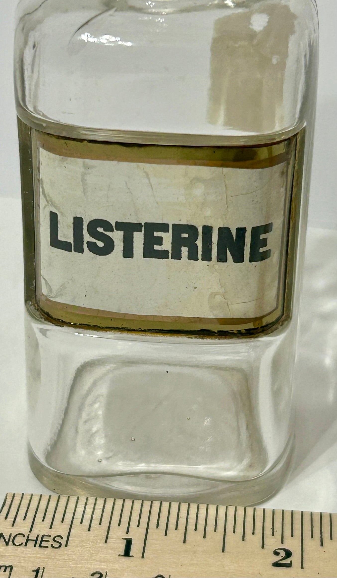 "LISTERINE" LABEL UNDER GLASS DRUGGIST BOTTLE 5 1/2" TALL. CALL OR TEXT FOR MORE INFORMATION