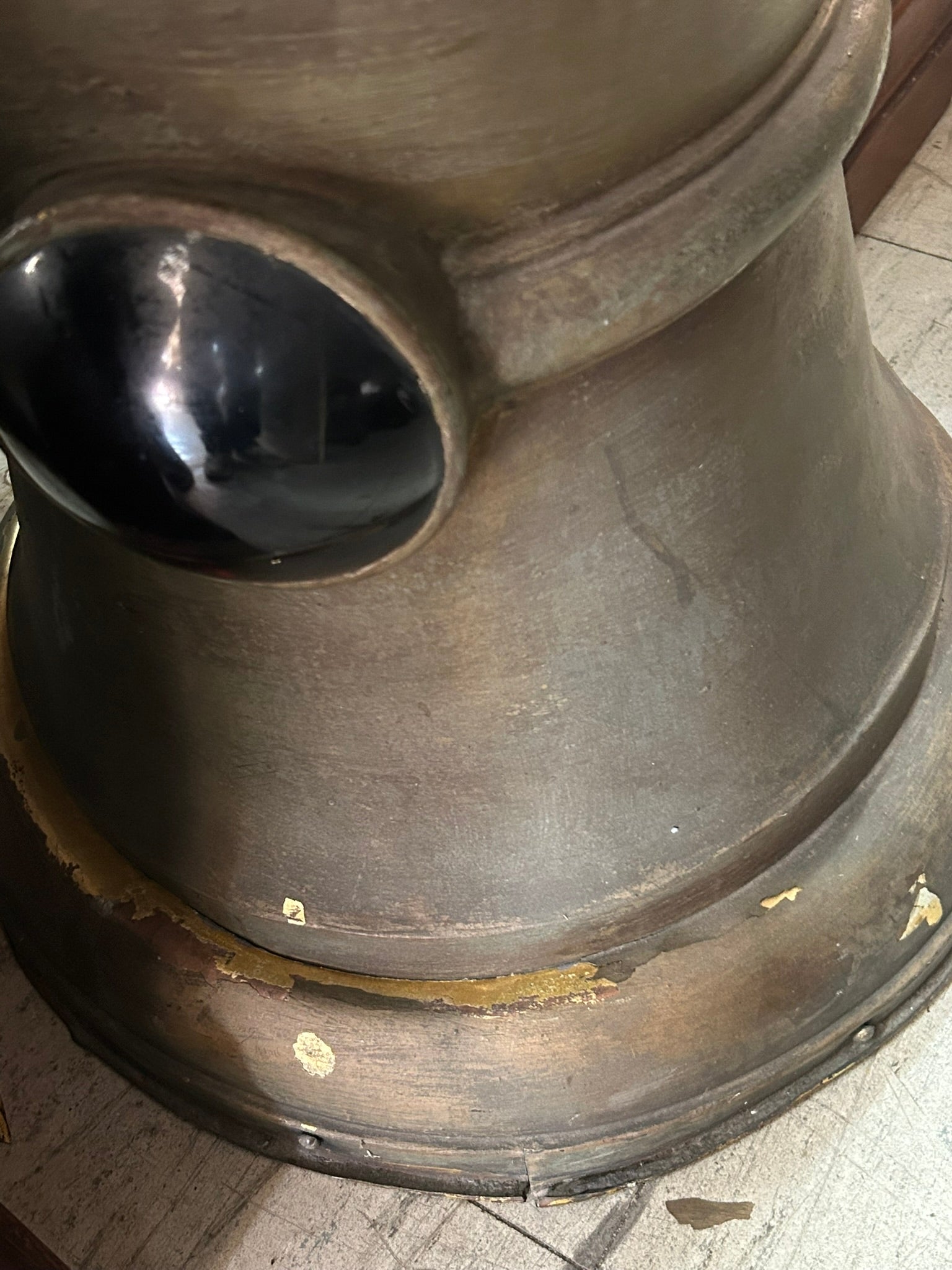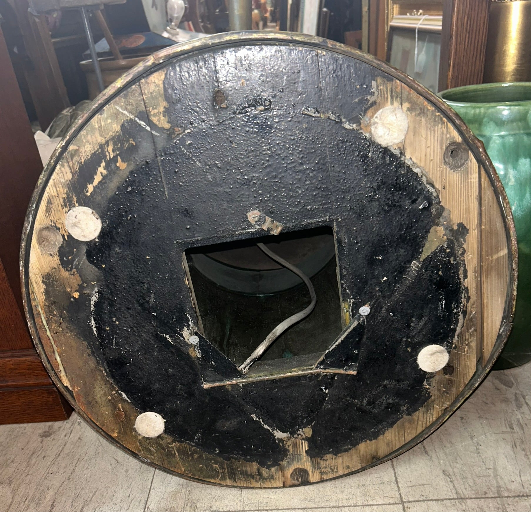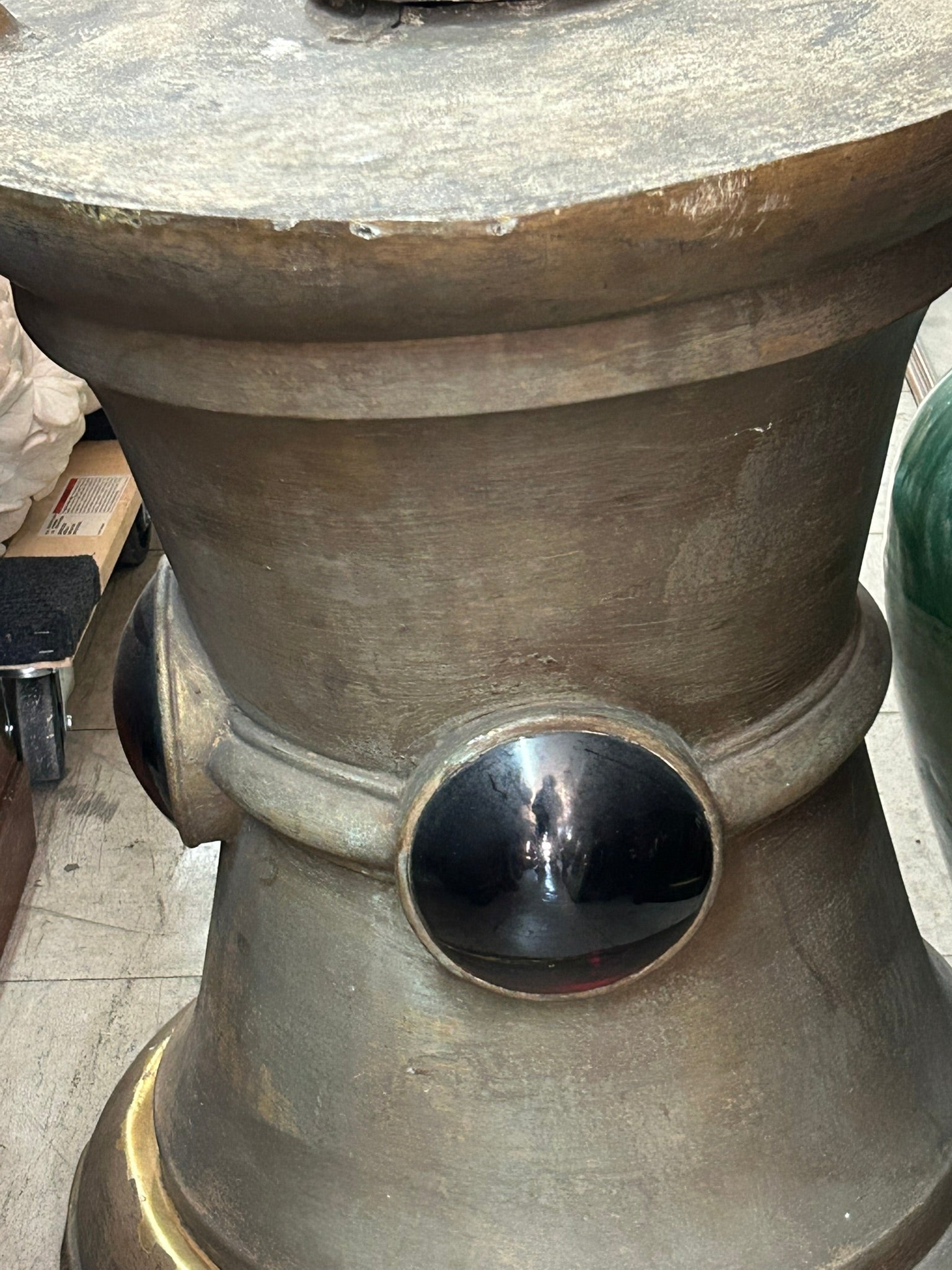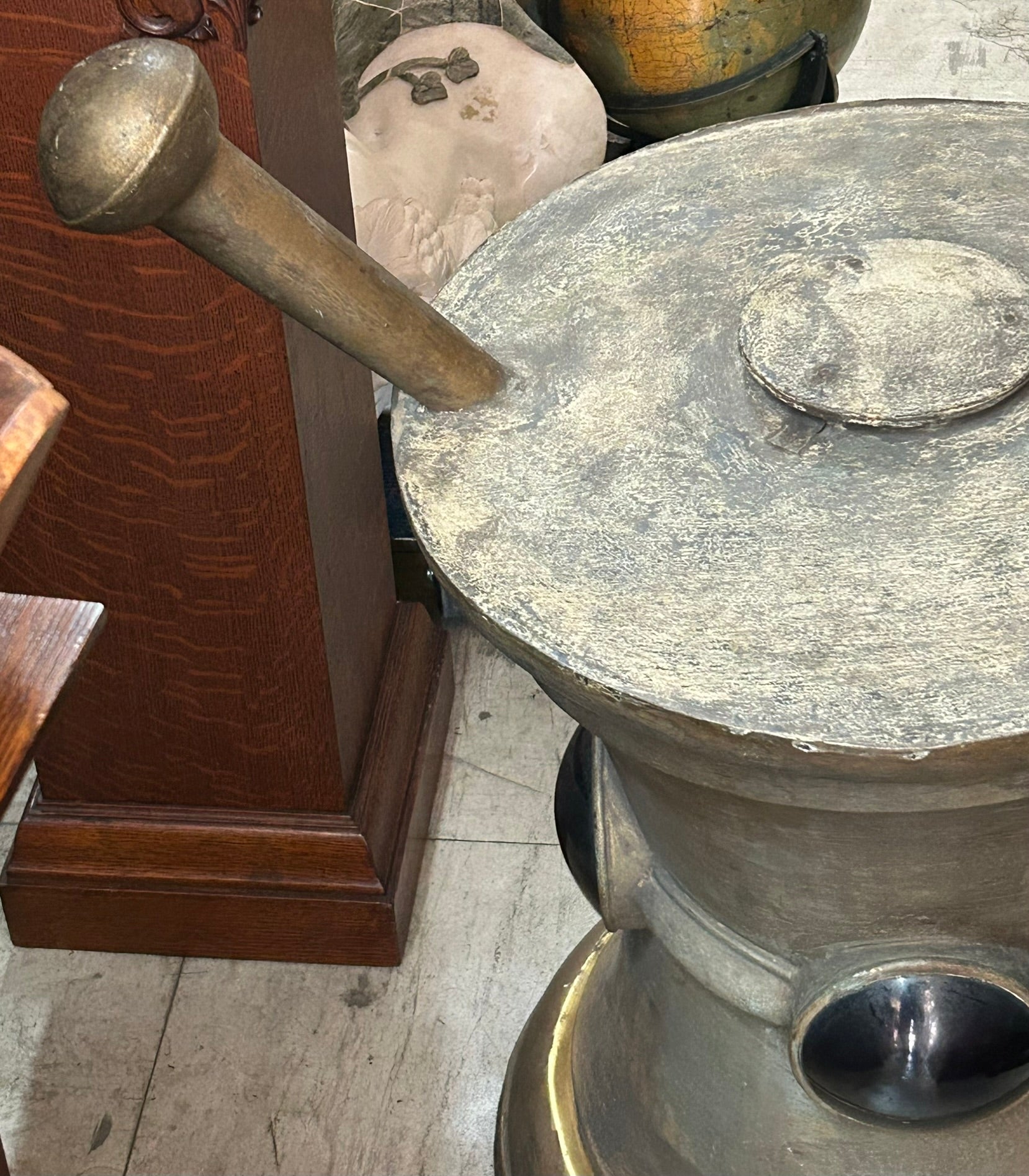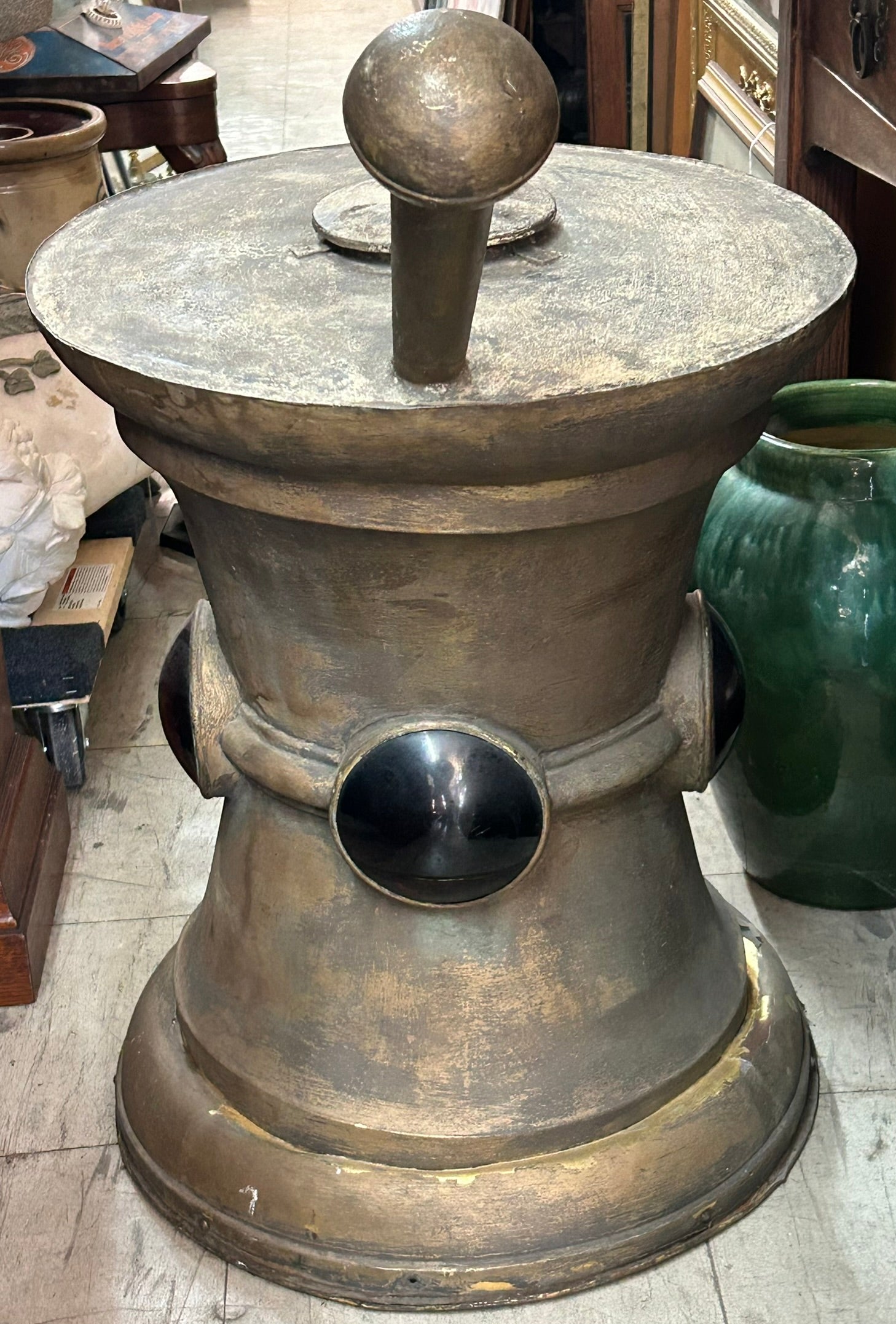 ANTIQUE DRUGGIST MOTAR AND PESTLE GILT TIN TRADE SIGN WITH COLORED GLASS LENSES 32" TALL, CORD ON INSIDE NEEDS TO BE REPLACED TO LIGHT UP LENSES. CALL OR TEXT FOR MORE INFORMATION