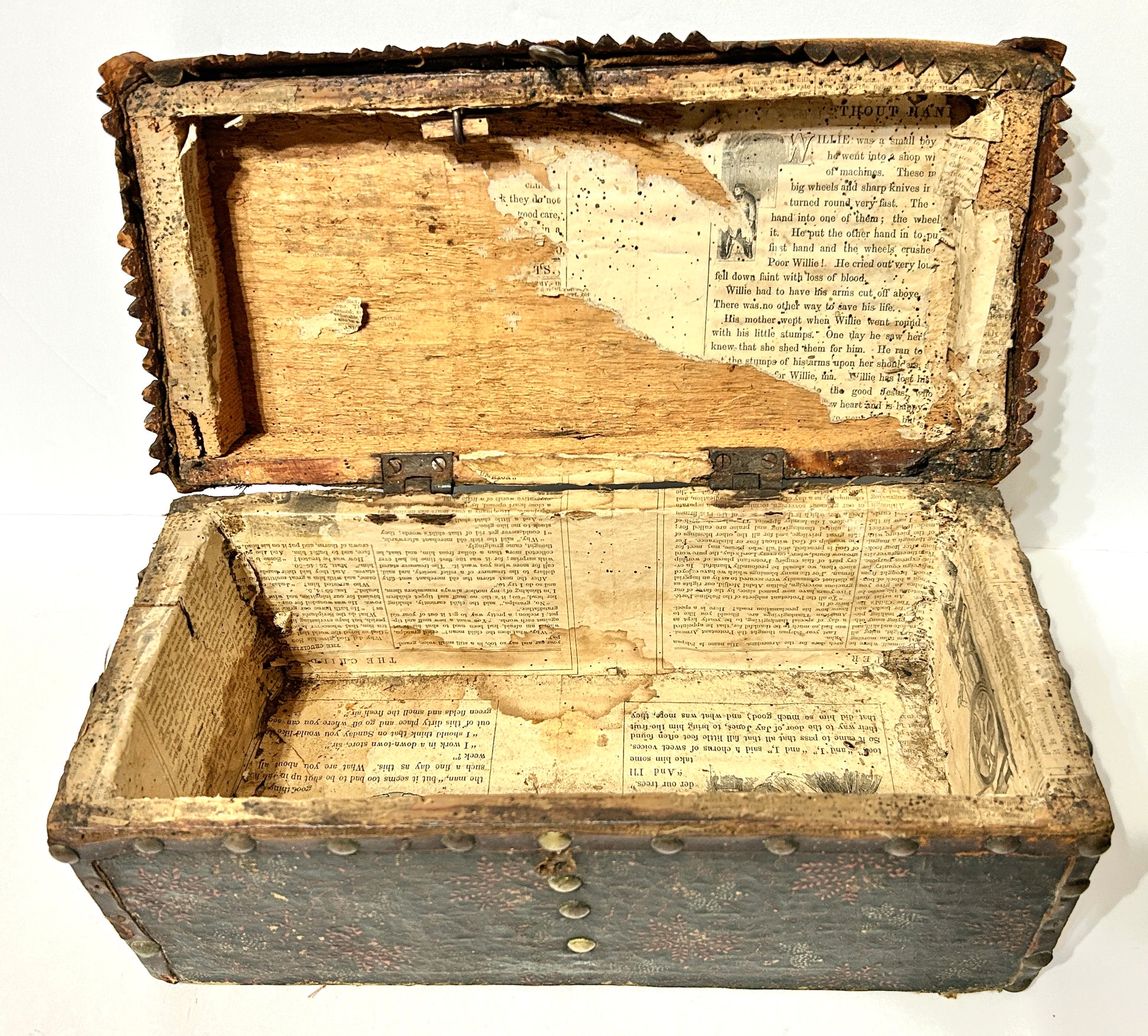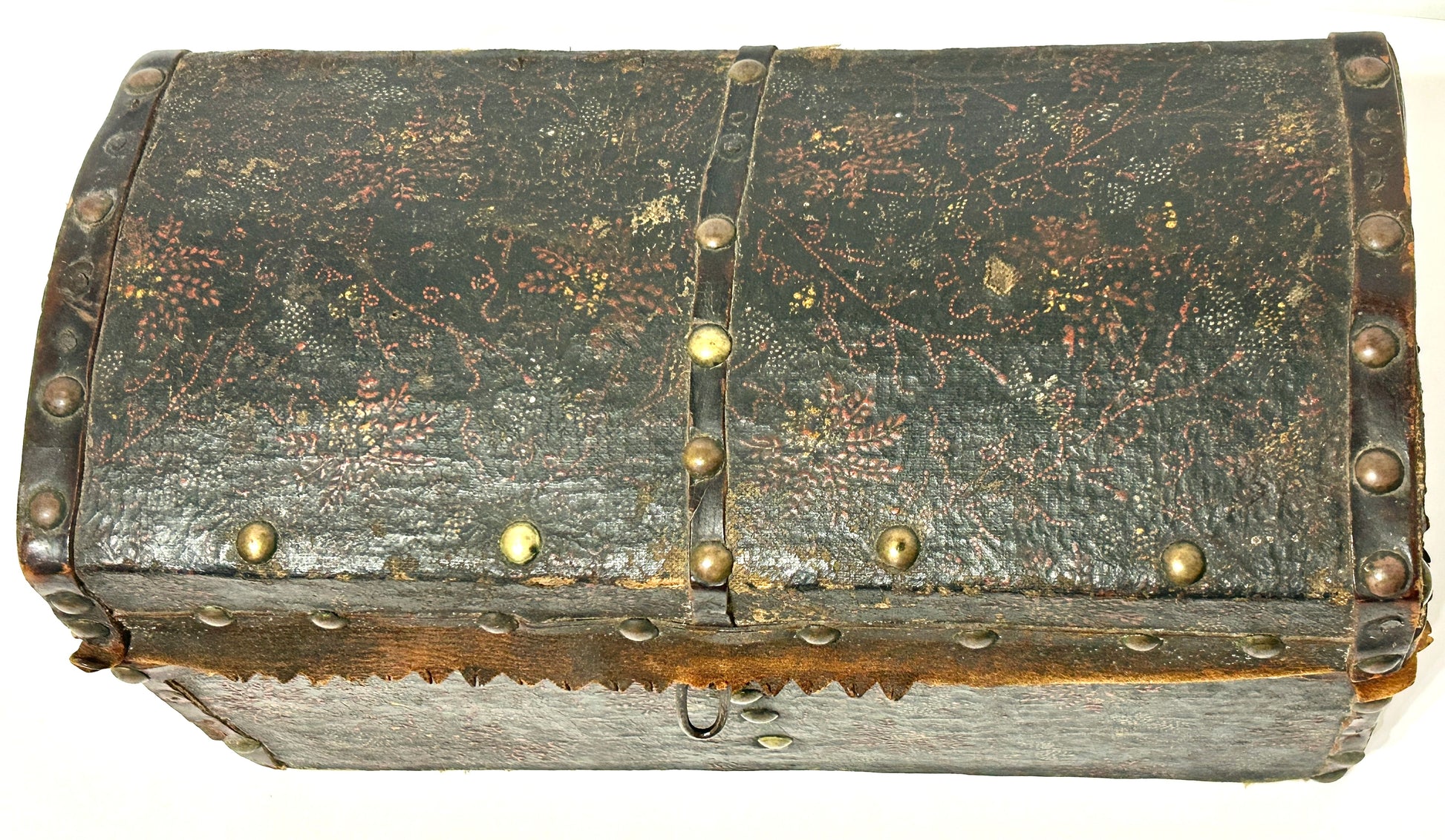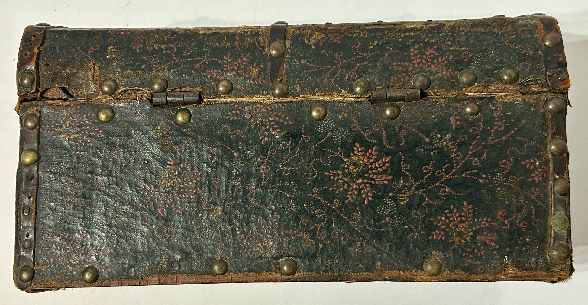 ANTIQUE EARLY LEATHER SMALL TRUNK WITH SMALL FLORAL PAINTED DESIGN 12" LONG X 6" DEEP X 6 1/4" TALL. SHIPPING IS EXTRA SO CALL OR TEXT TO FIND OUT HOW MUCH SHIPPING WII COST