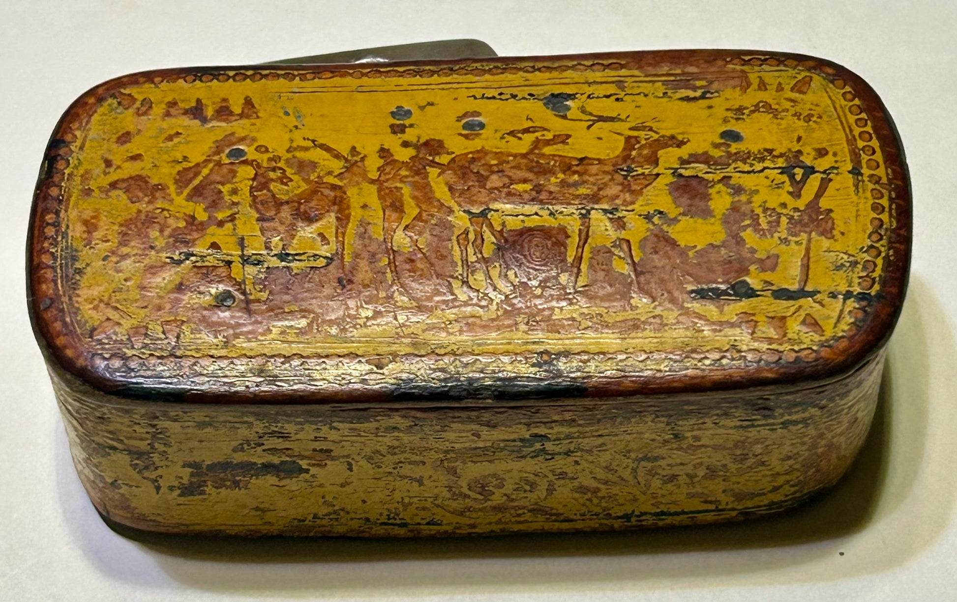ANTIQUE EARLY YELLOW PAINTED SNUFF BOX WITH DEER