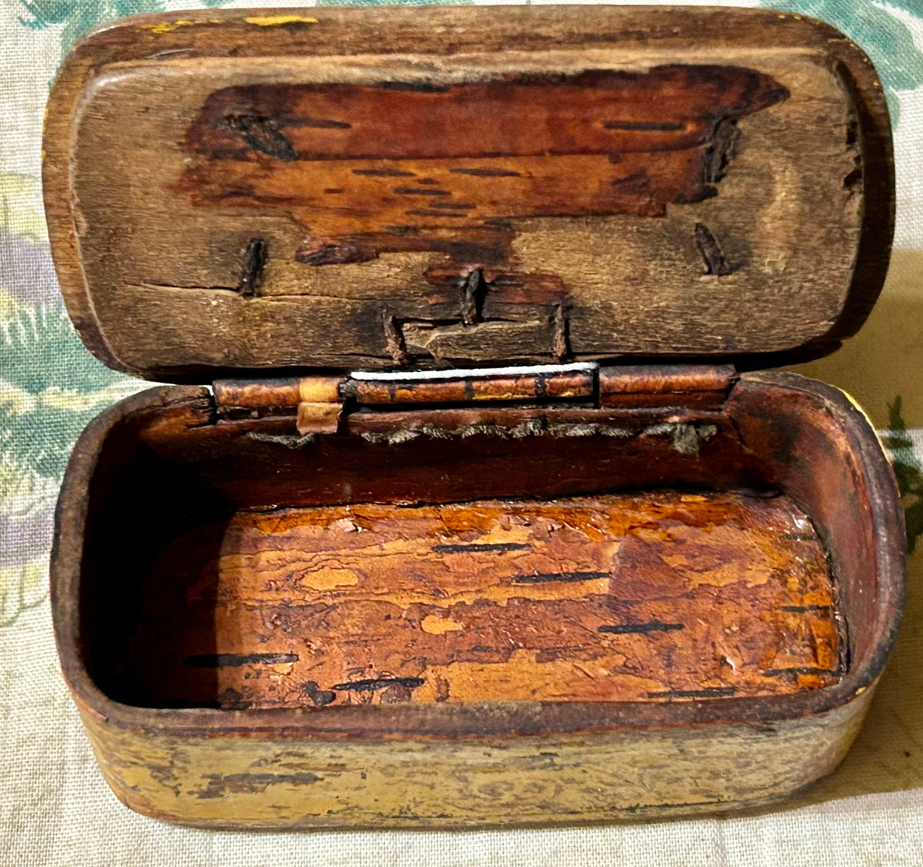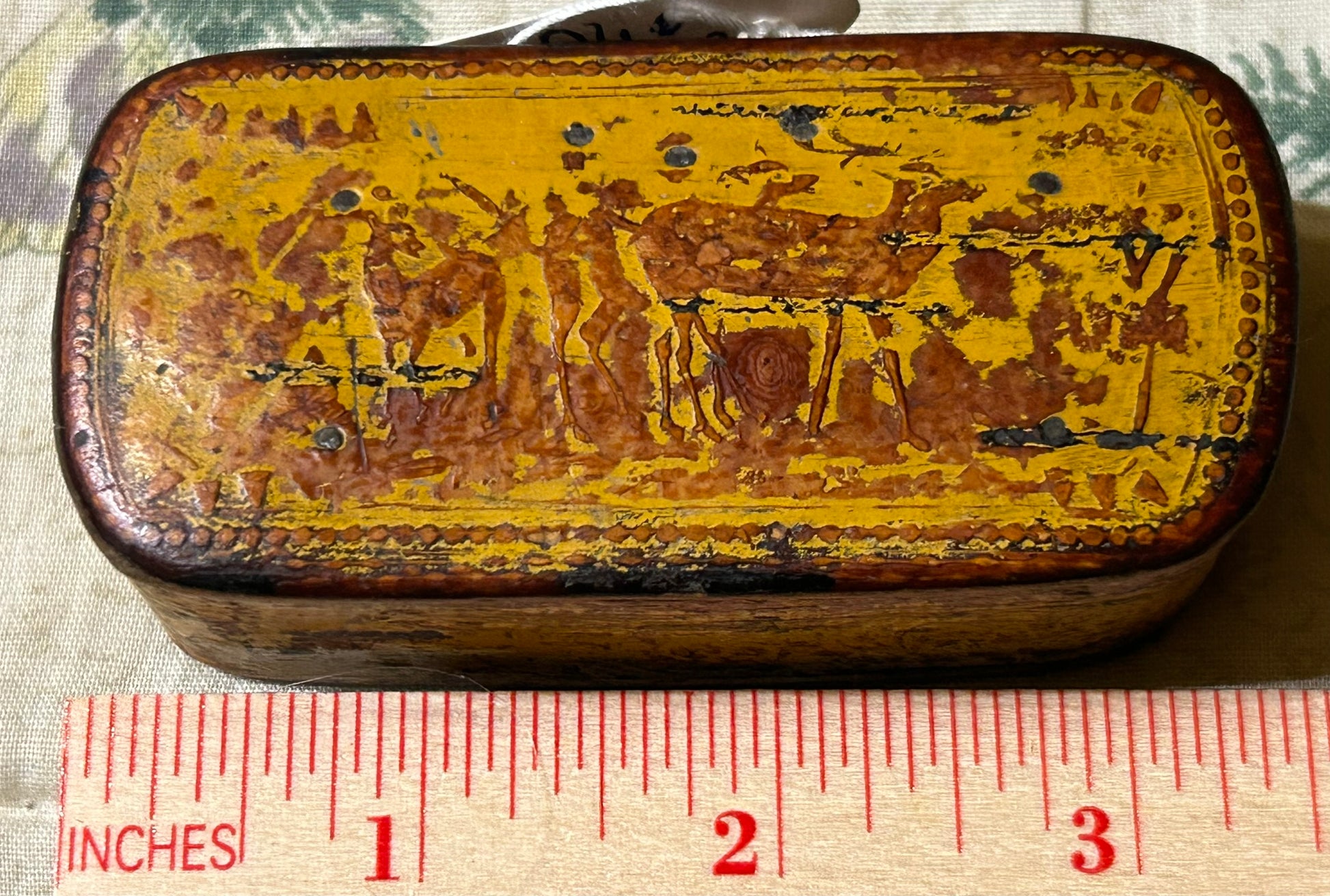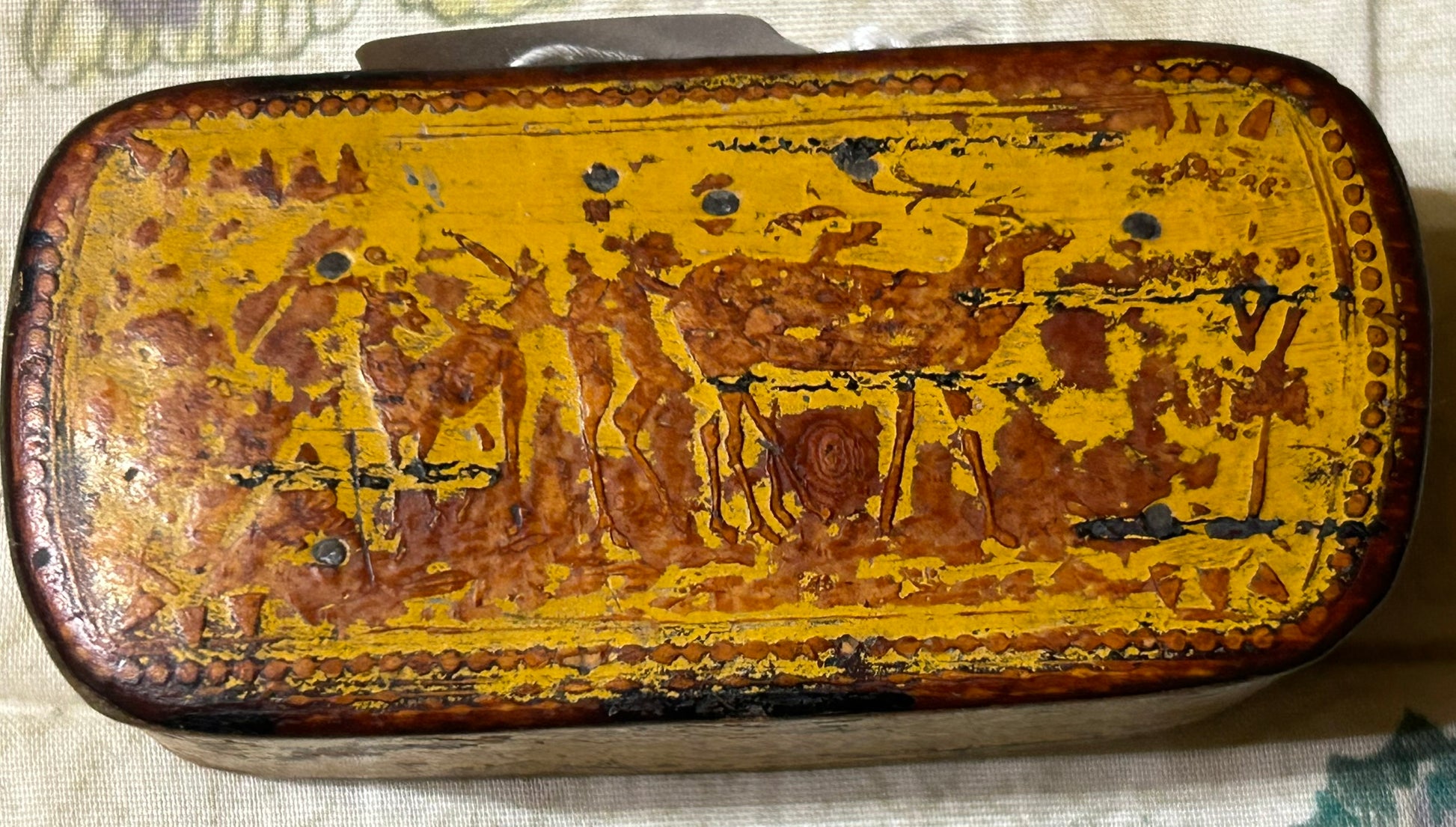 ANTIQUE EARLY YELLOW PAINTED SNUFF BOX WITH DEER. CALL OR TEXT FOR MORE INFORMATION