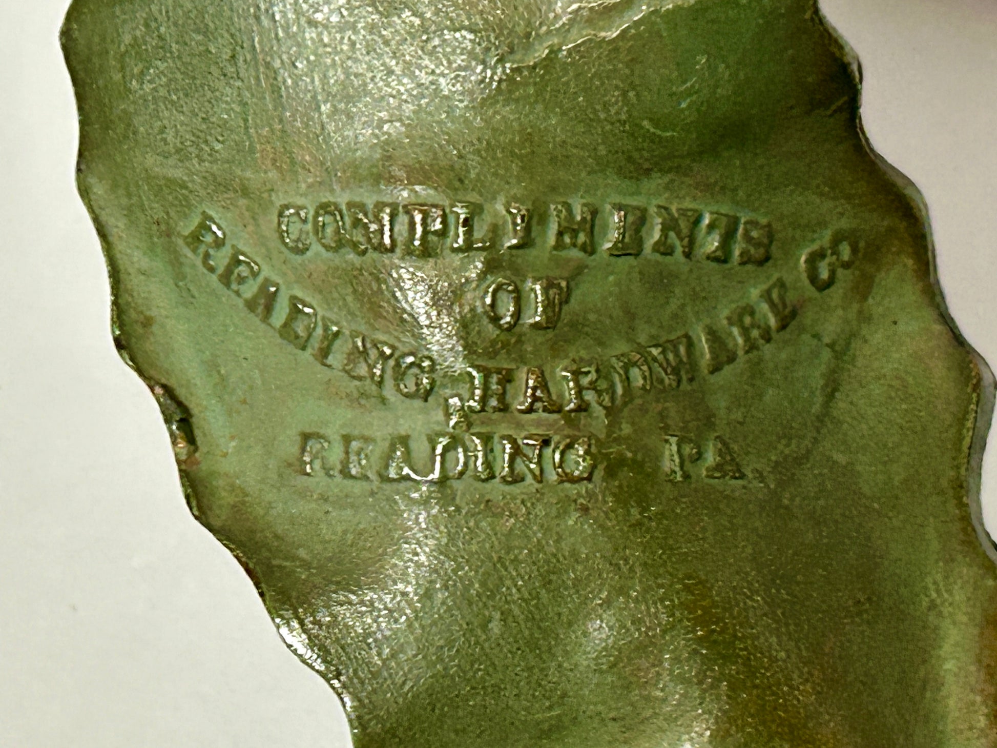 ANTIQUE FIGURAL WALNUTS SHAPE BRONZE INKWELL WITH BOTTOM ADVERTISING 9 1/2" WIDE X 7 1/2" DEEP. SHIPPING IS A EXTRA CHARGE SO CALL OR TEXT FOR COST