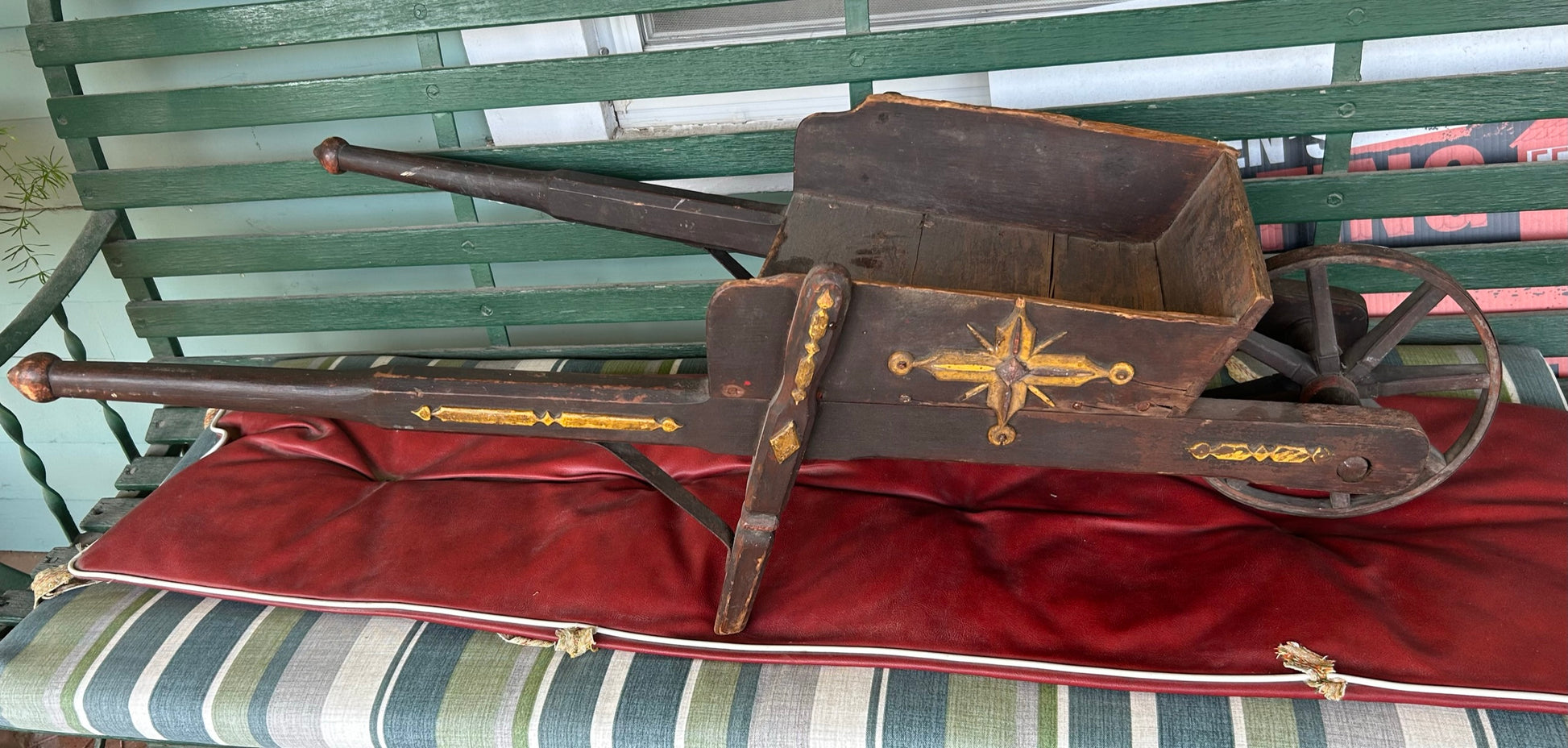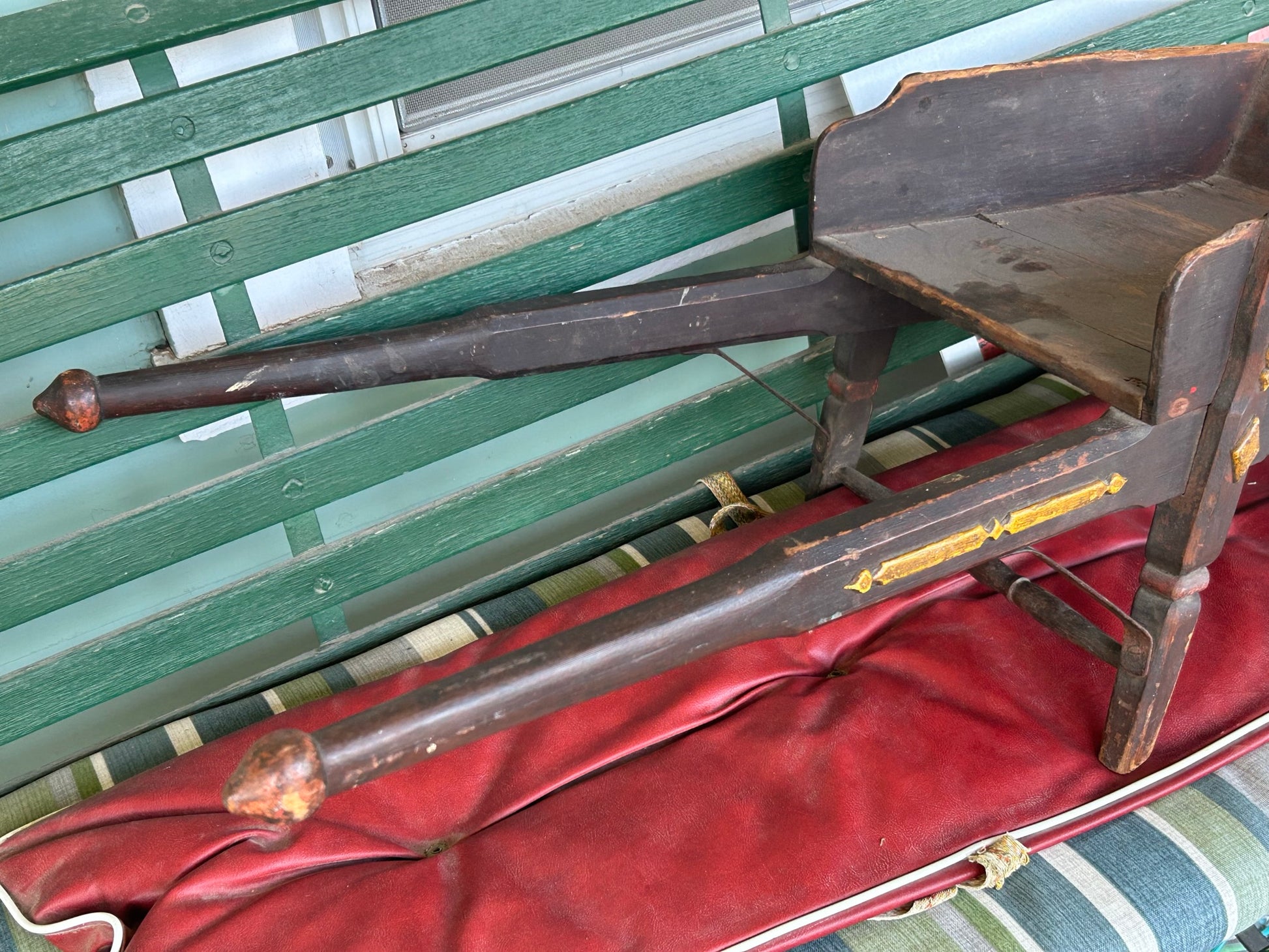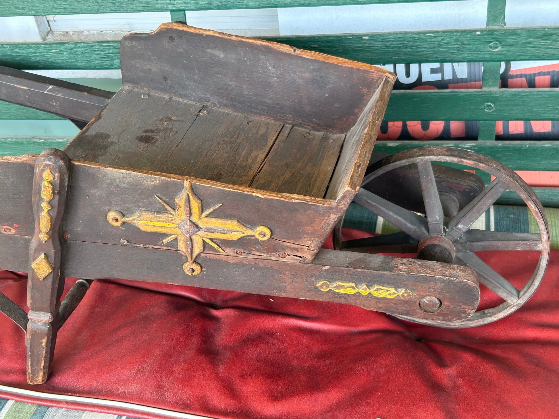 ANTIQUE SMALL FOLK ART WHEEL BARROW WITH APPLIED CARVING 27" LONG. CALL, TEXT, OR E-MAIL FOR MORE INFORMATION