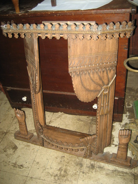 ANTIQUE FOLK ART CARVED WOOD HANGING SHELF WITH CURTAINS AND HANDS 32" TALL. CALL, TEXT, OR E-MAIL FOR MORE INFORMATION