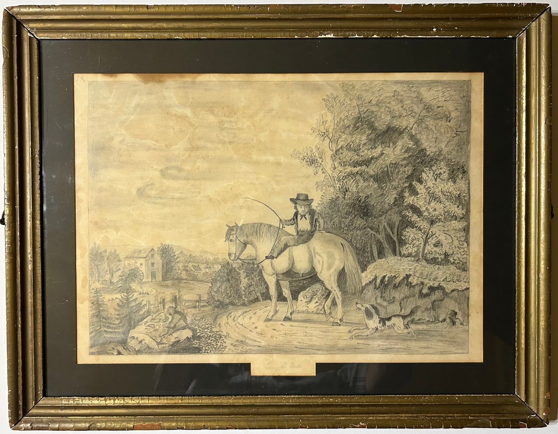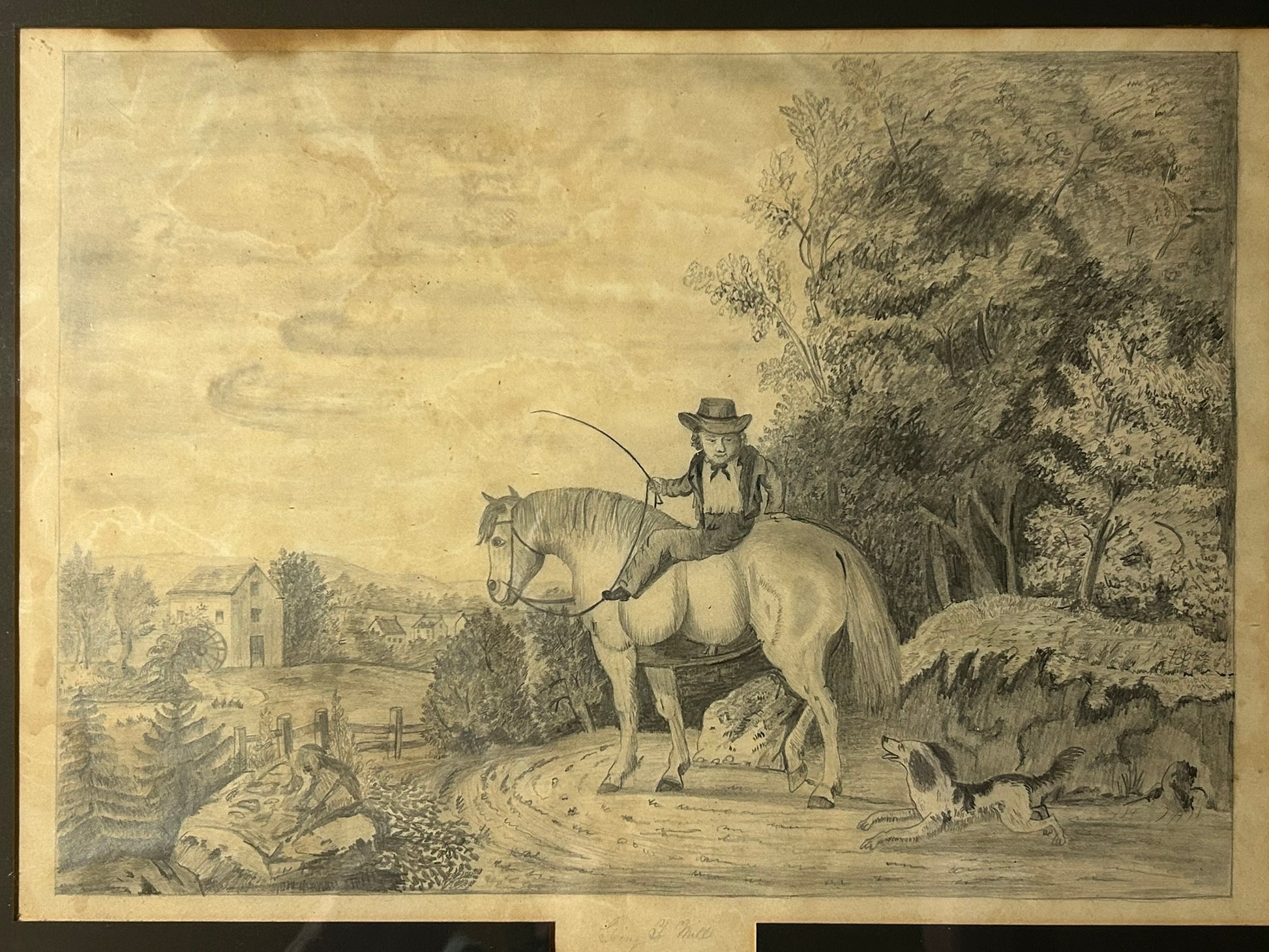 ANTIQUE FOLK ART DRAWING ON PAPER OF HORSE AND RIDER BY MILL TITLED " GOING TO MILL" 17" X 22" OVERALL. CALL OR TEXT FOR MORE INFORMATION