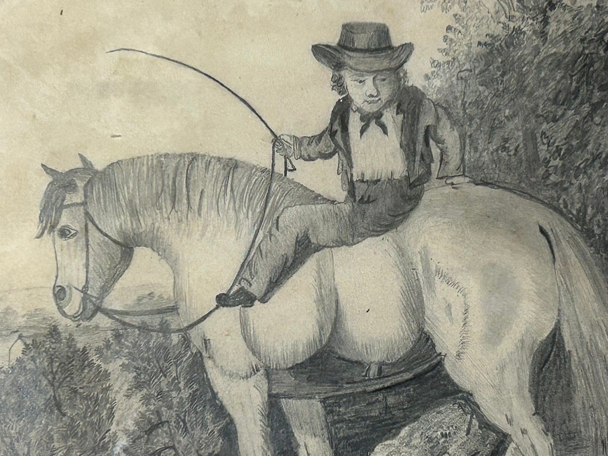 ANTIQUE FOLK ART DRAWING OF HORSE AND RIDER