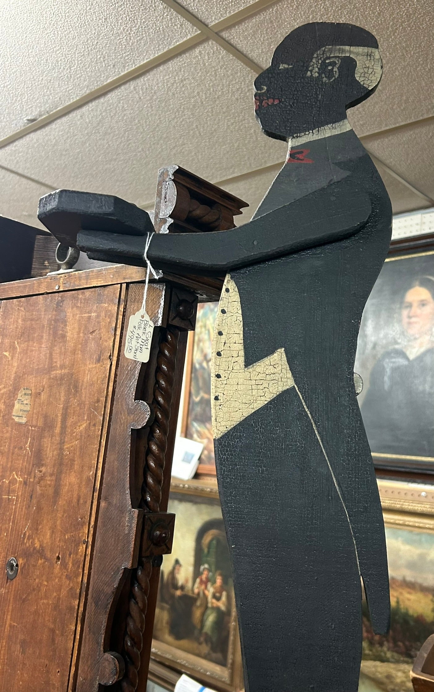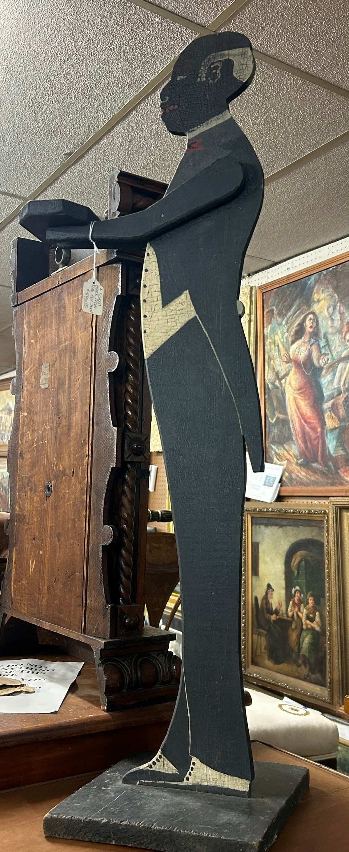 ANTIQUE FOLK ART MALE FIGURE WOODEN ASHTRAY HOLDER DOUBLE SIDED 35" TALL. CALL OR TEXT FOR MORE INFORMATION