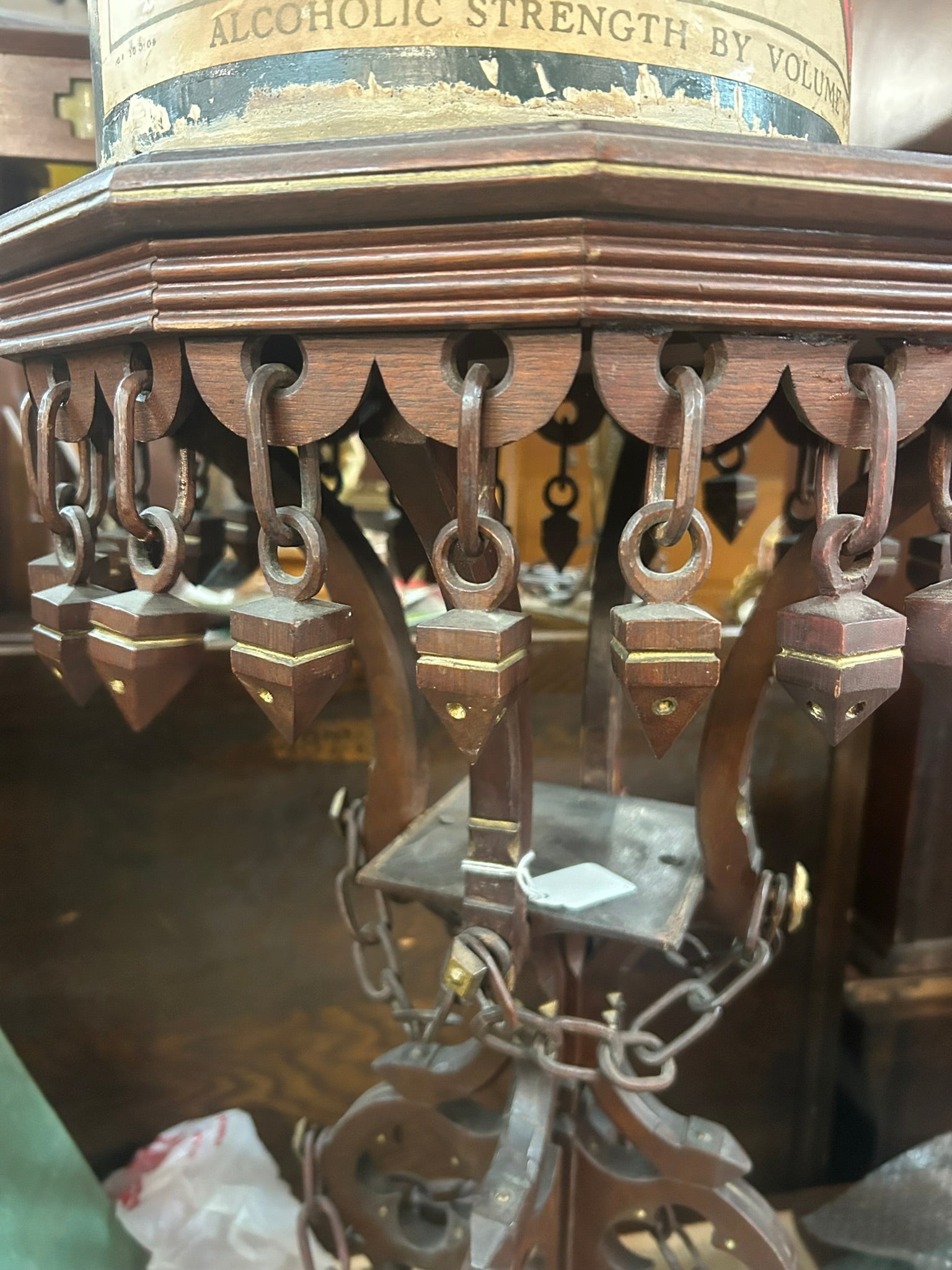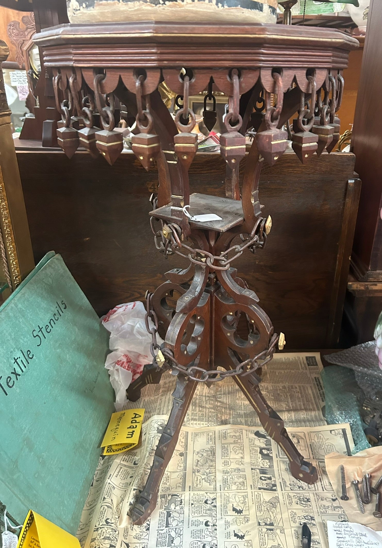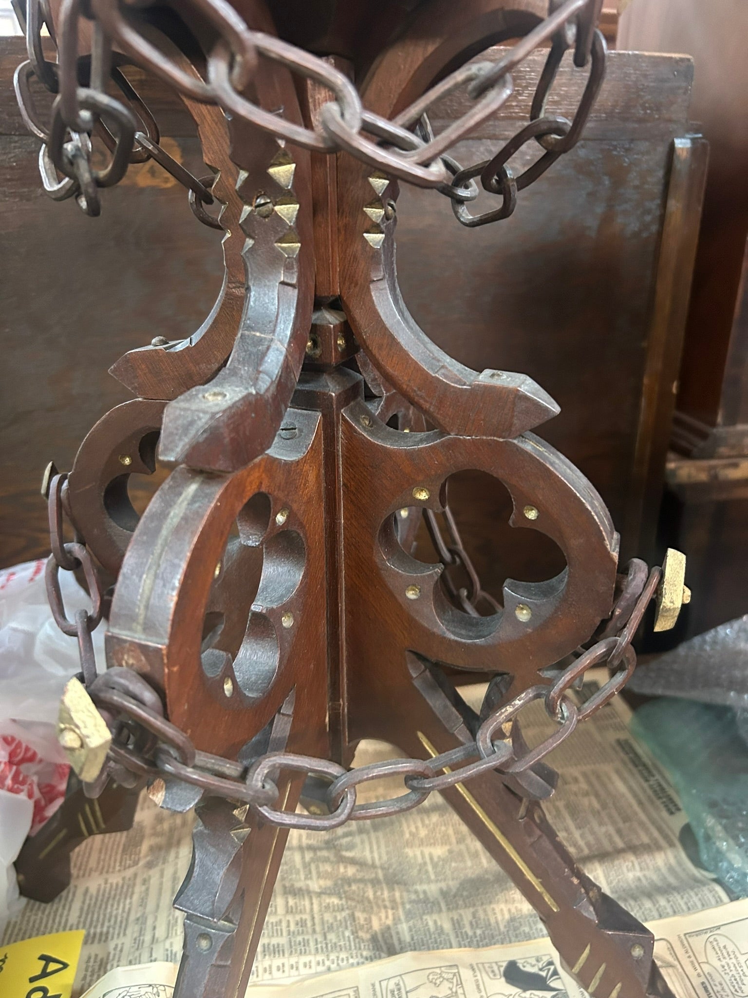 ANTIQUE FOLK ART PRISON MADE STAND WITH CARVED WOOD CHAINS AND DROPS 28" TALL. CALL, TEXT, OR E-MAIL FOR MORE INFORMATION