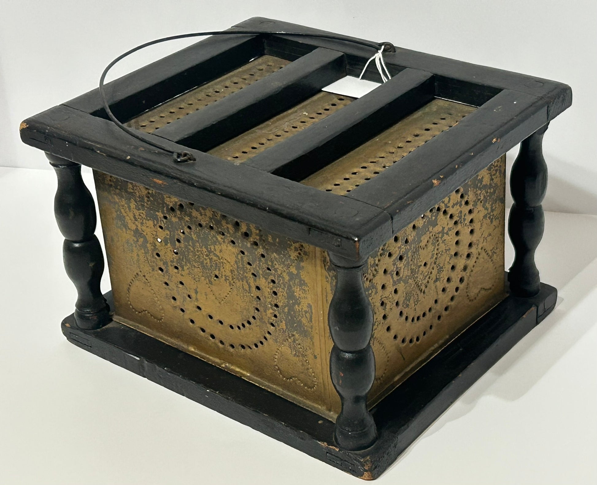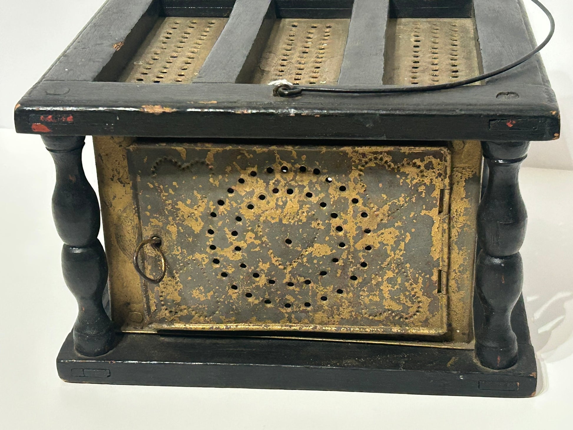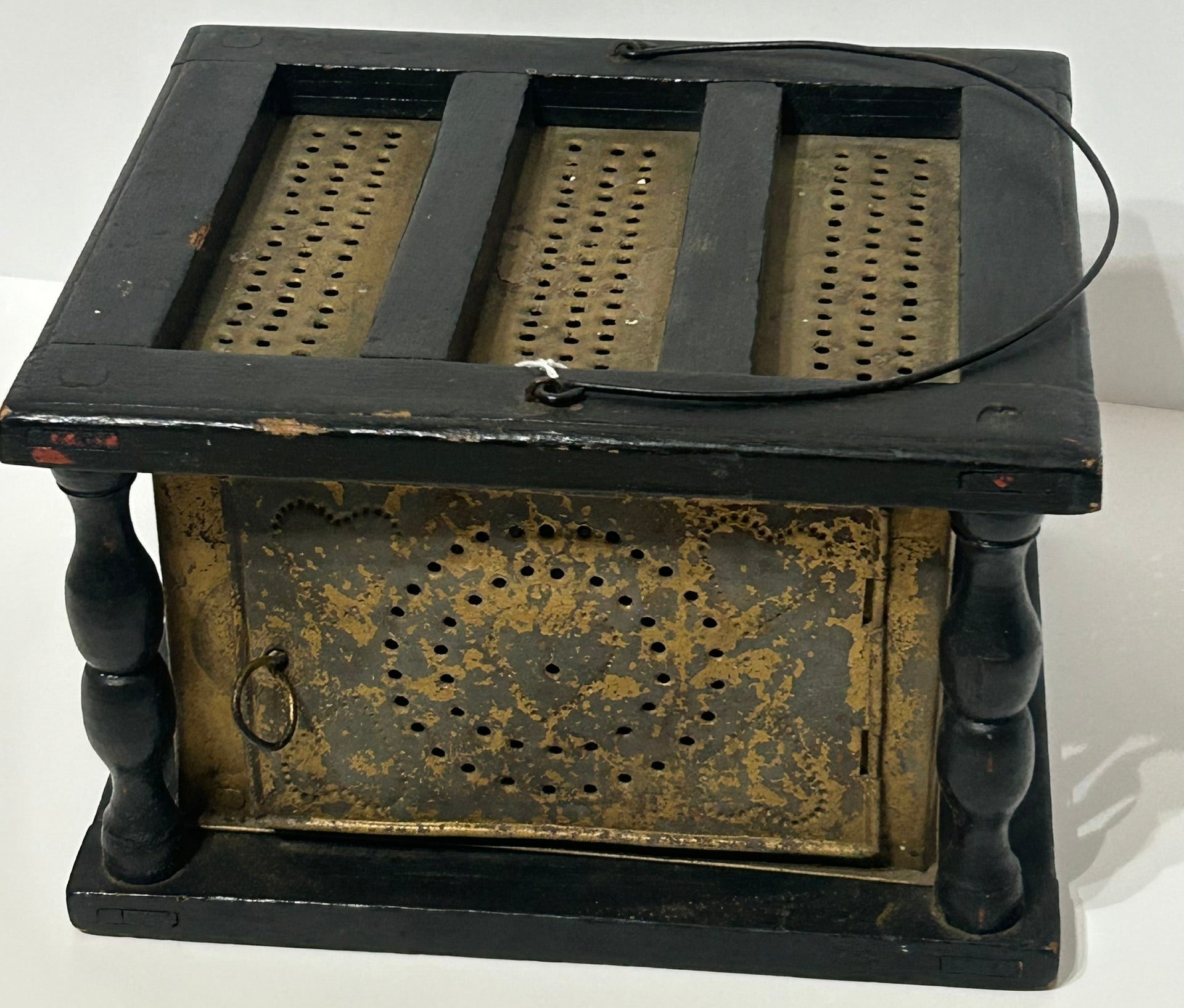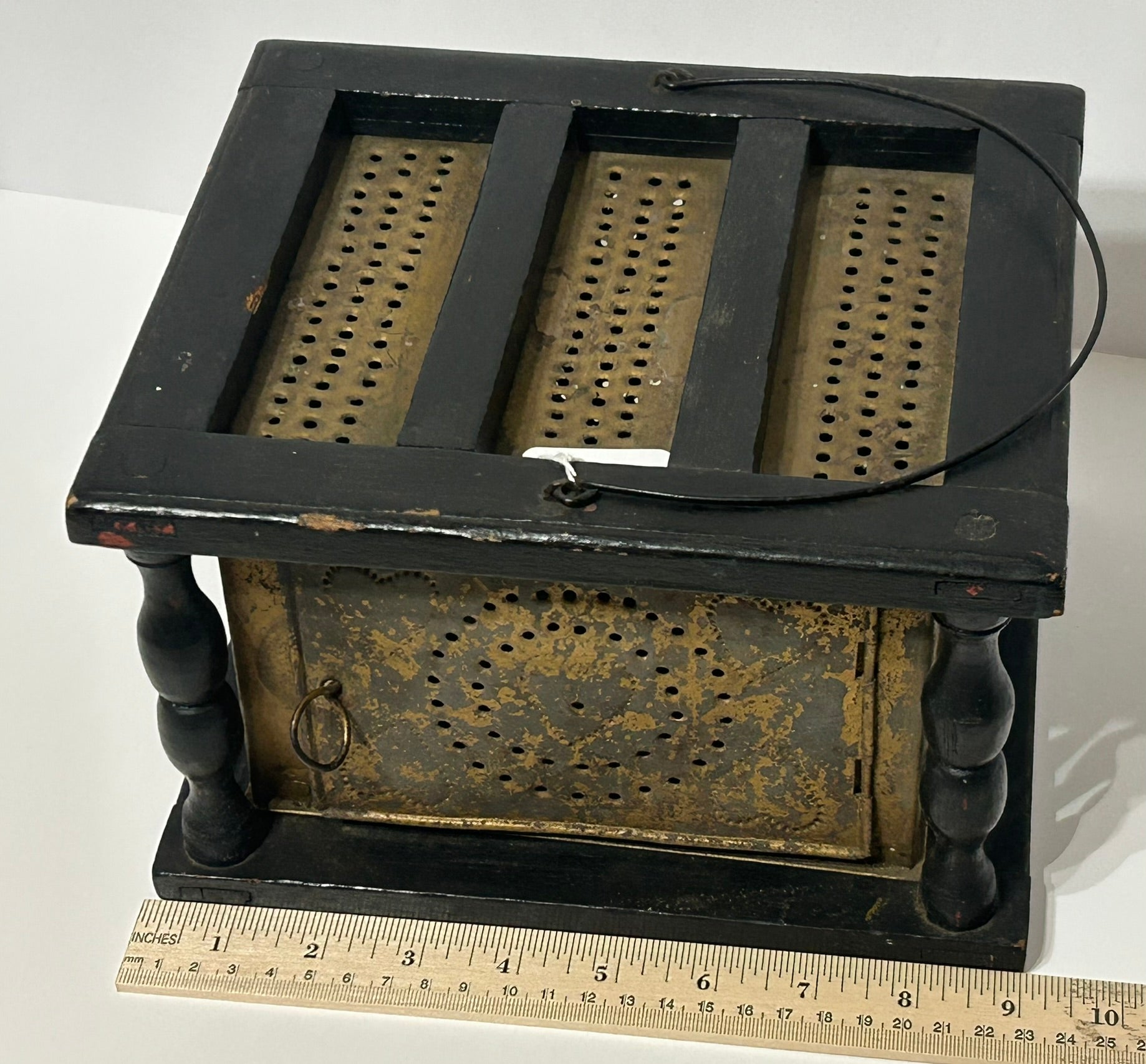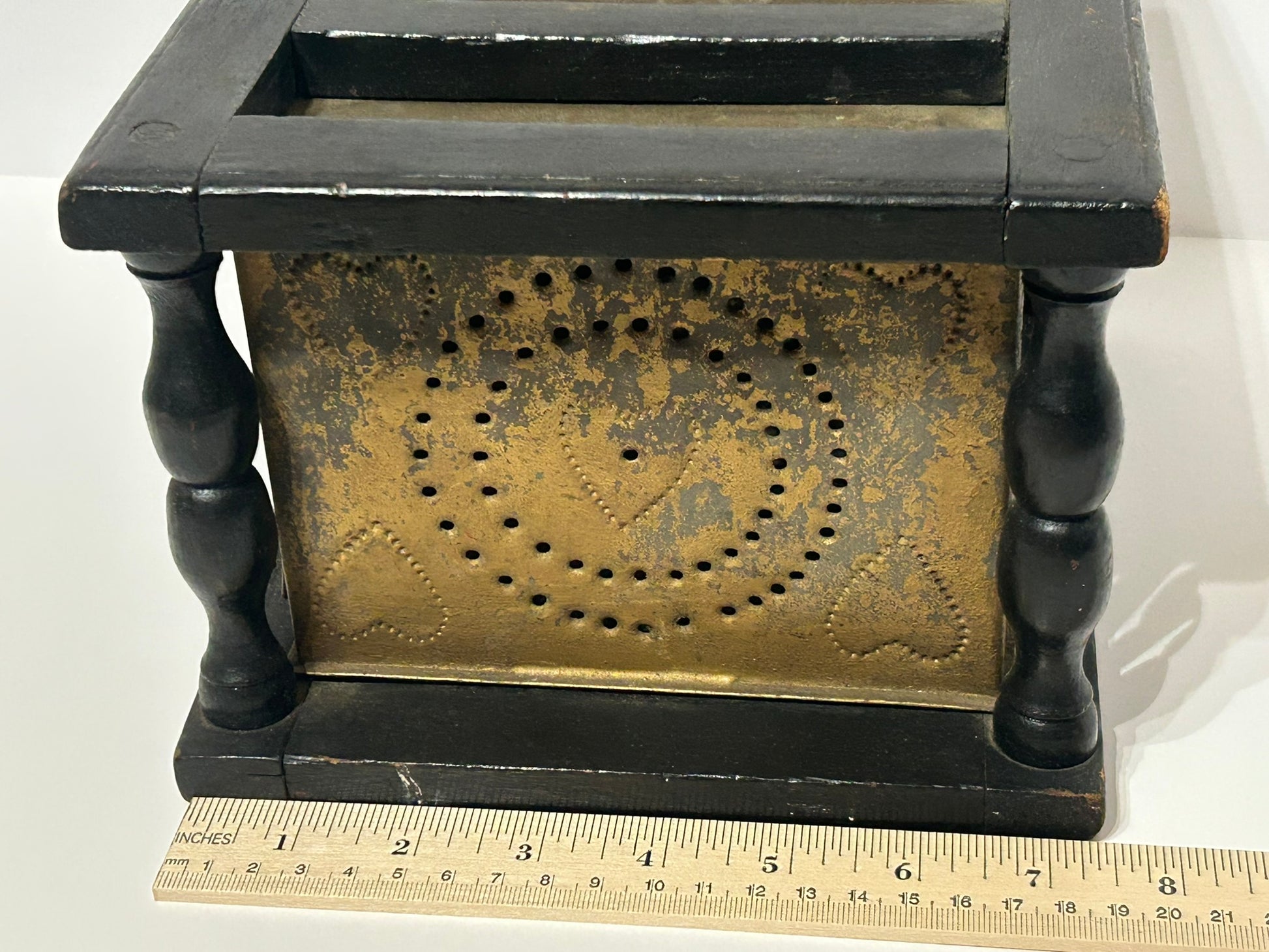 ANTIQUE PIERCED HEARTS DESIGNS TIN AND WOOD FOOTWARMER FROM 1800'S (NOTE NO COAL TRAY INSIDE) 9" X 7 3/4" X 6" TALL. CALL OR TEXT FOR MORE INFORMATION