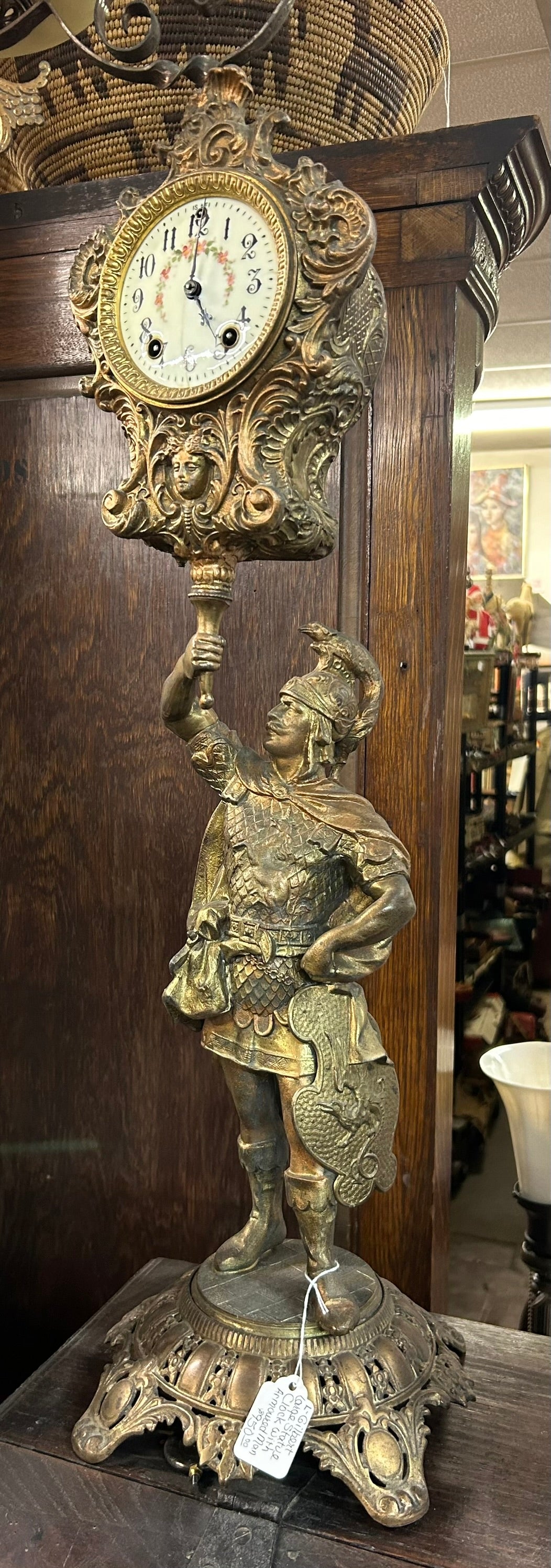 ANTIQUE GILBERT CLOCK CO. FIGURAL 27' TALL ARMOURED MAN CLOCK. CALL, TEXT, OR E-MAIL FOR MORE INFORMATION