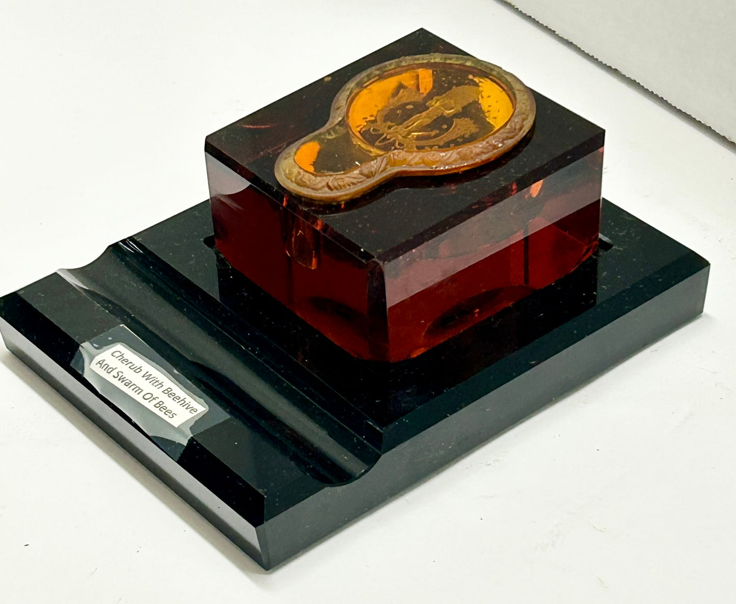 ANTIQUE GLASS INKWELL WITH ETCHED LID OF BEEHIVE IN AMBER, BLACK, & REDDISH GLASS. VERY HIGH QUALITY