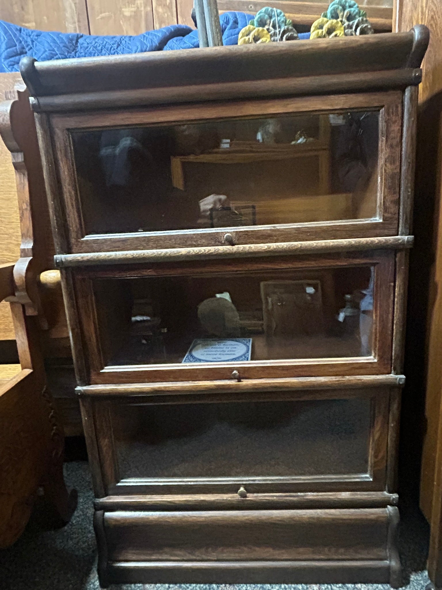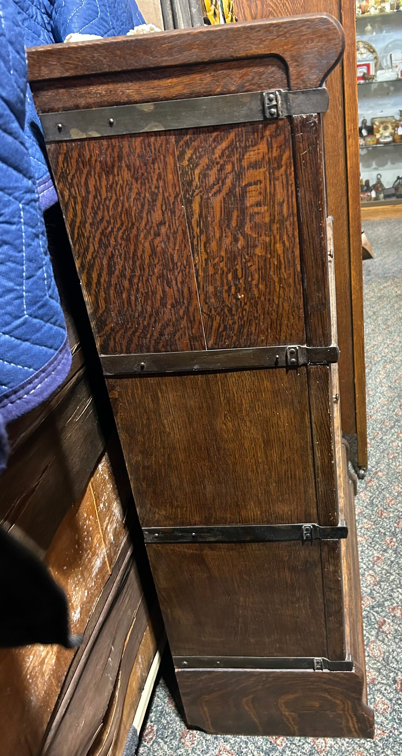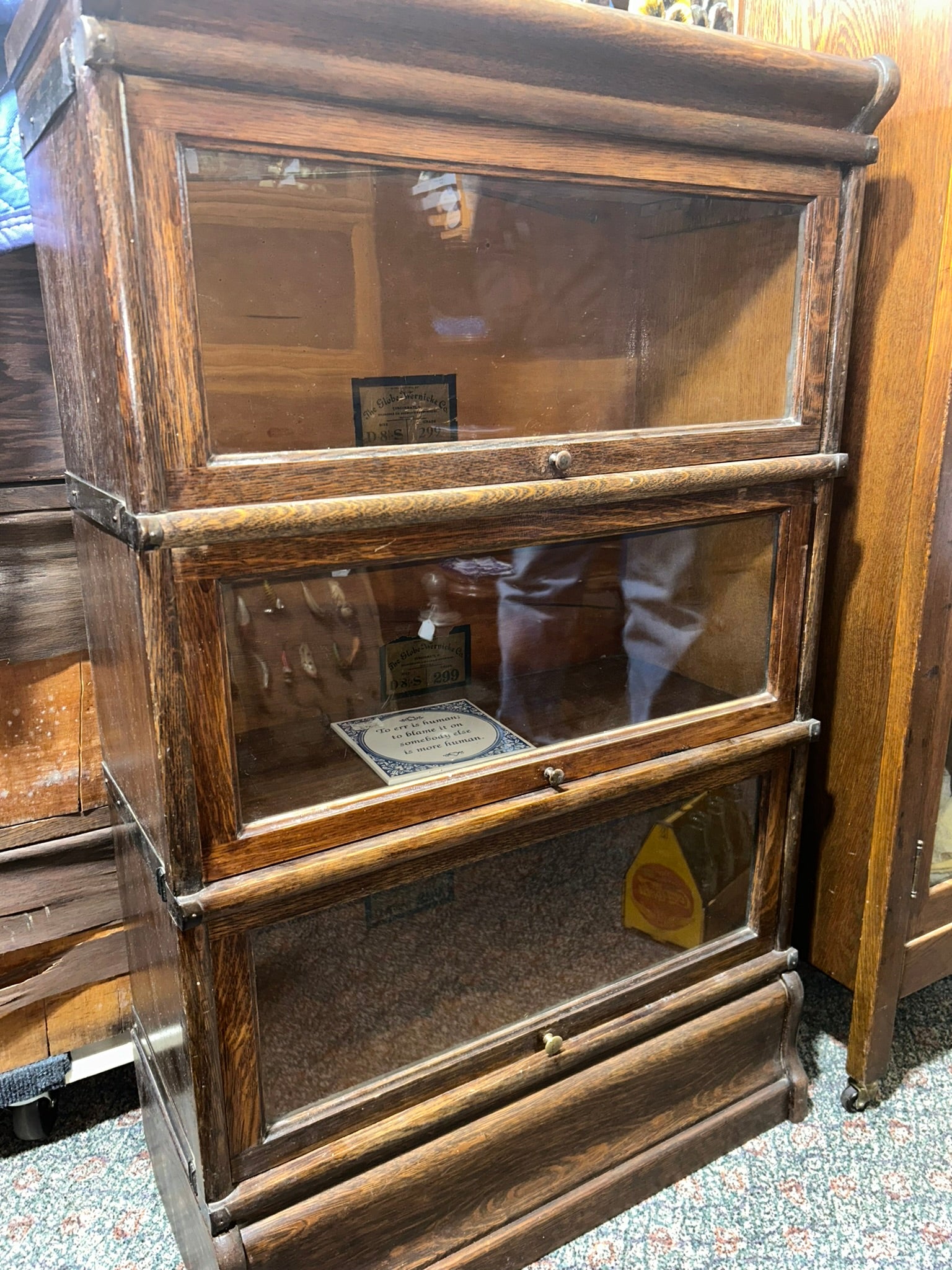 ANTIQUE GLOBE 3/4 SIZE OAK THREE STACK BARRISTER BOOKCASE 25 1/2" WIDE X 11" DEEP AND 41 1/2" TALL. CALL OR TEXT FOR MORE INFORMATION
