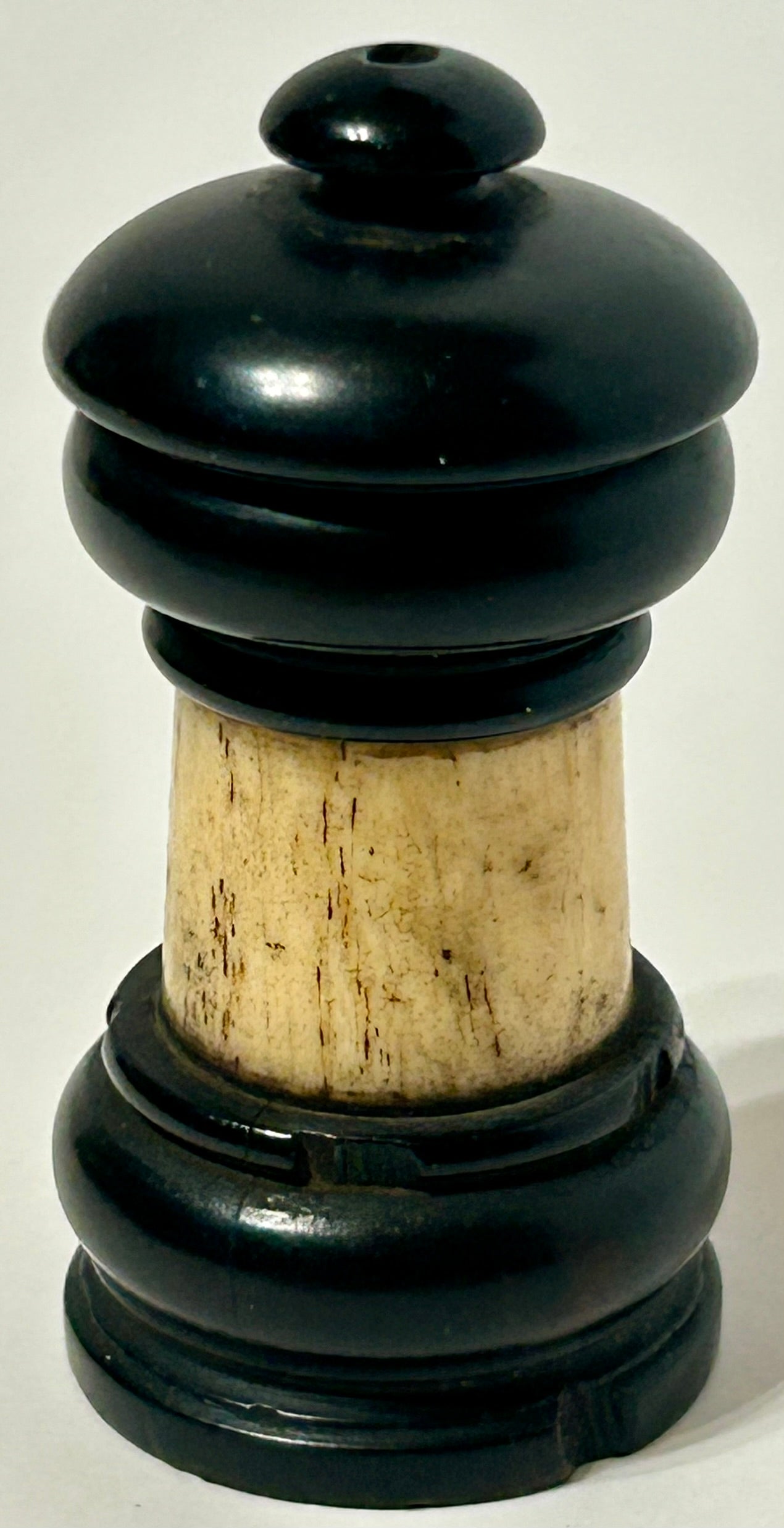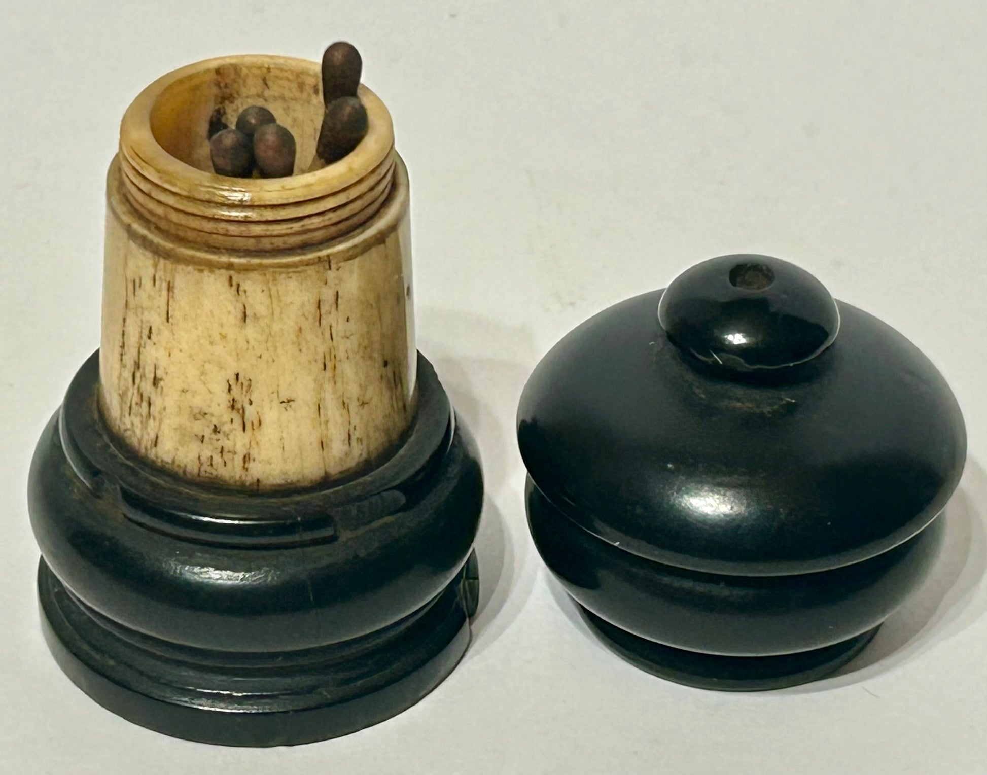 ANTIQUE GUTTA PERCHA AND BONE ROUND MATCH HOLDER 3" TALL. CALL OR TEXT FOR MORE INFORMATION