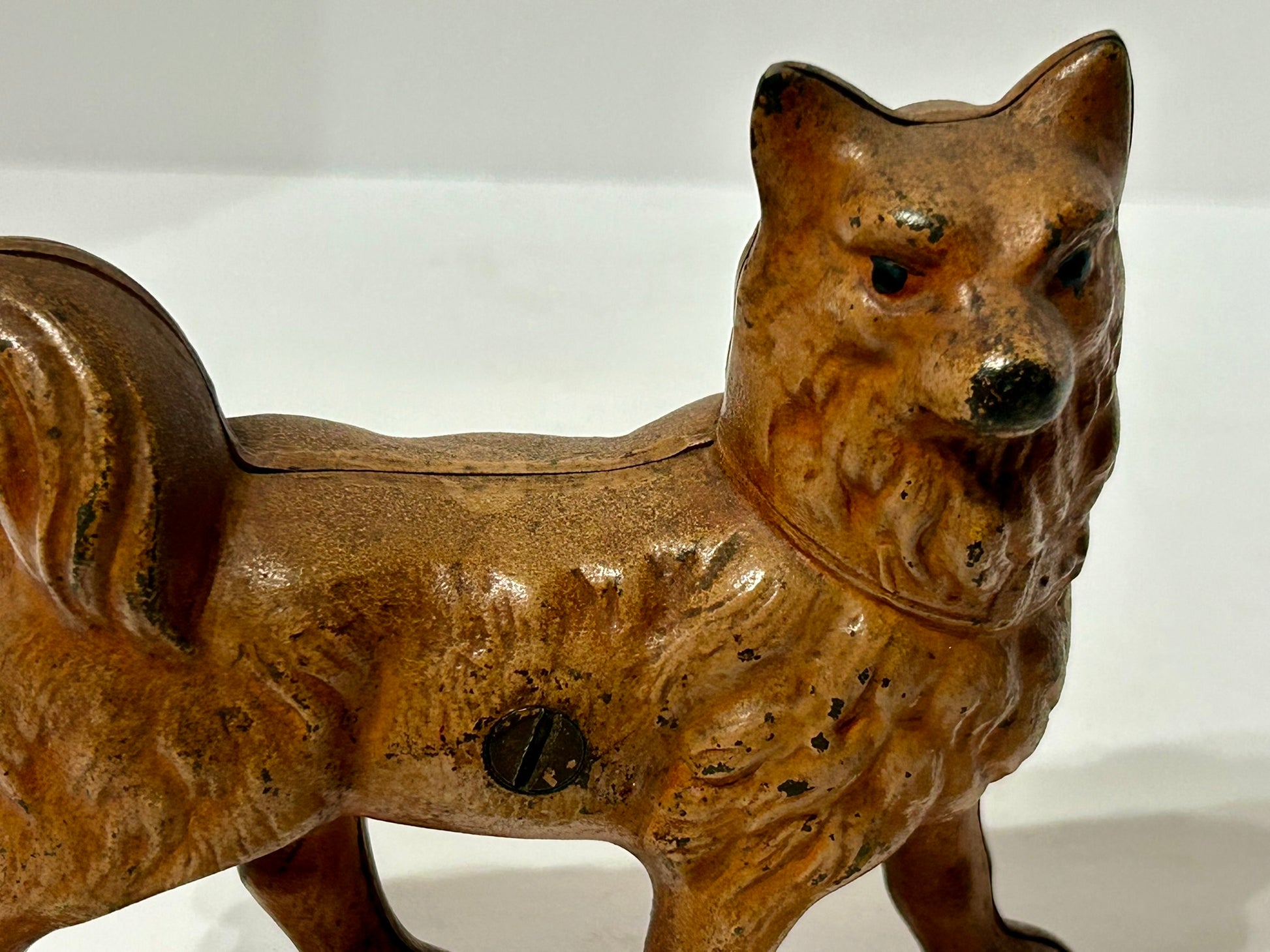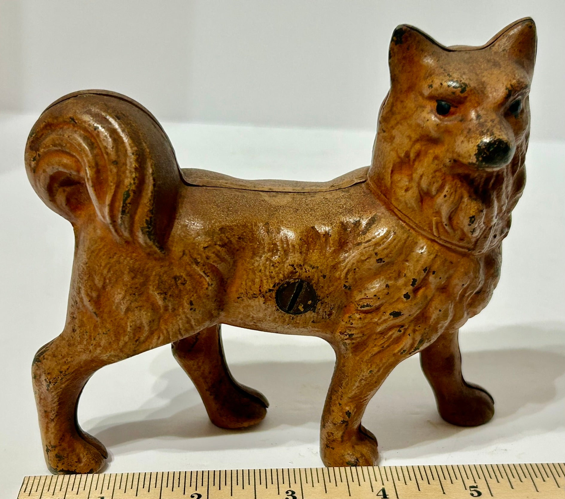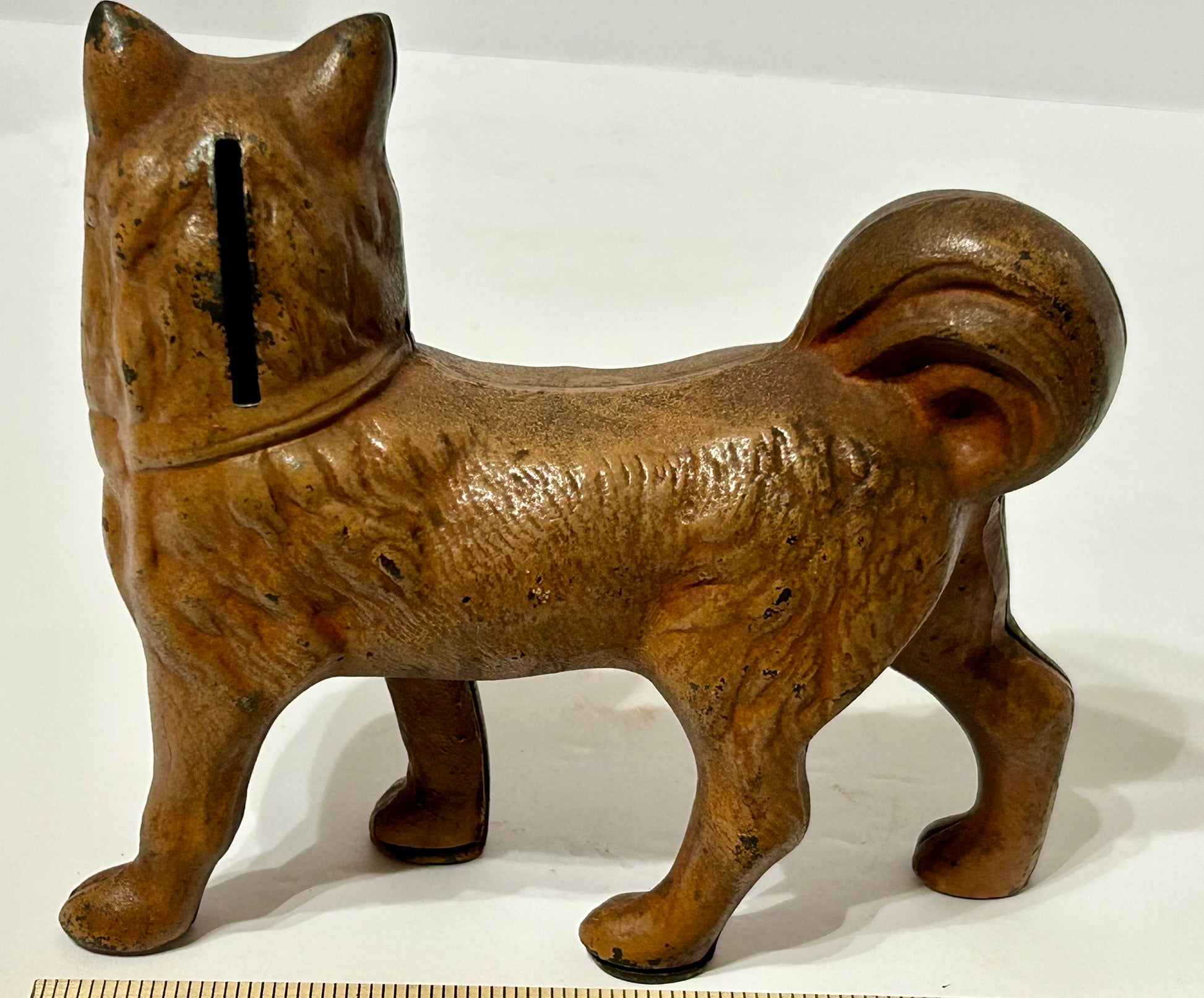 ANTIQUE HUSKEY DOG IRON STILL BANK 5 1/2" LONG X 5" TALL. CALL OR TEXT FOR MORE INFORMATION