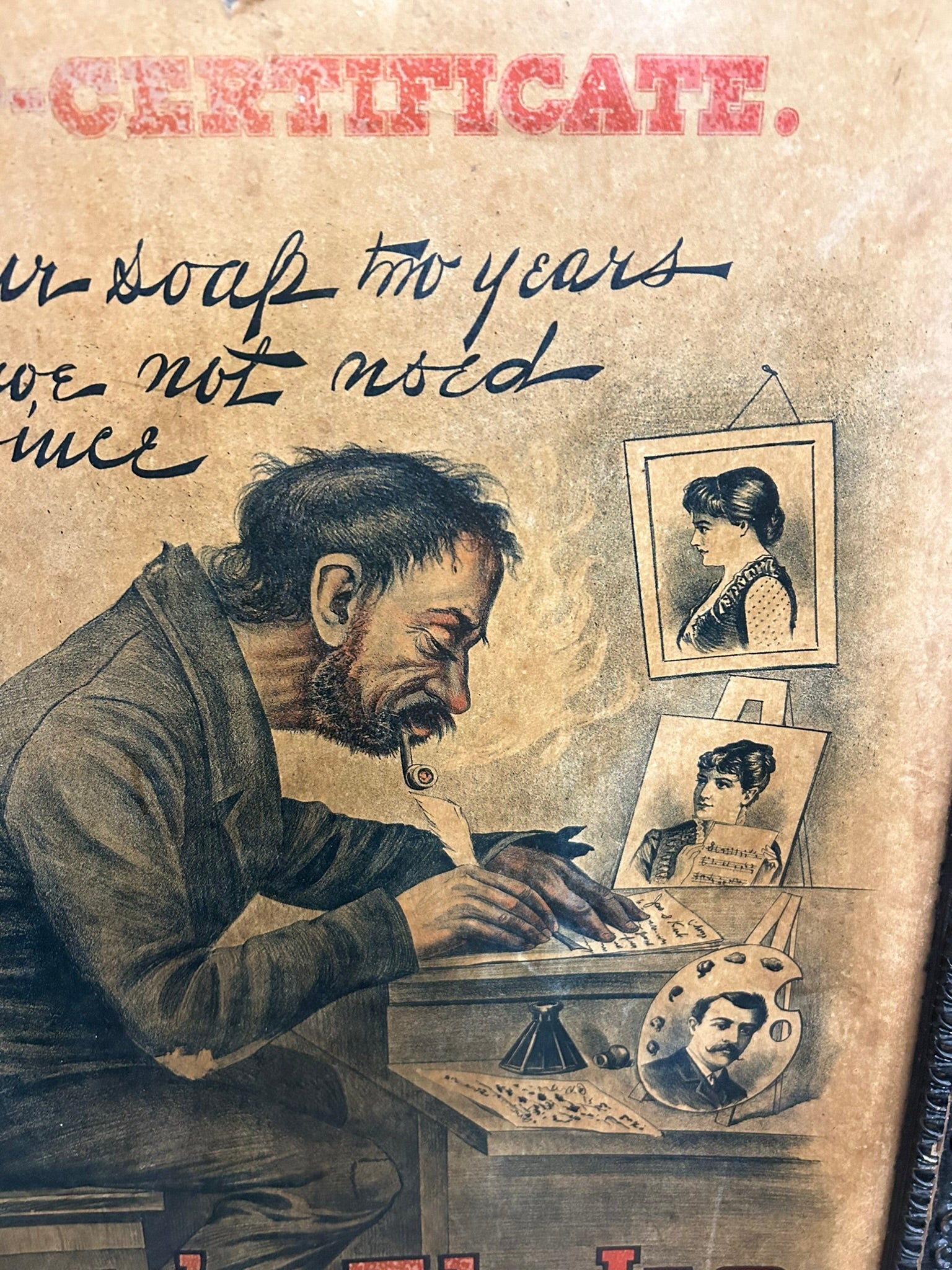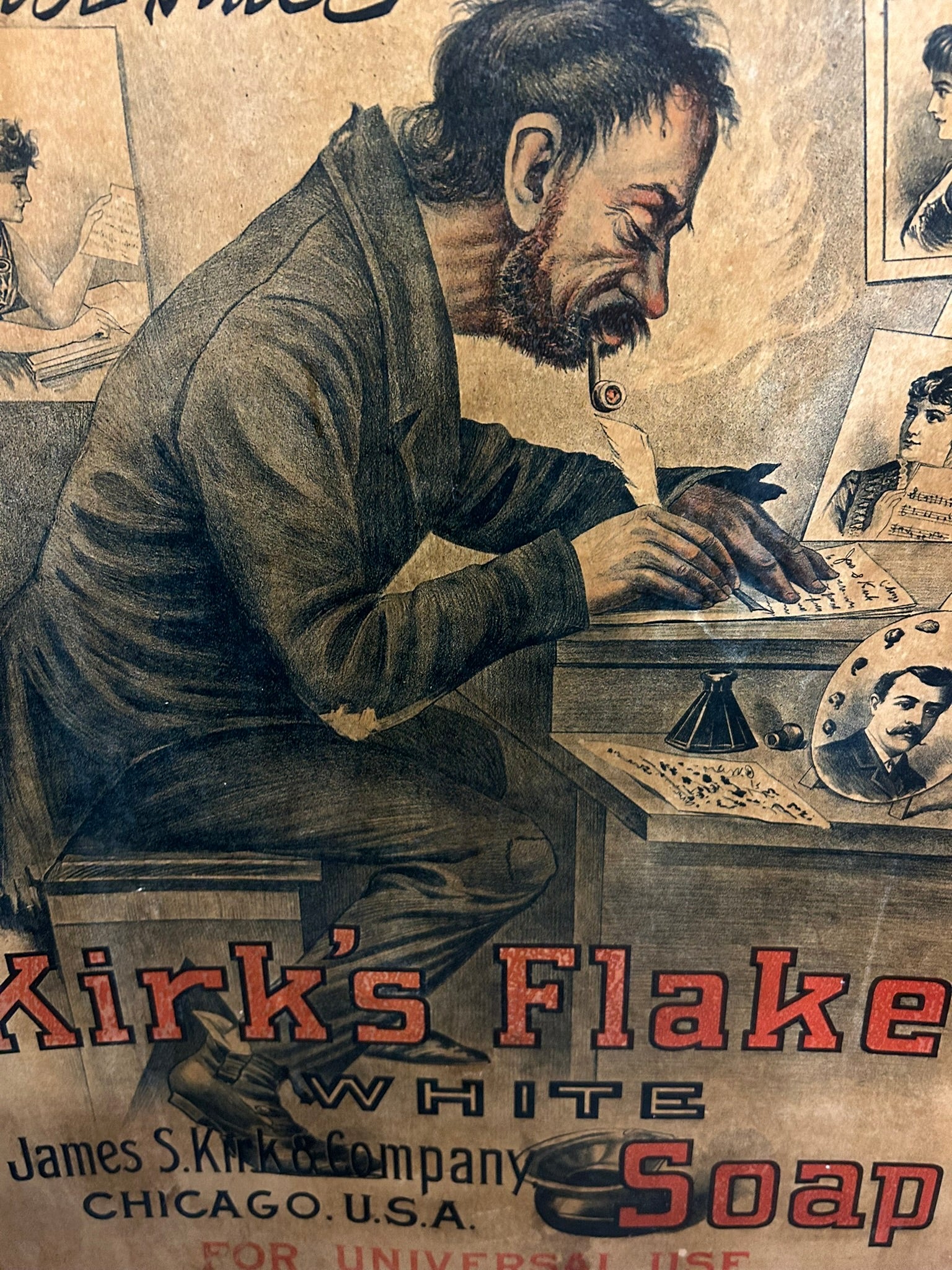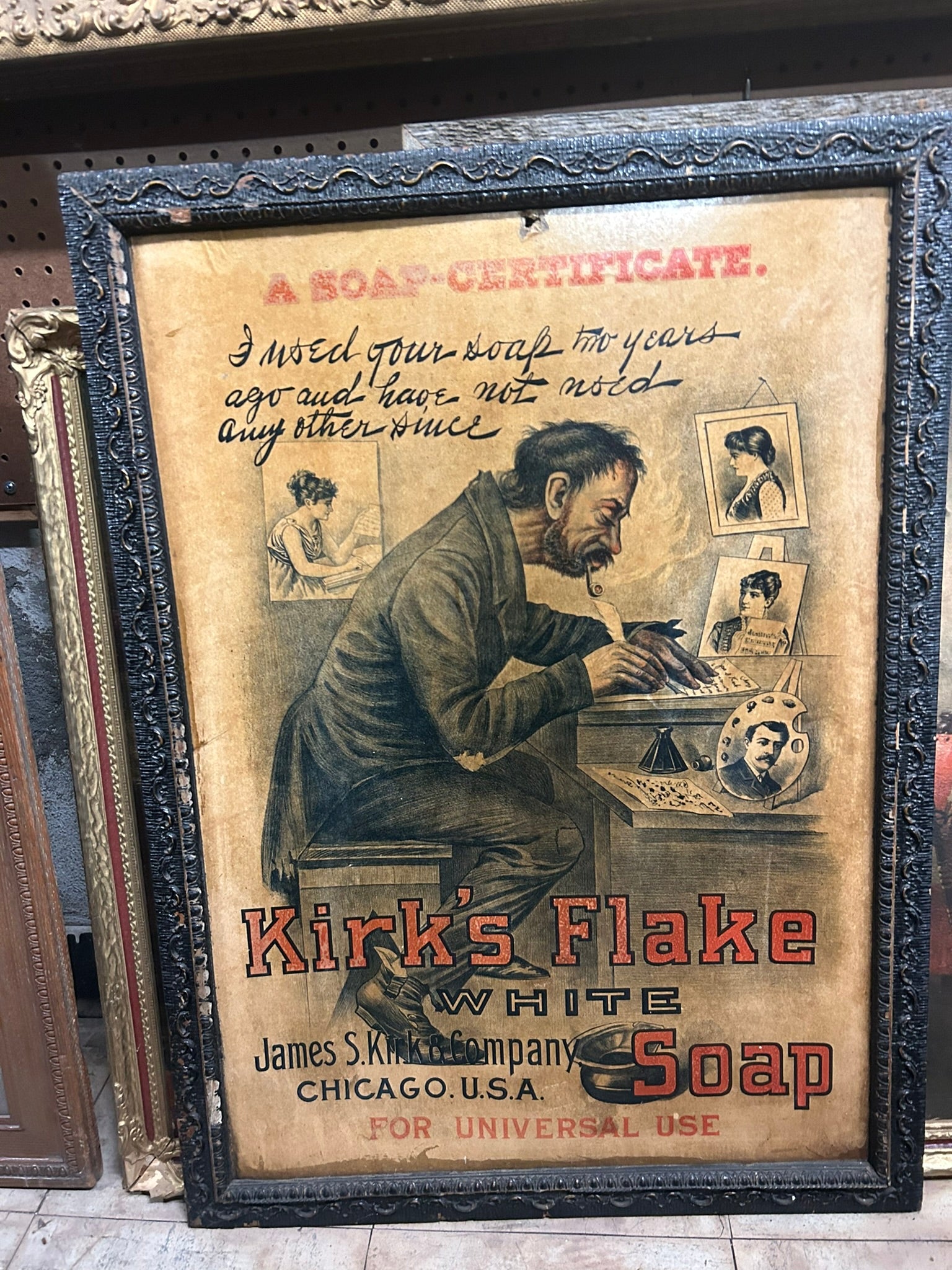 ANTIQUE KIRK'S FLAKE SOAD ADVERTISING SIGN, CARDBOARD LITHO FRAMED, 34" X 25". CALL, TEXT, OR E-MAIL FOR MORE INFORMATION