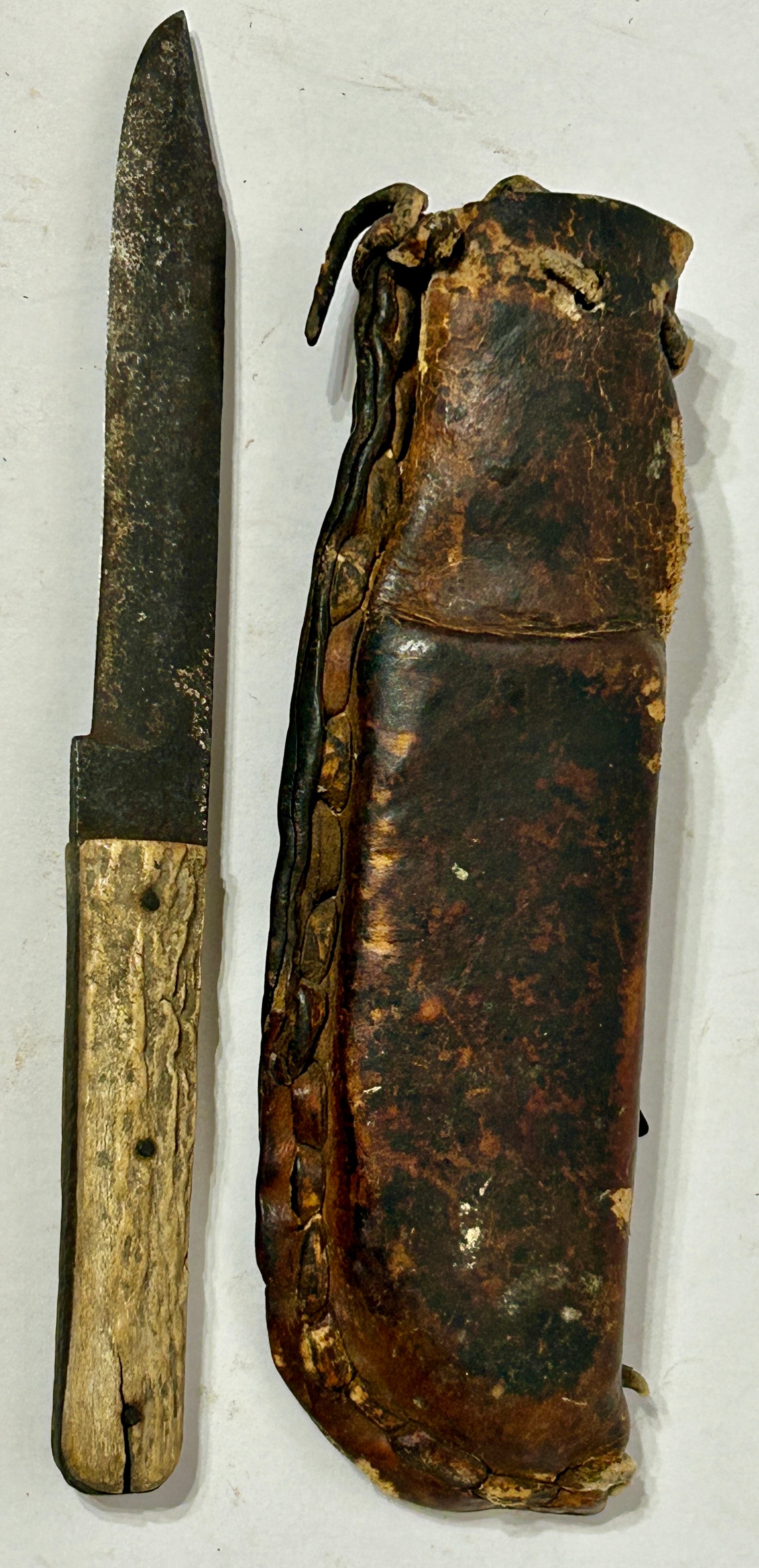 ANTIQUE KNIFE WITH STAG HANDLE IN EARLY HANDMADE SHEATH