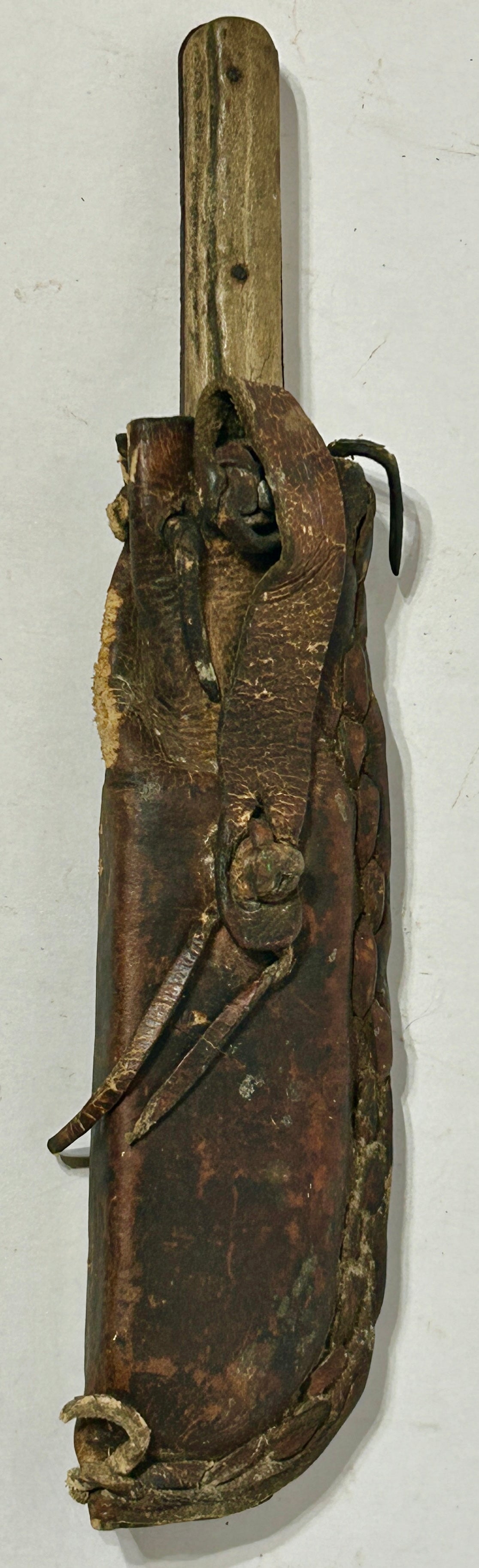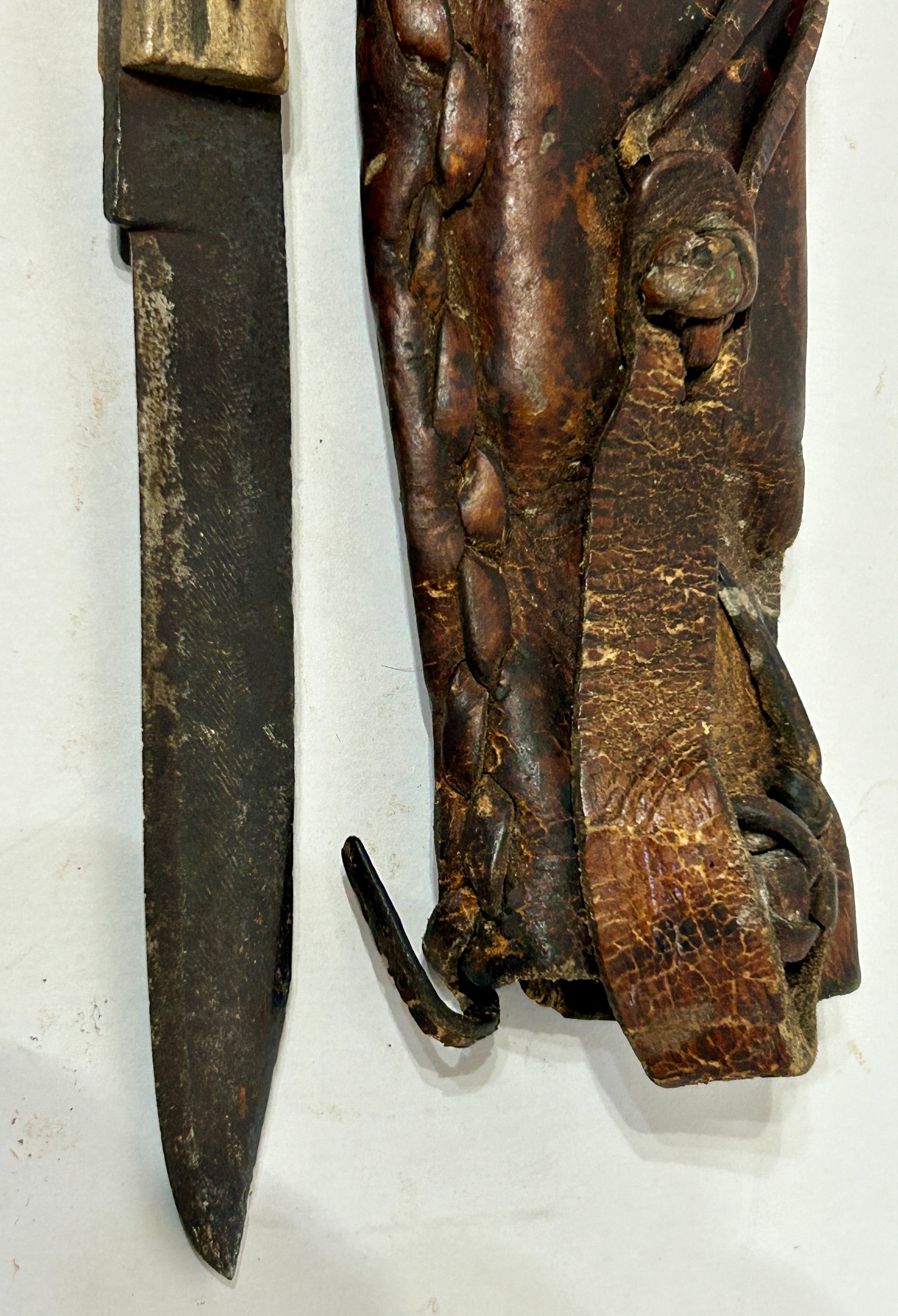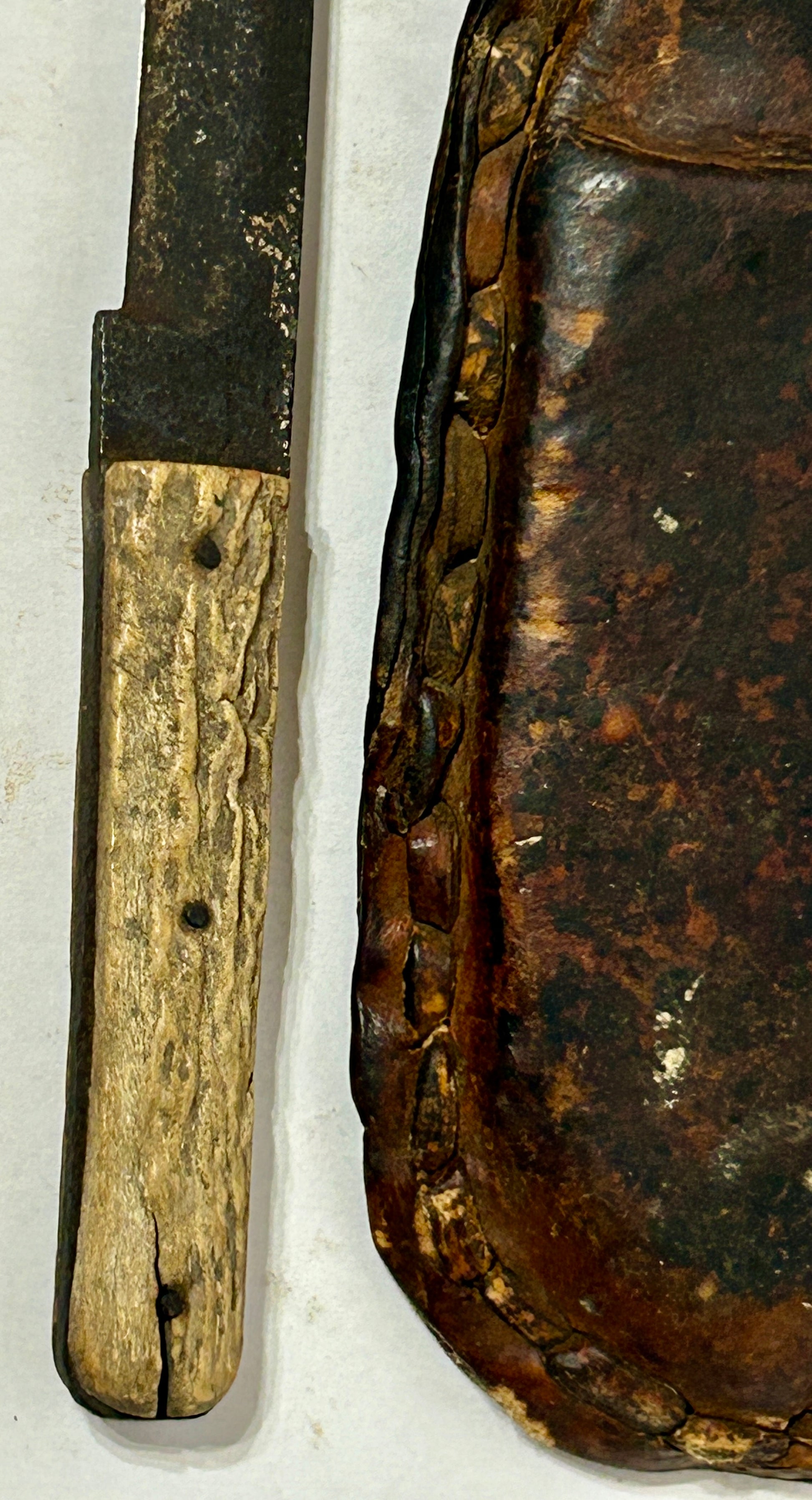 ANTIQUE STAG HANDLE KNIFE IN EARLT HANDMADE LEATHER SHEATH 11" LONG IN SHEATH. CALL OR TEXT FOR MORE INFORMATION