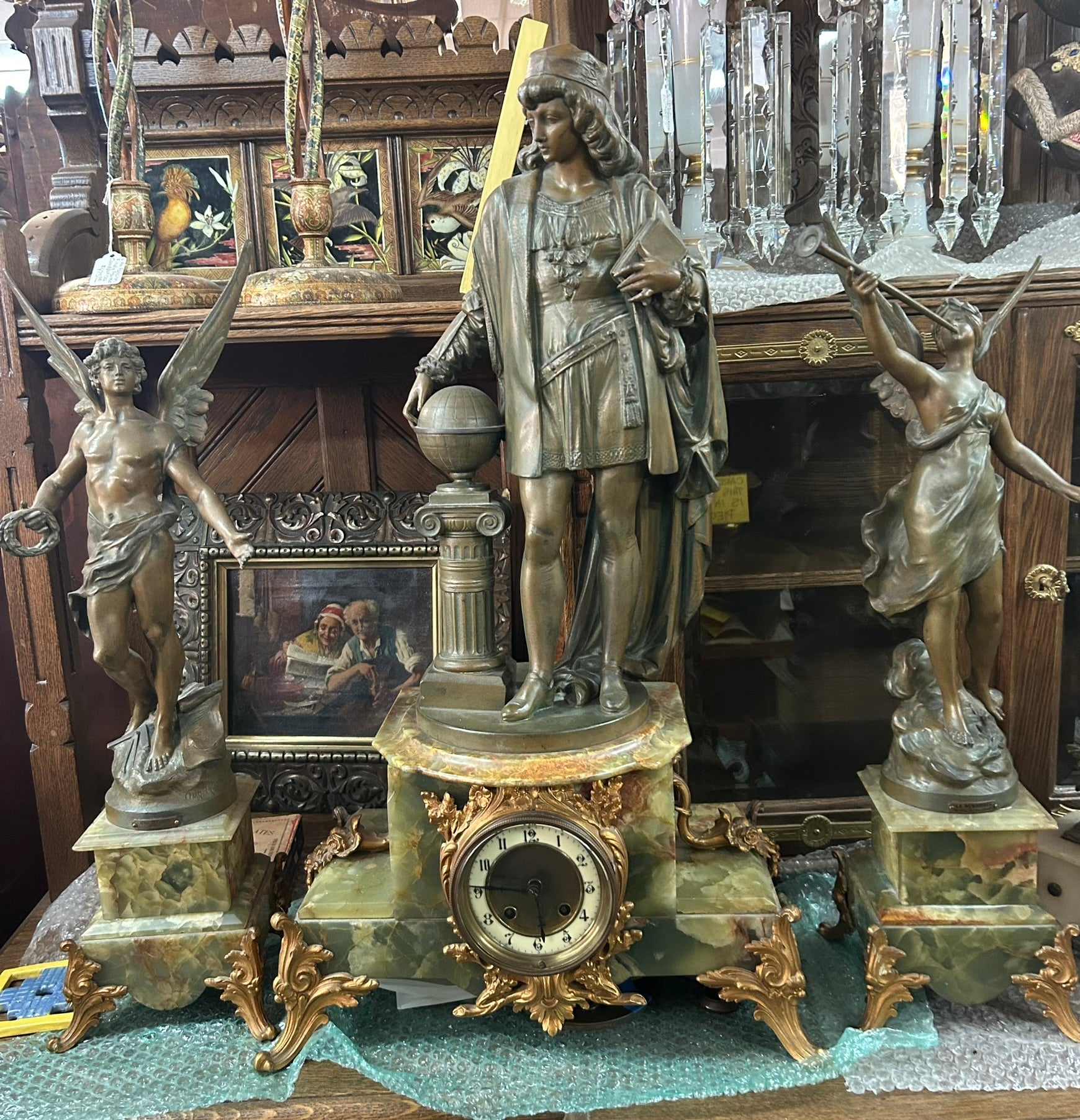 ANTIQUE THREE PIECE LARGE FIGURAL CLOCK SET OF A YOUNG EXPLORER MAGELLAN CLOCK AND TWO SEPERATE ANGEL FIGURES, MADE OF HEAVY BRONZE LIKE SPELTER AND GREEN ONYX, CENTRAL CLOCK IS 28" TALL AND EACH ANGEL FIGURE IS 24" Tall. CALL, TEXT, OR E-MAIL FOR MORE INFORMATION