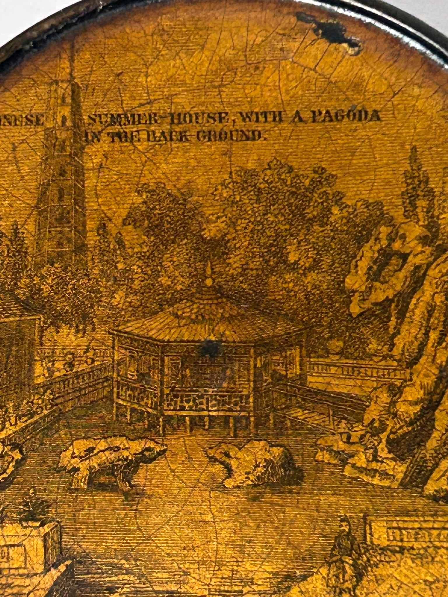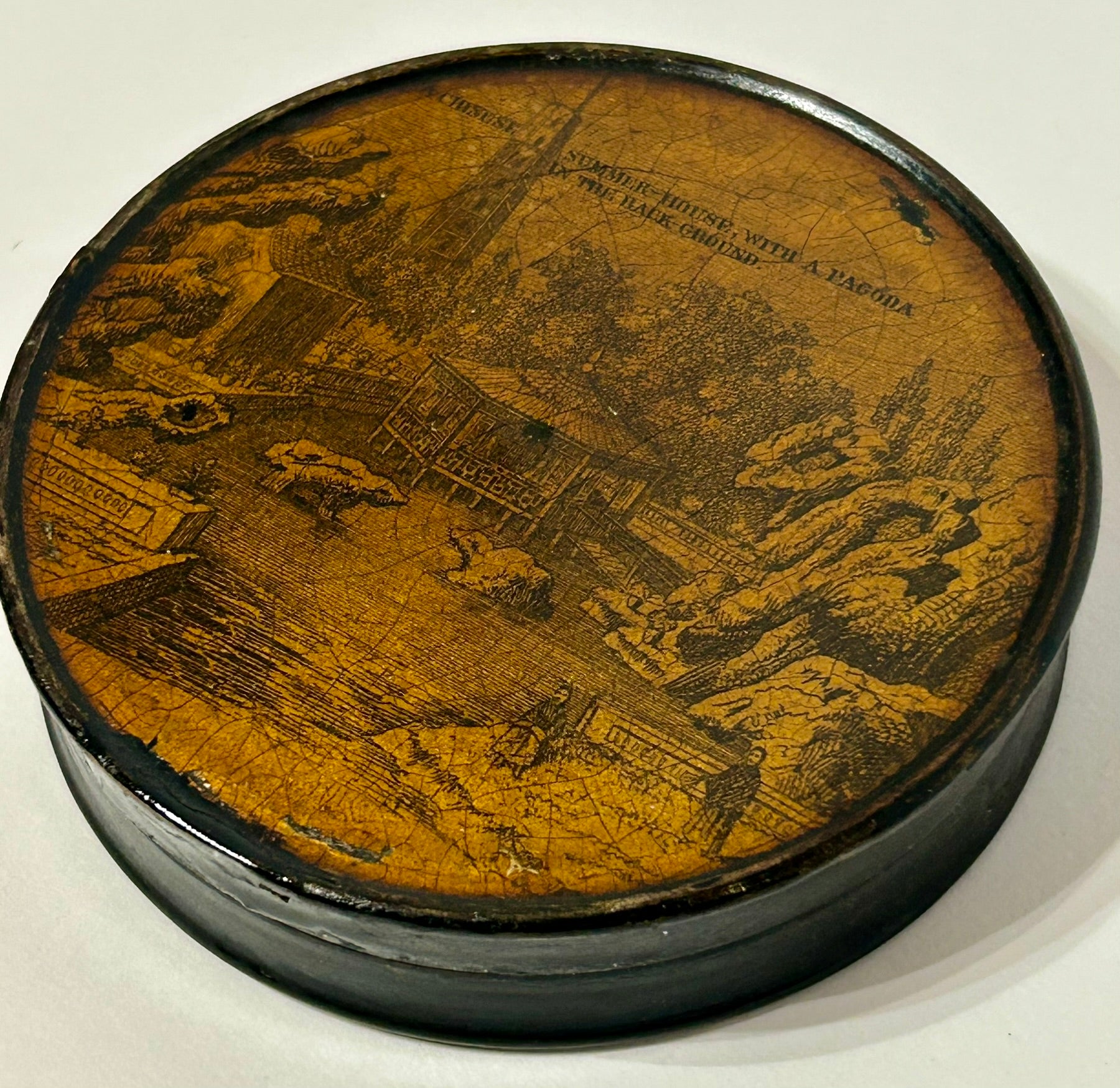 ANTIQUE LATE 1700'S PAPER MACHE SNUFF BOX WITH SCENE OF CHINESE SUMMER HOUSE. CALL OR TEXT FOR MORE INFORMATION