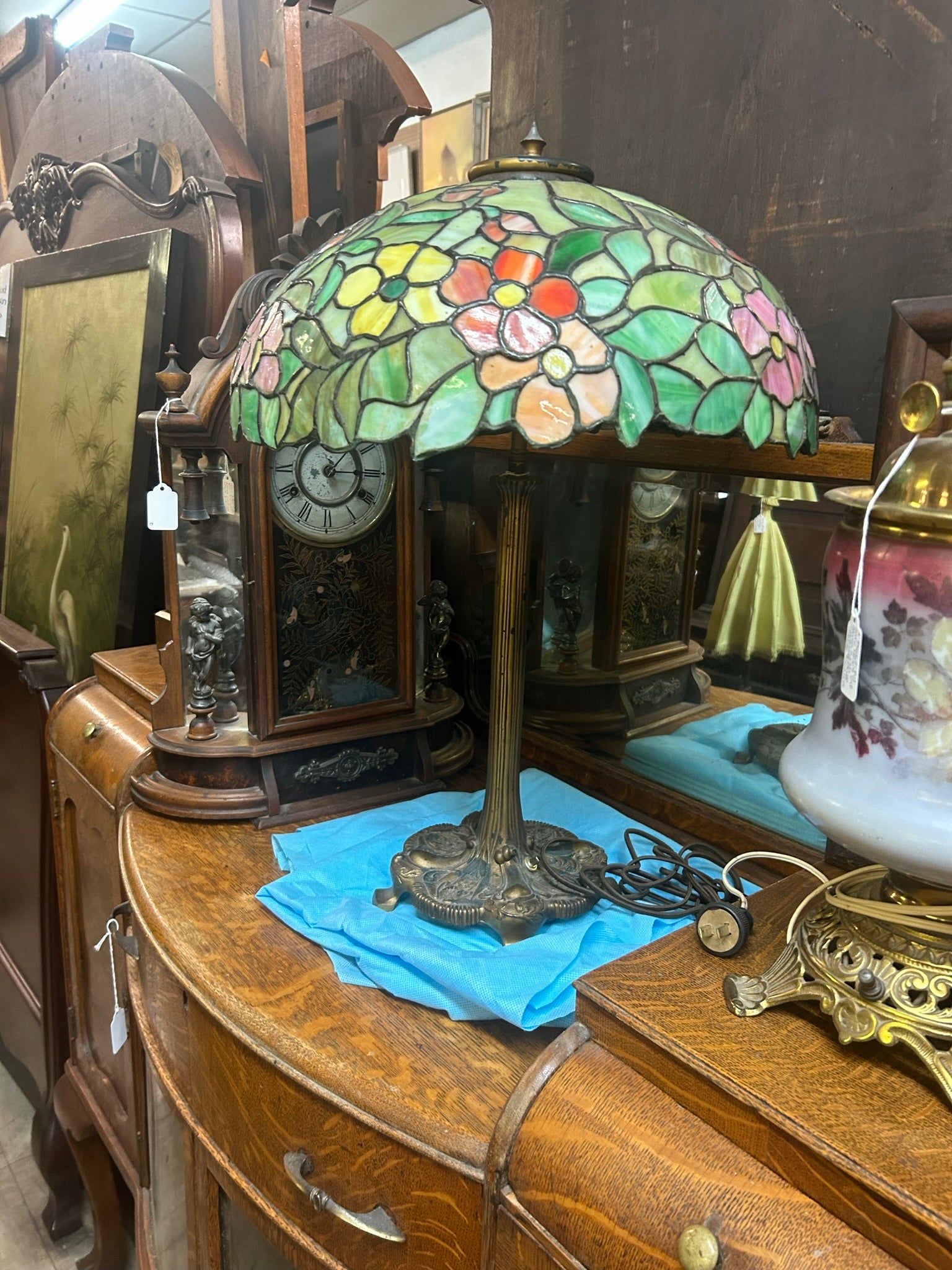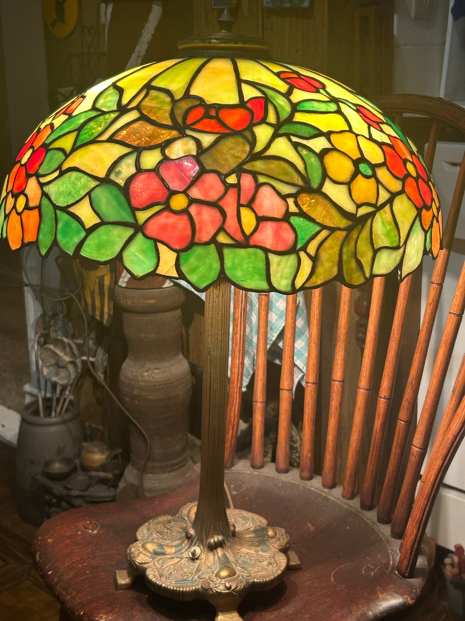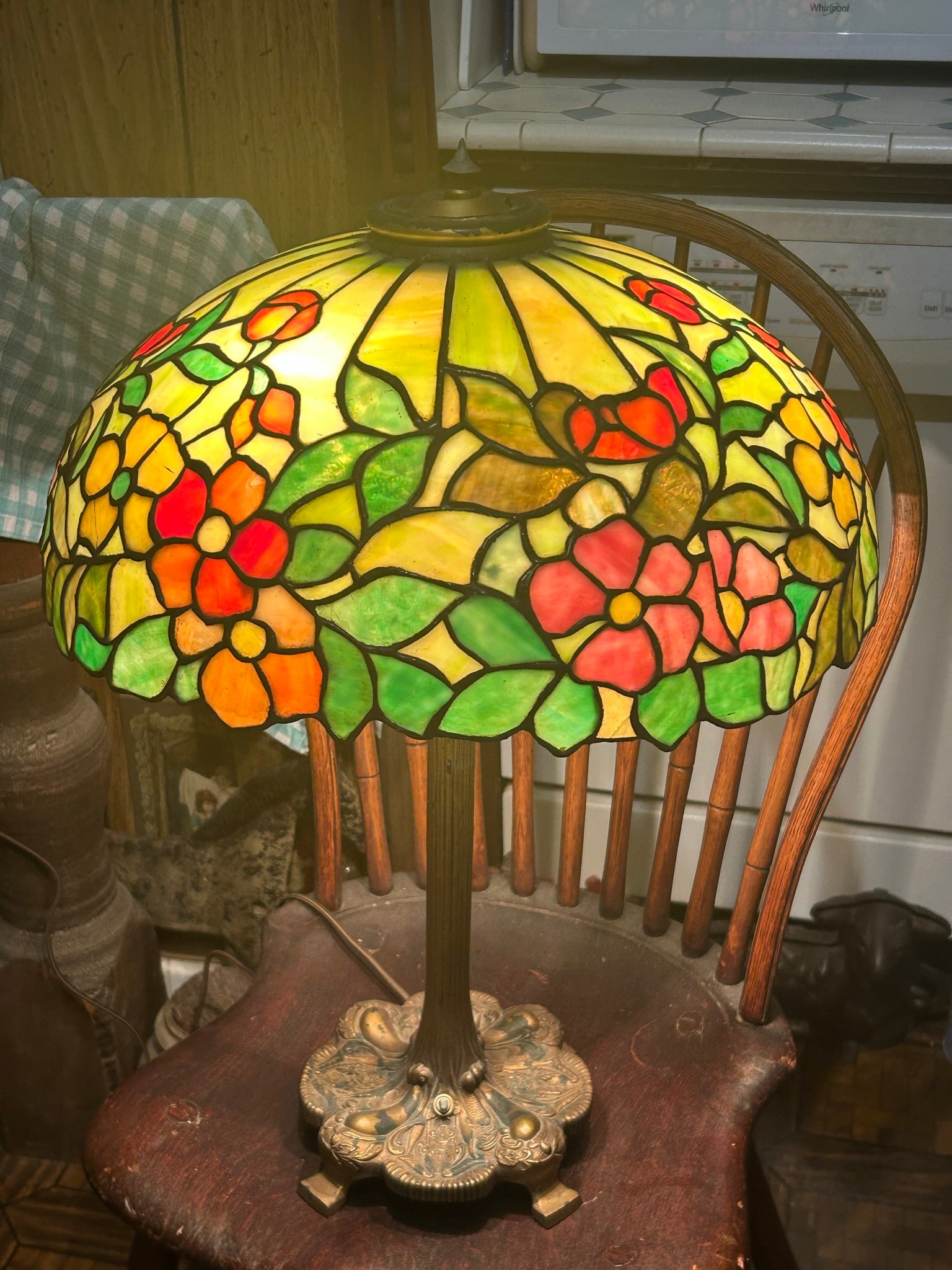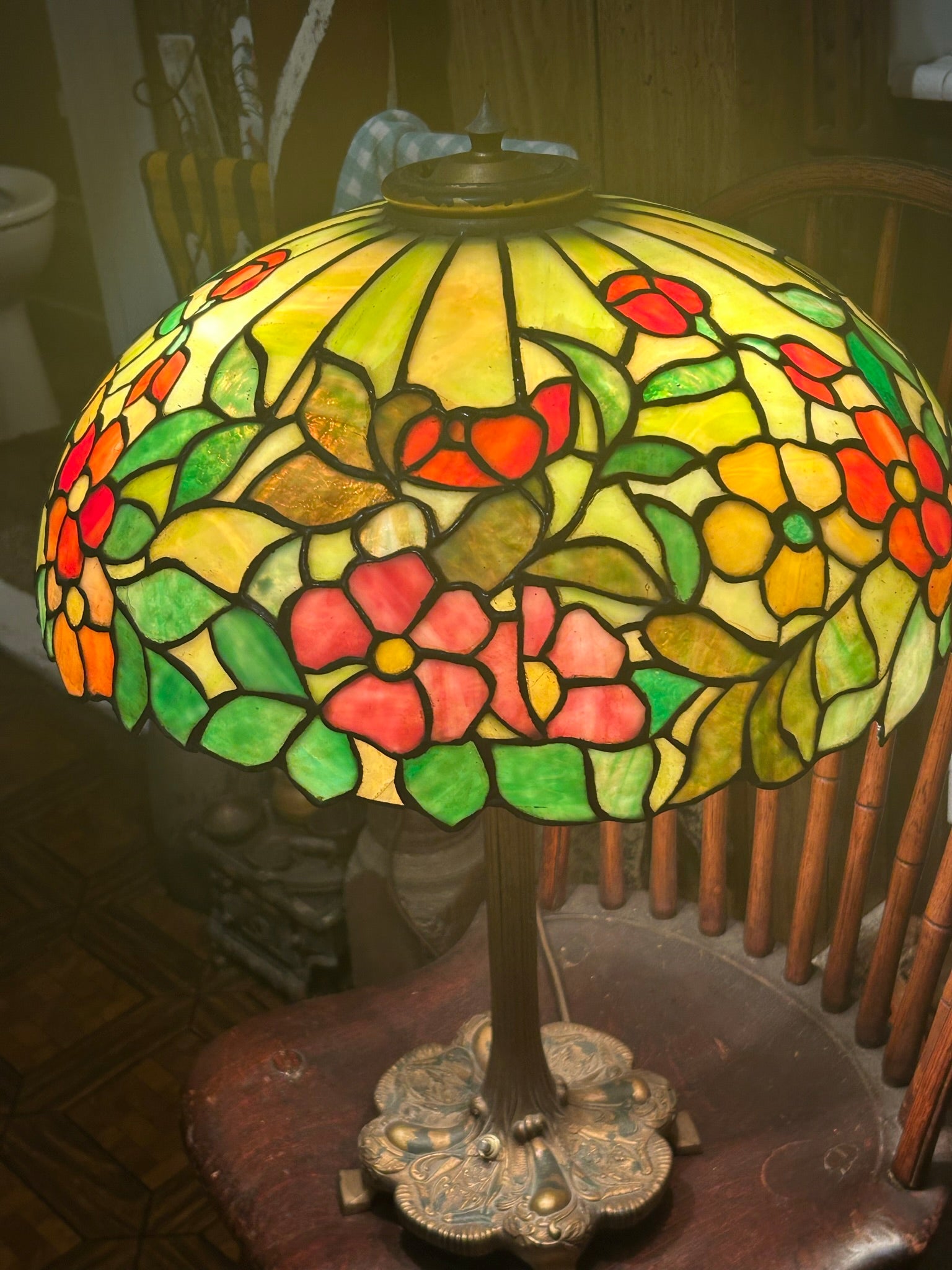 ANTIQUE LEADED GLASS FLORAL TABLE LAMP 25" TALL. CALL, TEXT, OR E-MAIL FOR MORE INFORMATION