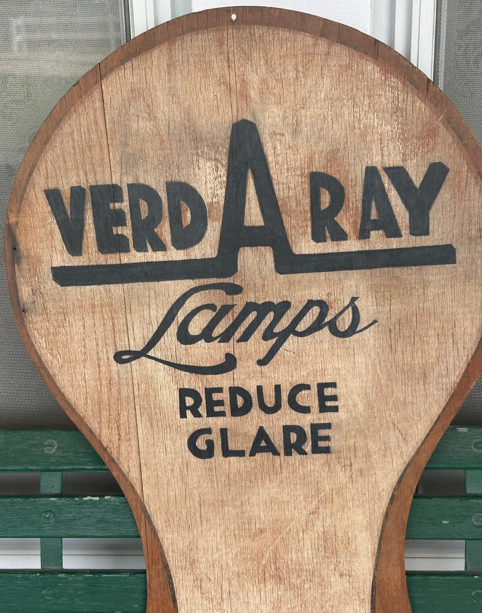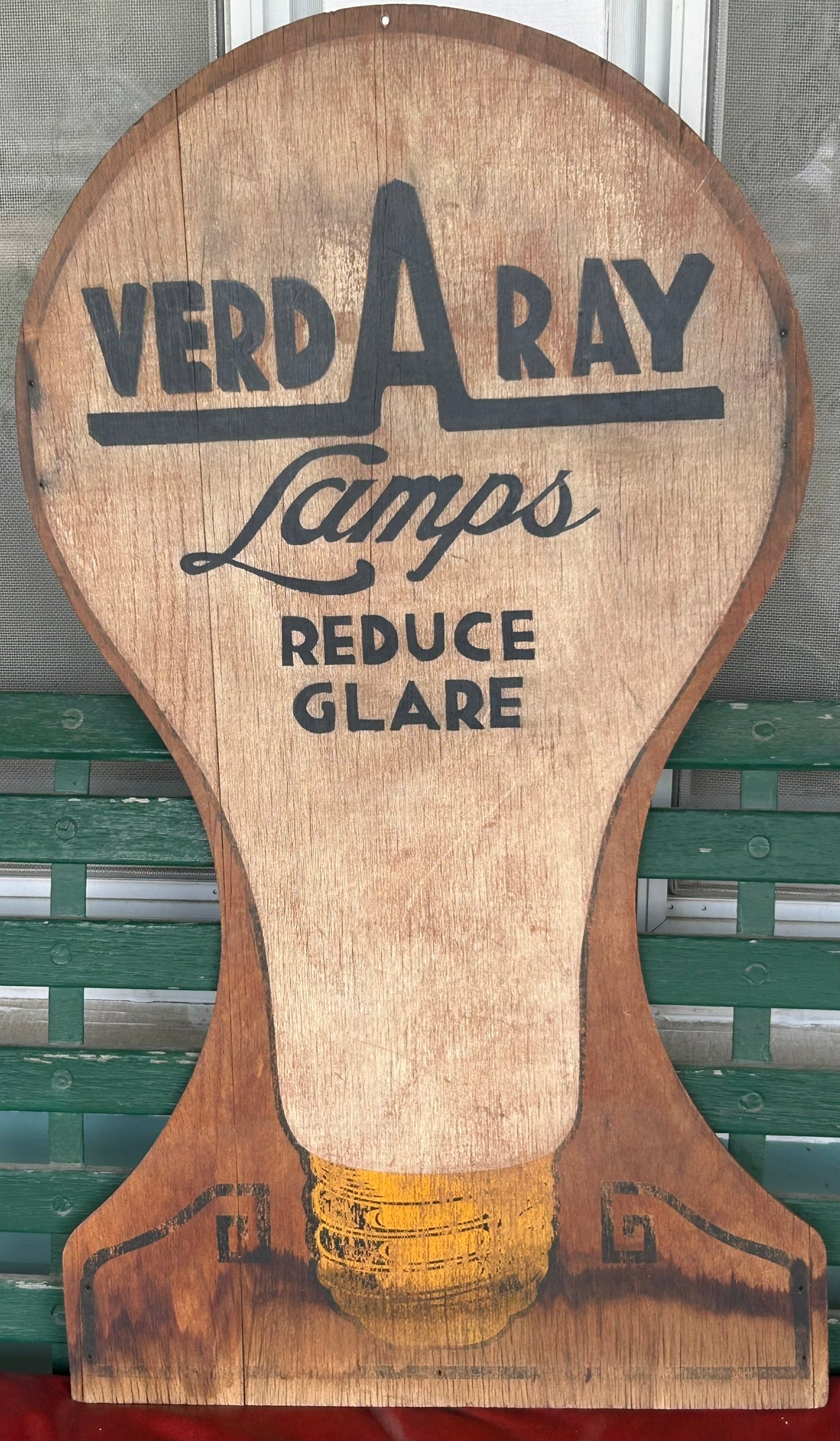 ANTIQUE LIGHT BULB ADVERTISING WOOD SIGN FOR VERD A RAY 29" TALL X 16" WIDE. CALL OR TEXT FOR MORE INFORMATION