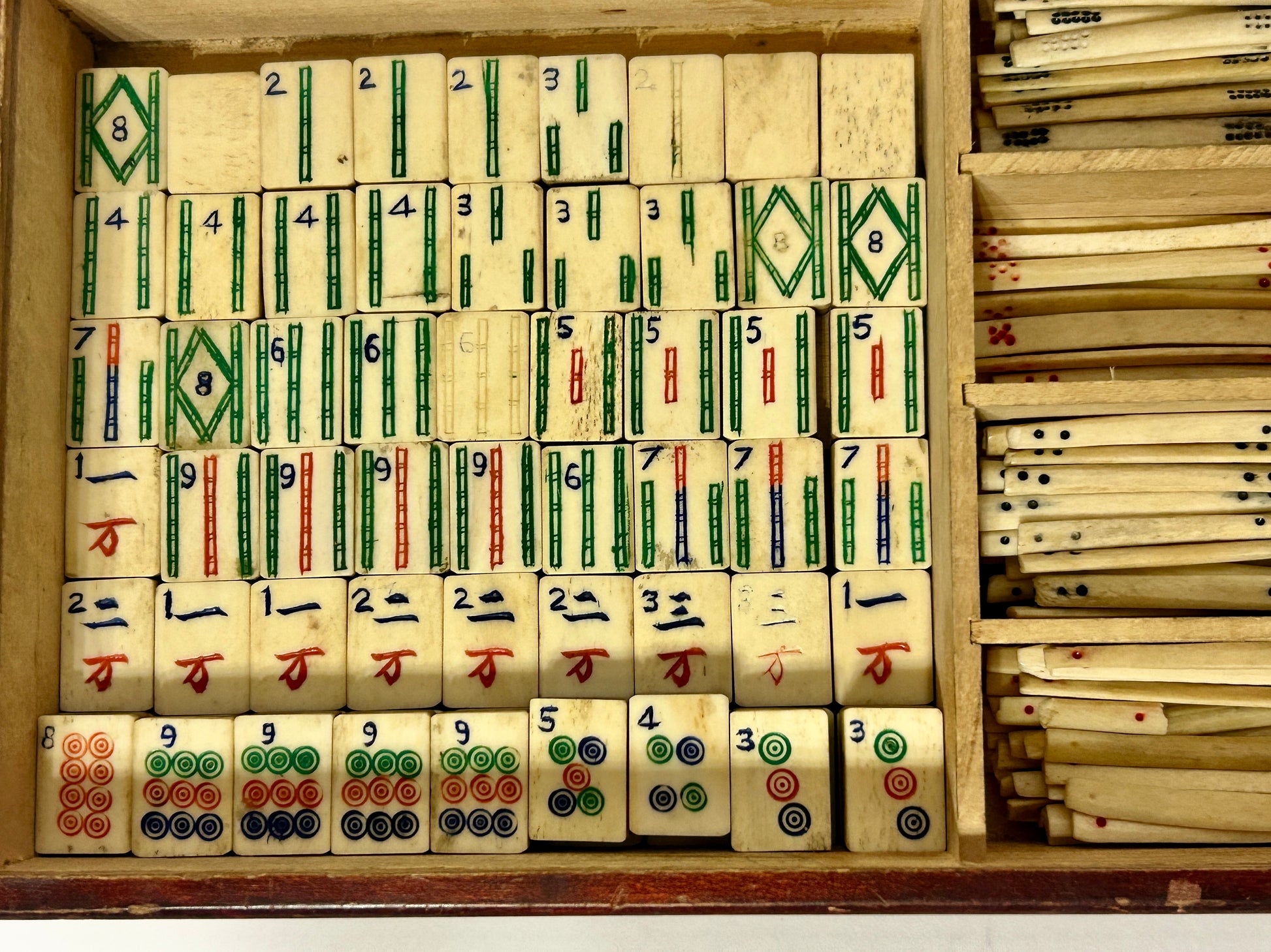 ANTIQUE MAHJONG SET WITH 145 BONE TILES