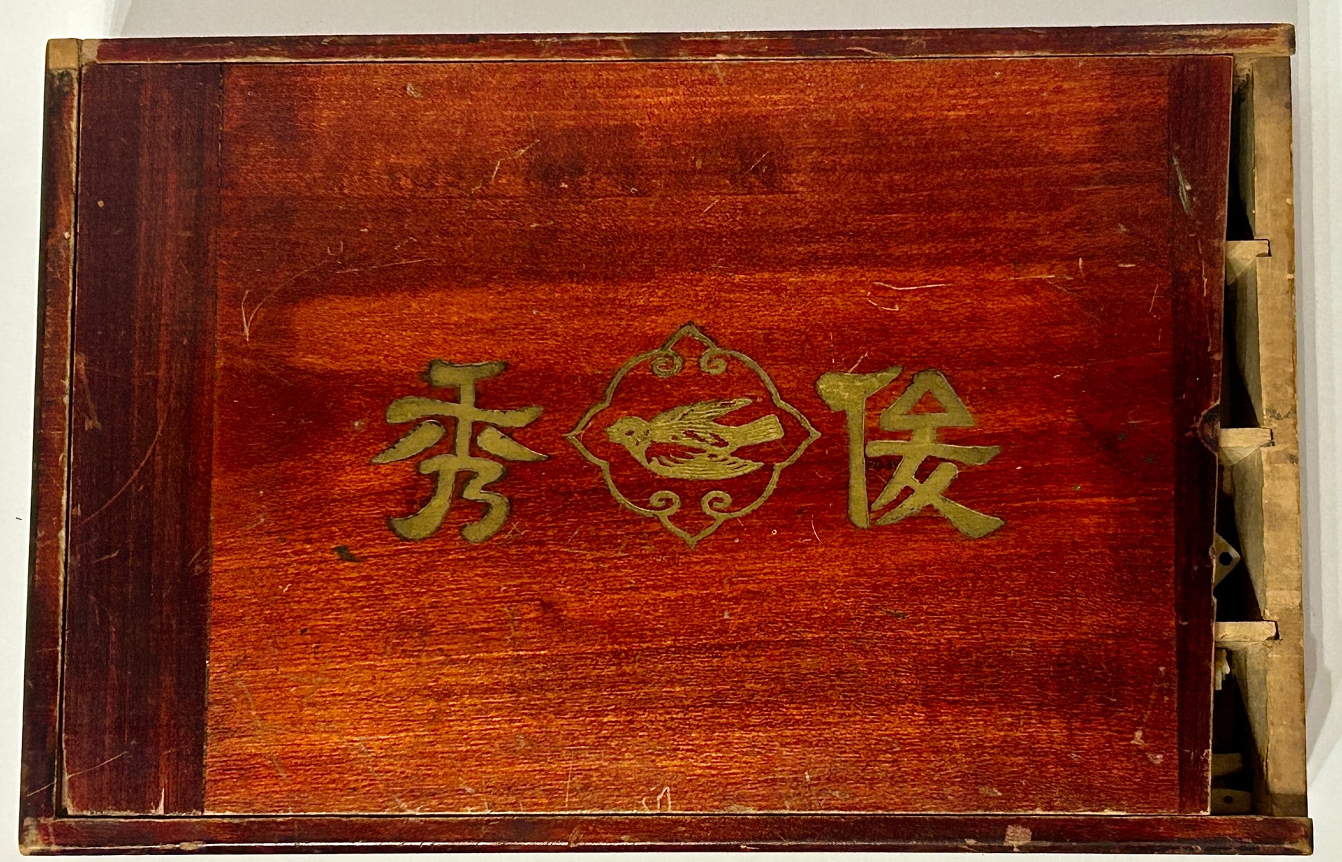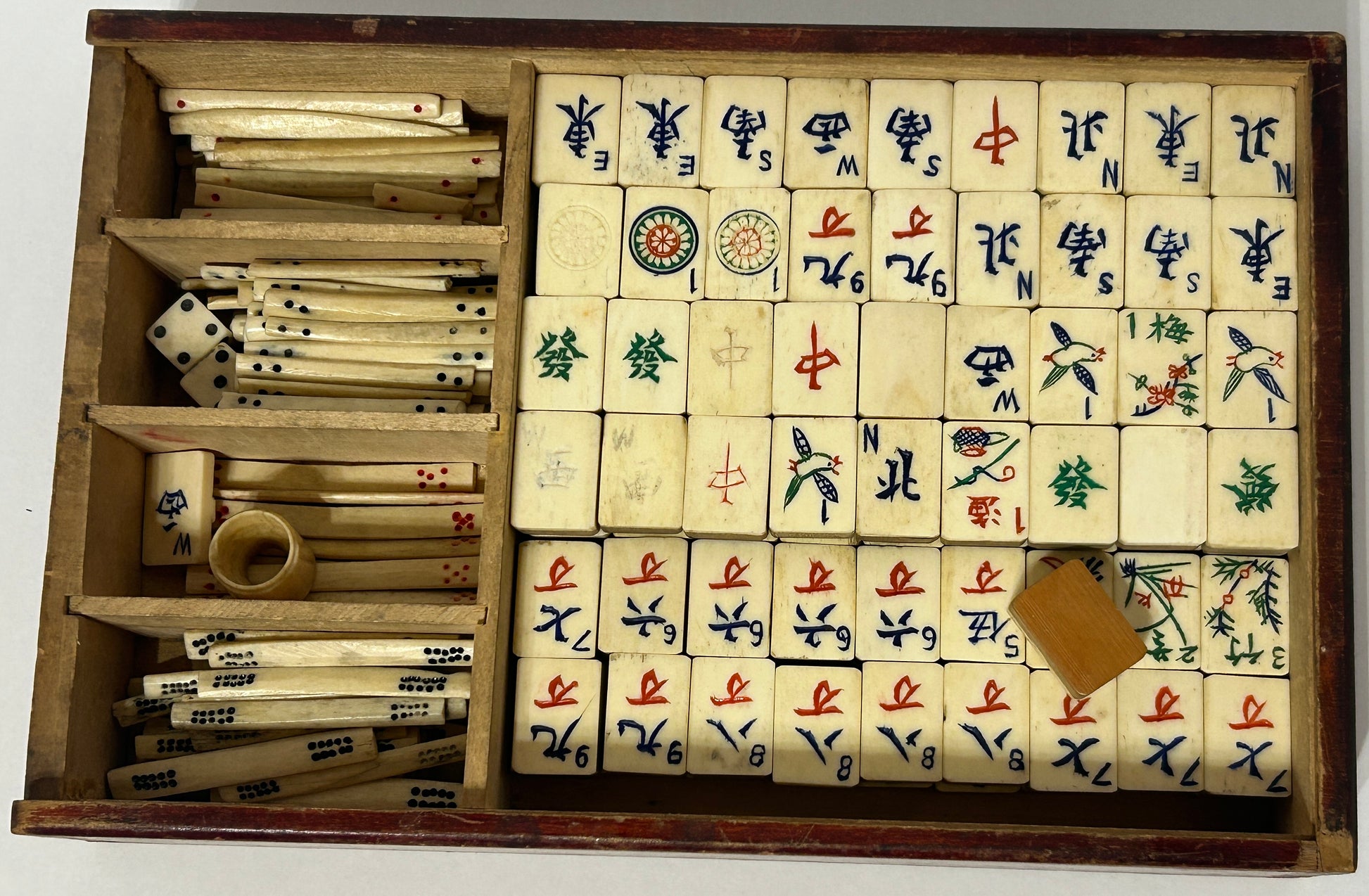 ANTIQUE MAHJONG SET WITH BONE TILES AND SCORING STICKS NOTE THAT A 1/2" SECTION OF SLIDING LID IS MISSING. BOX IS 11 1/2" X 7 1/2" X 2 1/4". CALL OR TEXT FOR MORE INFORMATION