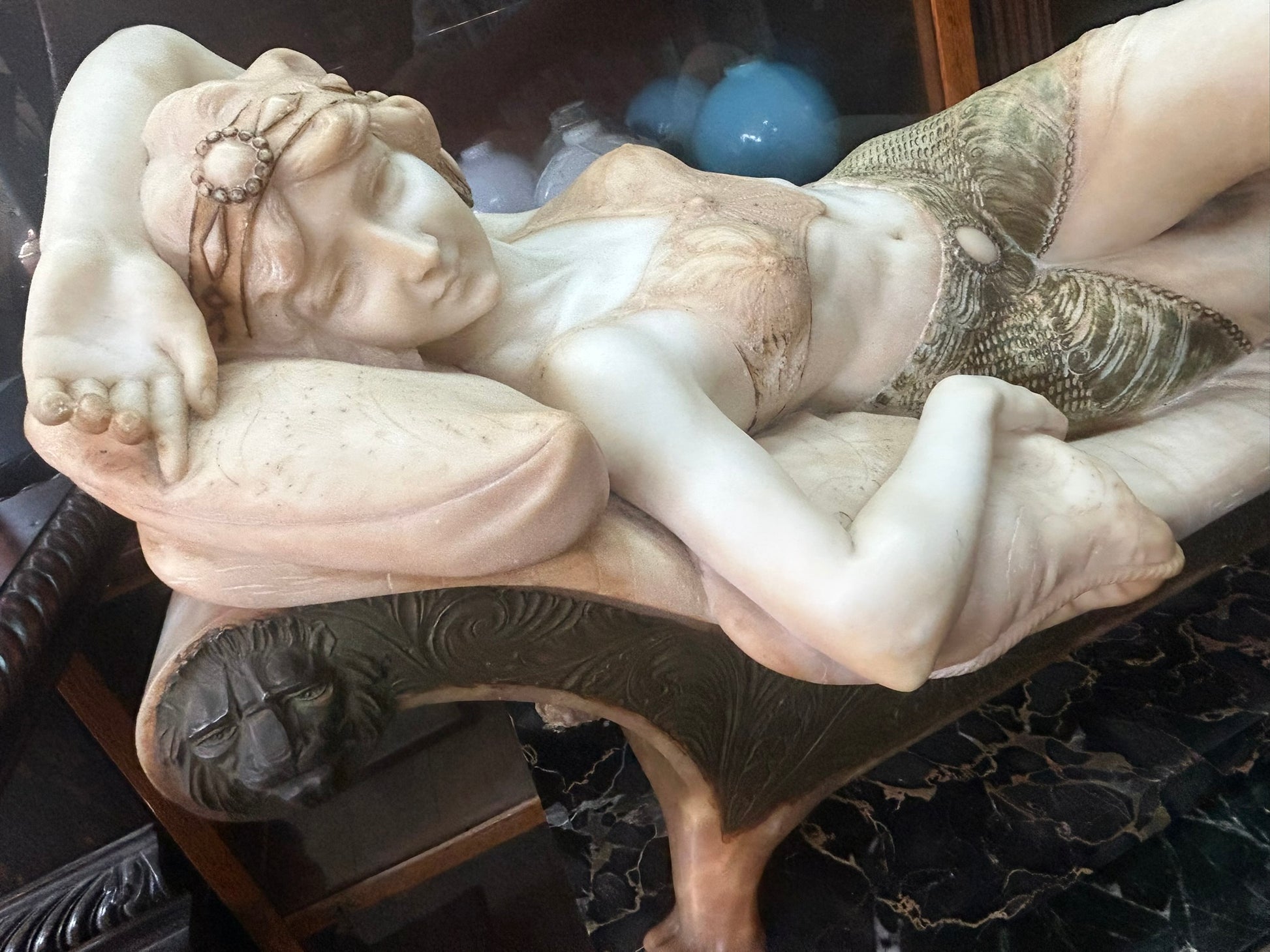 ANTIQUE MARBLE AND ALABASTER SCULPTURE OF EGYPTIAN REVIVAL STYLE WOMAN LAYING DOWN ON FAINTING COUCH LARGE 34" LONG X 19" TALL. FANTASTIC PIECE! CALL, TEXT, OR E-MAIL FOR MORE INFORMATION