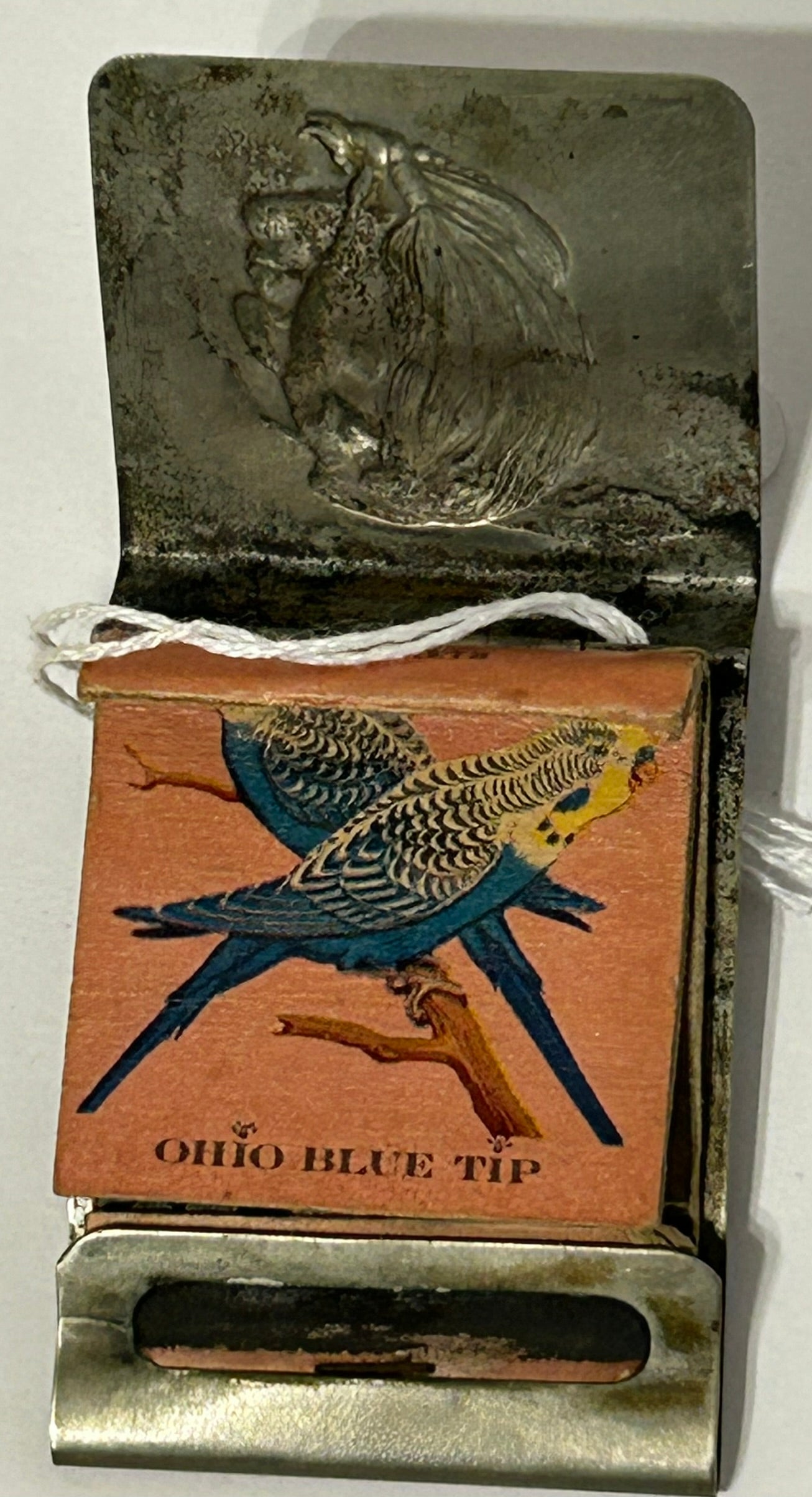 ANTIQUE MATCH BOOK HOLDER WITH NATIVE AMERICAN AND LADY COMBO DESIGN