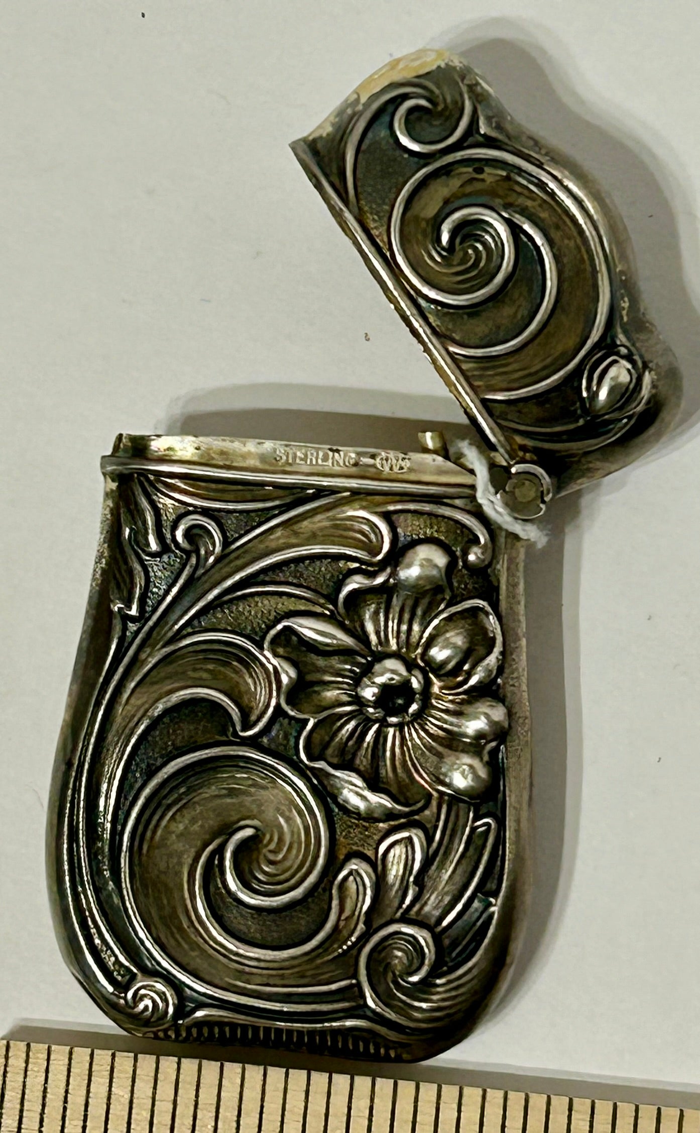 ANTIQUE MATCH SAFE WITH FANCY STERLING DESIGN