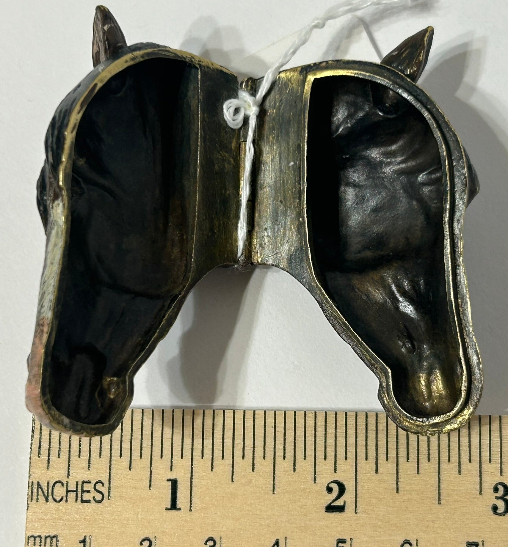 ANTIQUE MATCH SAFE WITH FIGURAL HORSE HEAD COLD PAINTED BRONZE. CALL OR TEXT FOR MORE INFORMATION