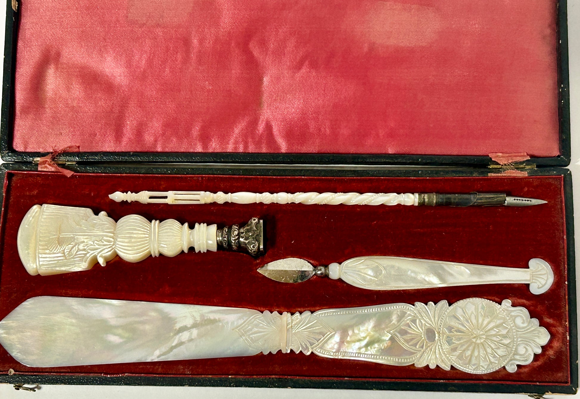 ANTIQUE MOTHER OF PEARL 4 PIECE DESK SET WITH 9" LETTER OPENER IN ORIGINAL CASE. SHIPPING CHARGES ARE EXTRA SO CALL OR TEXT TO GET SHIPPING CHARGE TO YOUR ADDRESS