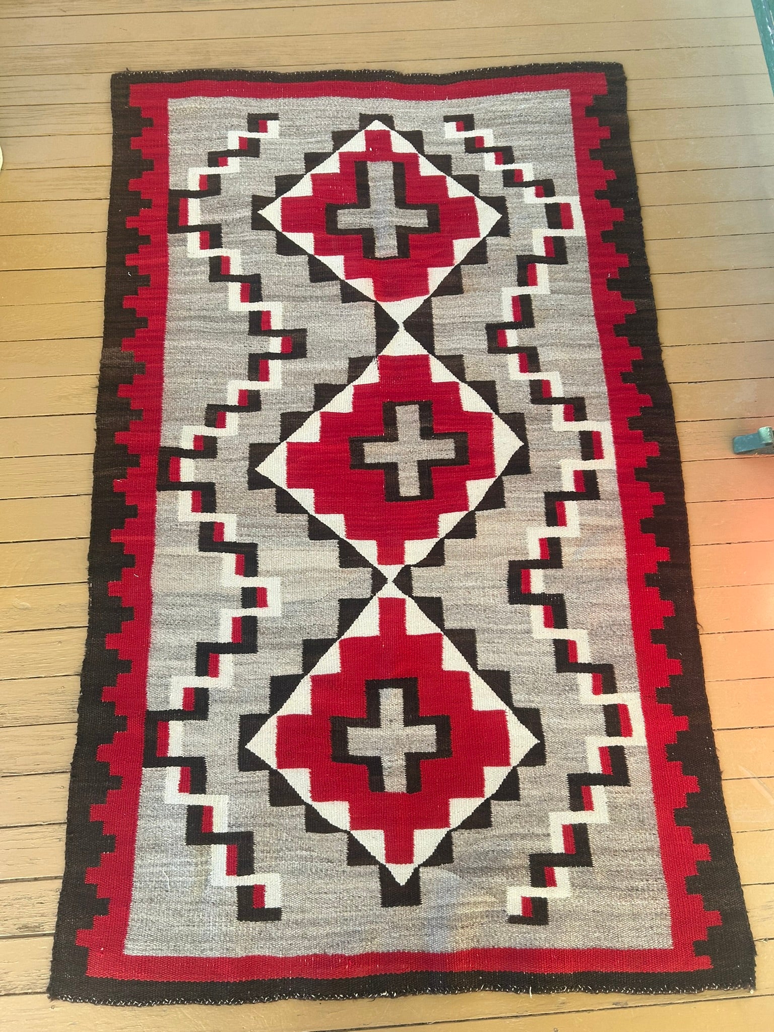 ANTIQUE NAVAJO WEAVING WITH CROSS DESIGNS IN RED, BLACK, GREY AND WHITE 74" X 46". CALL OR TEXT FOR MORE INFORMATION