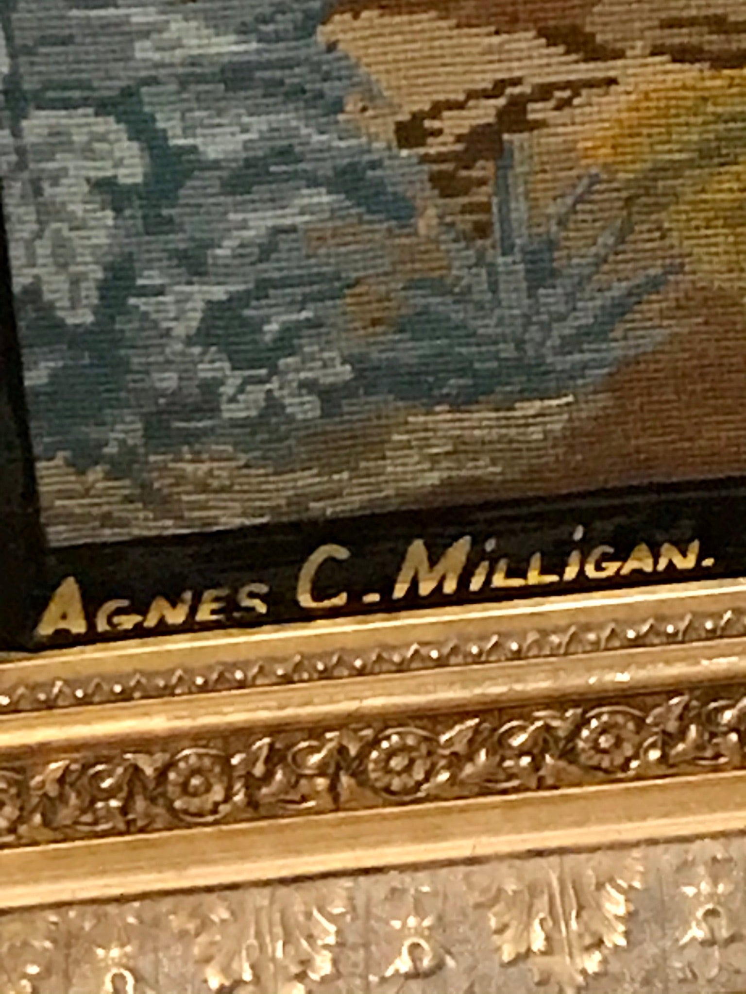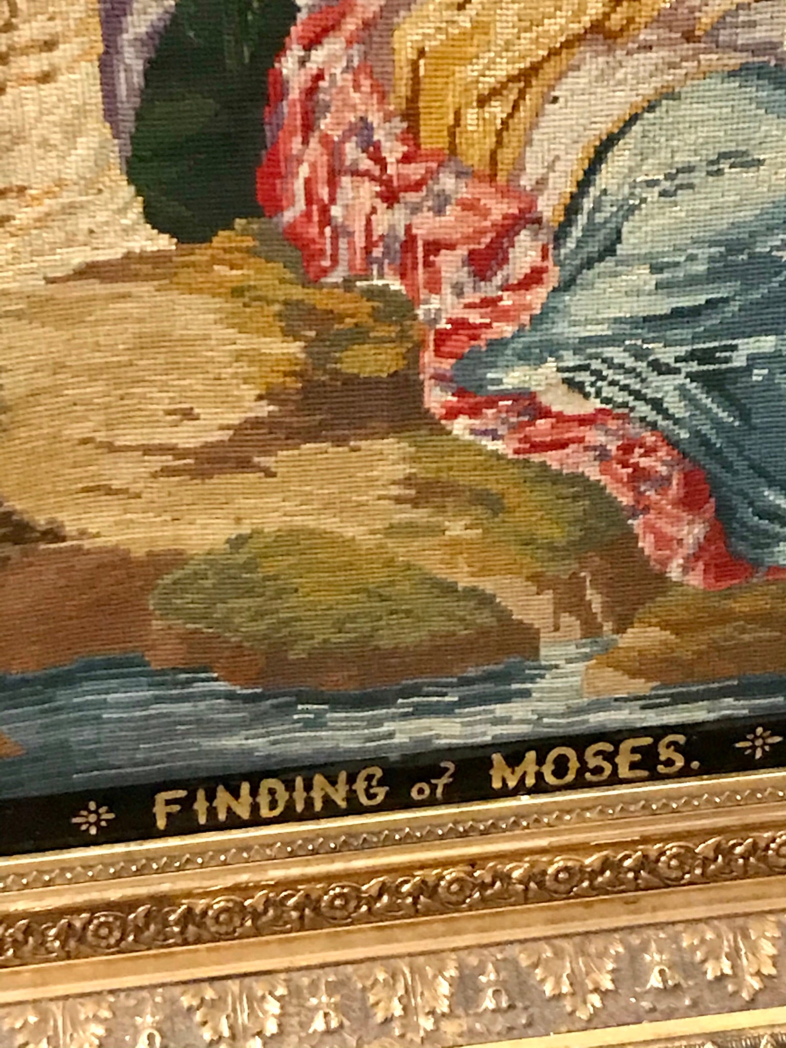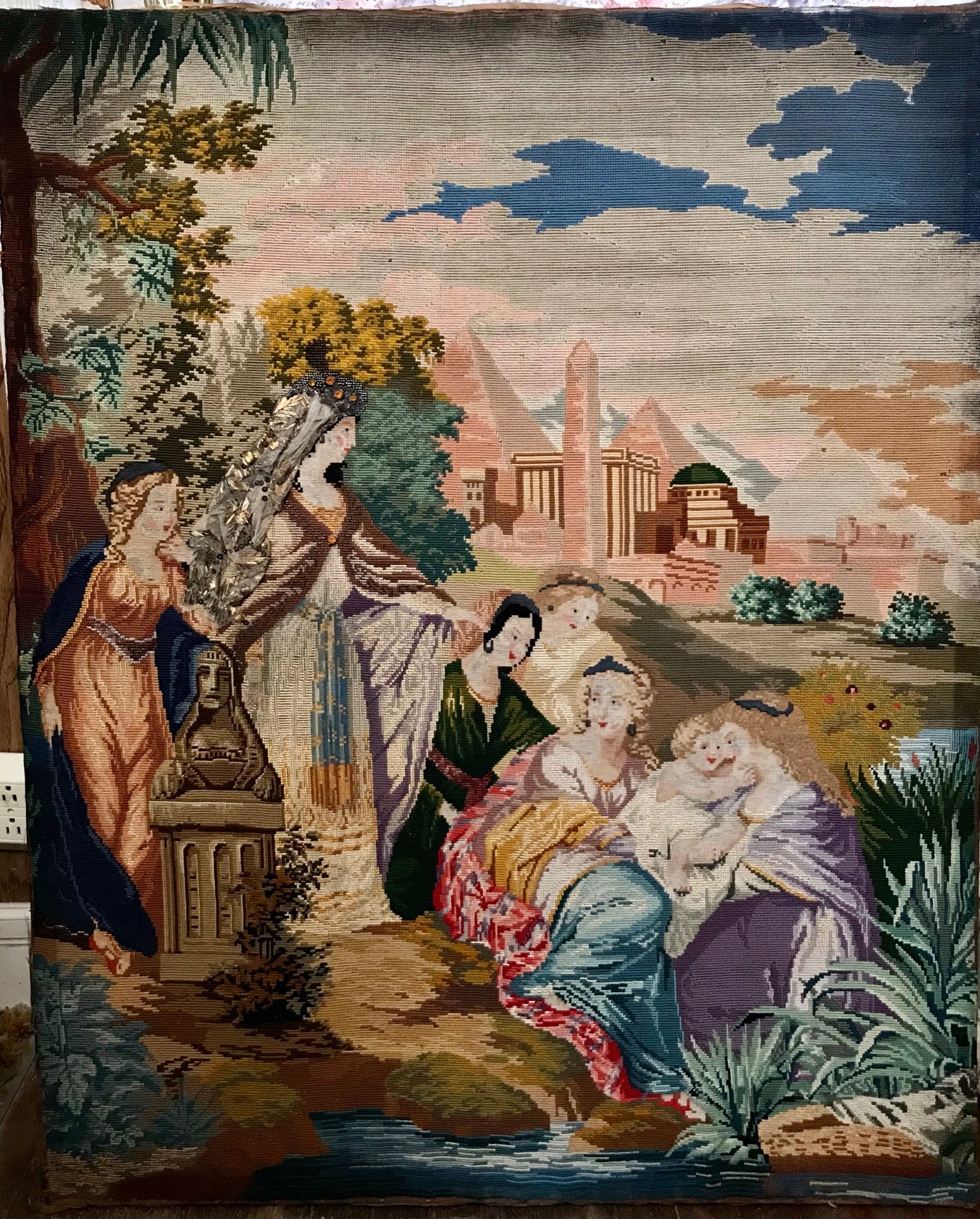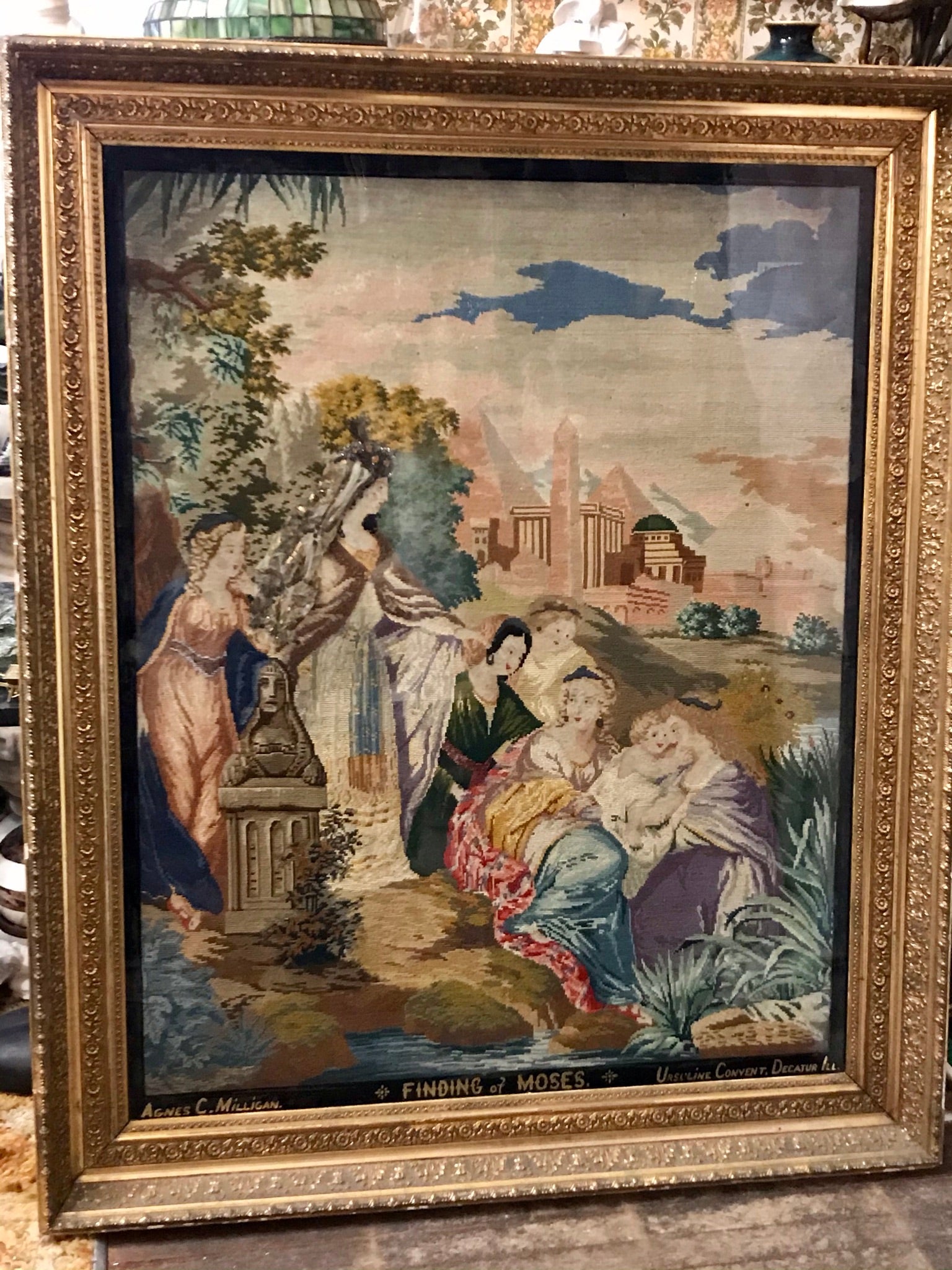 ANTIQUE RARE MEEDLEPOINT "FINDING OF MOSES" LARGE NEEDLEPOINT WITH APPLIED GLASS AND METAL BEADS, SUPERBLY DONE CIRCA 1870's SIGNED IN GILT BY AGNES C. MILLIGAN OF URSULINE CONVENT IN DECATUR ILLINOIS IN BEAUTIFUL FRAME, 51" TALL X 44" WIDE. CALL, TEXT, OR E-MAIL FOR MORE INFORMATION