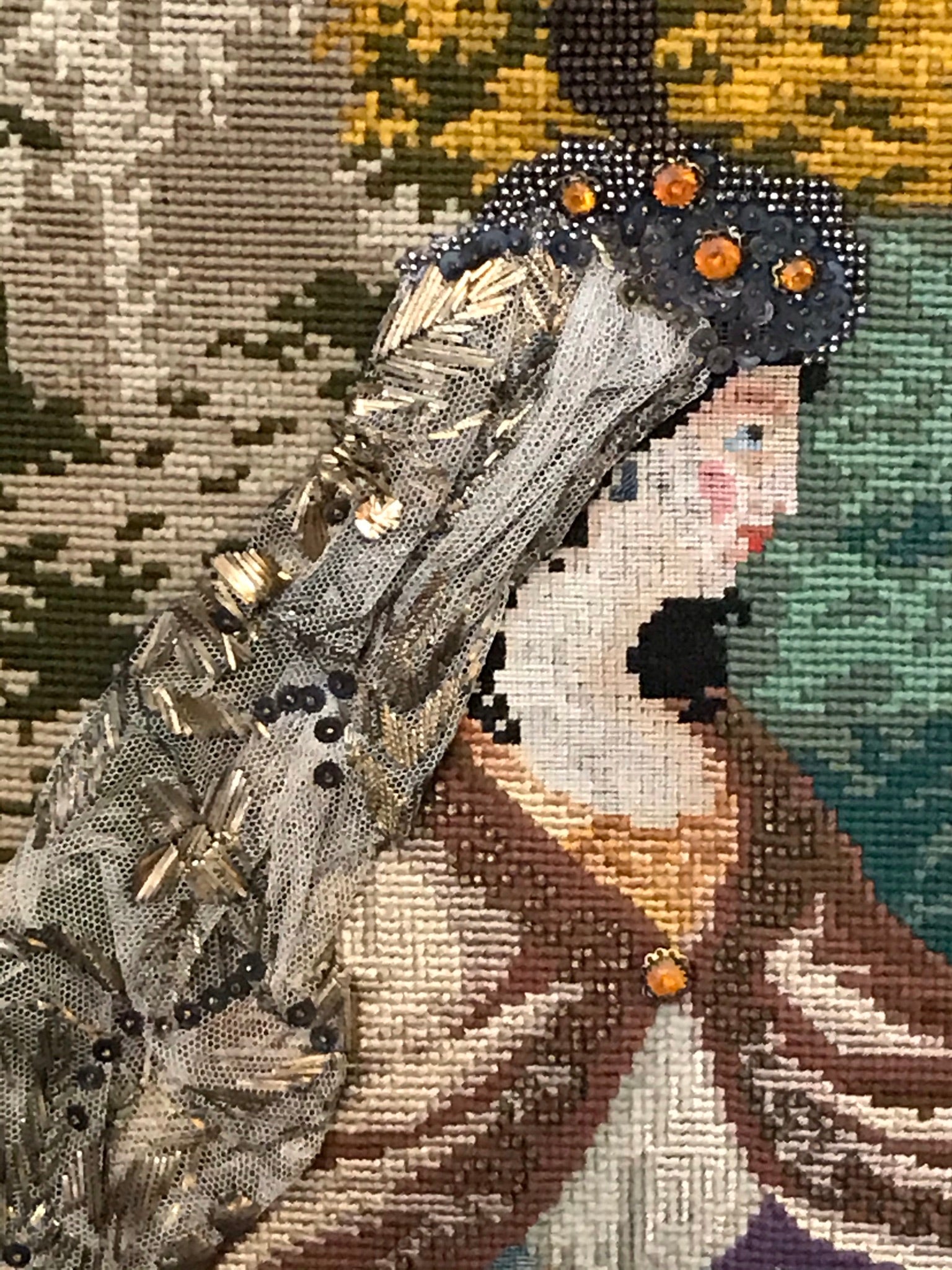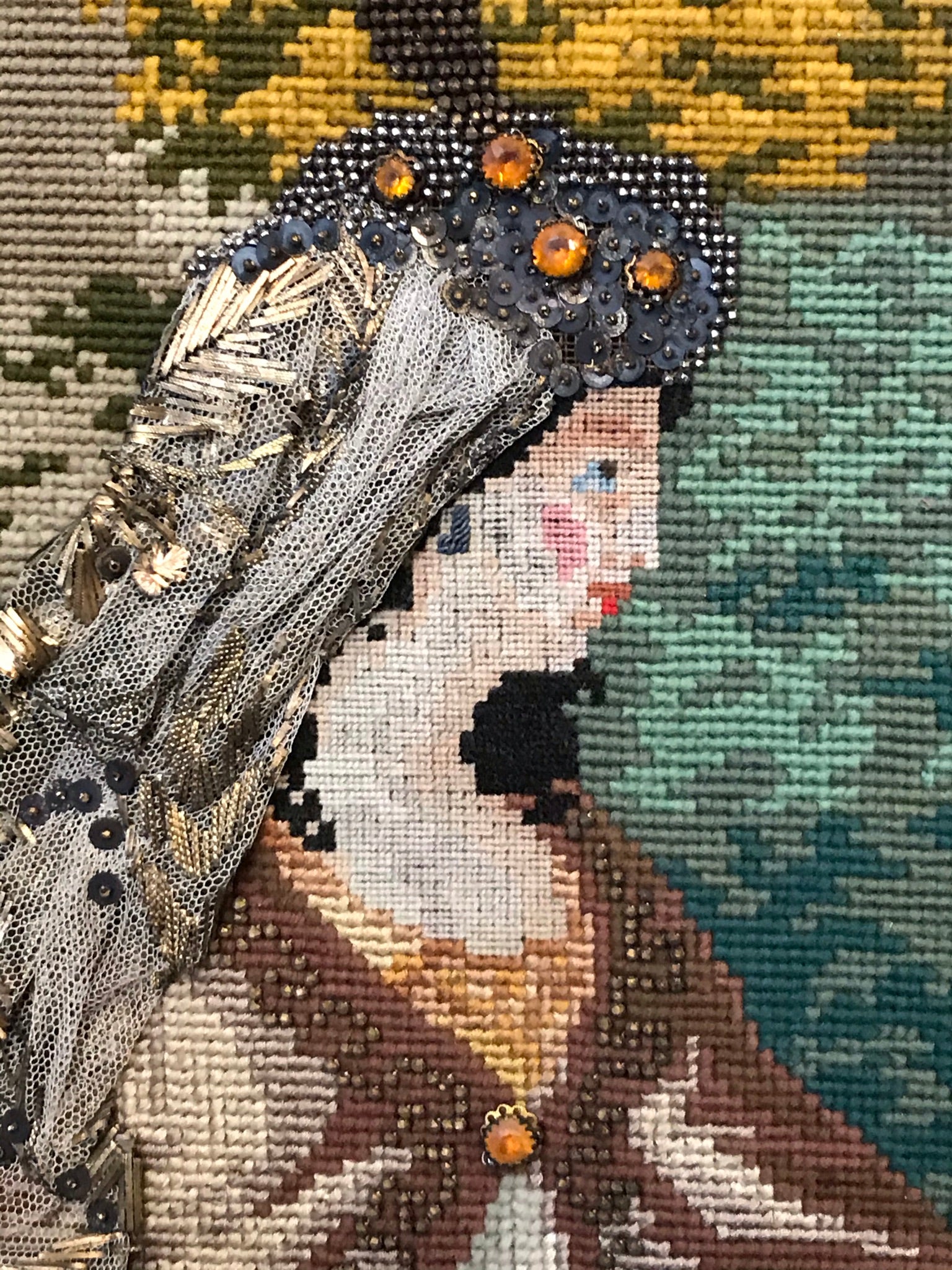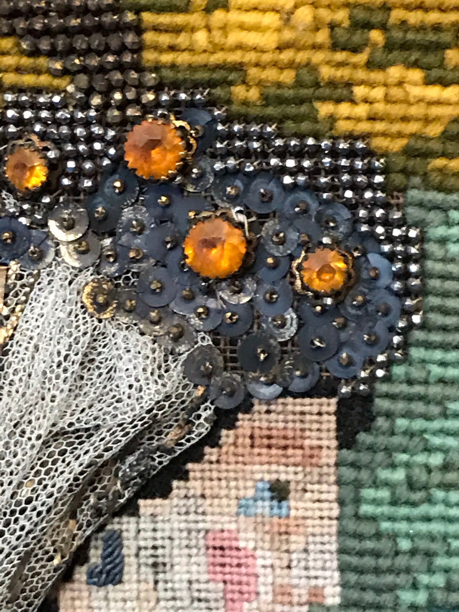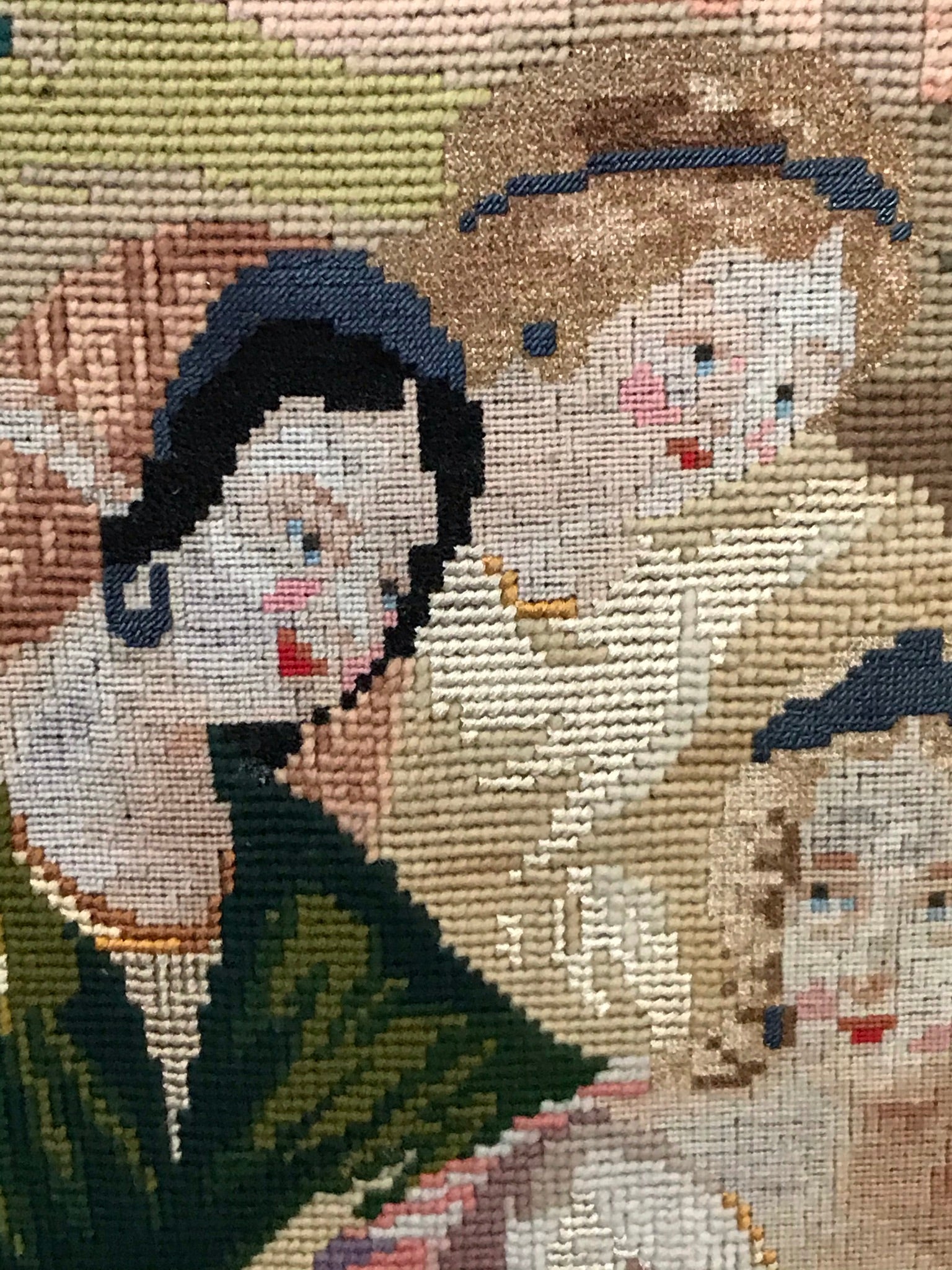ANTIQUE RARE MEEDLEPOINT "FINDING OF MOSES" LARGE NEEDLEPOINT WITH APPLIED GLASS AND METAL BEADS, SUPERBLY DONE CIRCA 1870's SIGNED IN GILT BY AGNES C. MILLIGAN OF URSULINE CONVENT IN DECATUR ILLINOIS IN BEAUTIFUL FRAME, 51" TALL X 44" WIDE. CALL, TEXT, OR E-MAIL FOR MORE INFORMATION