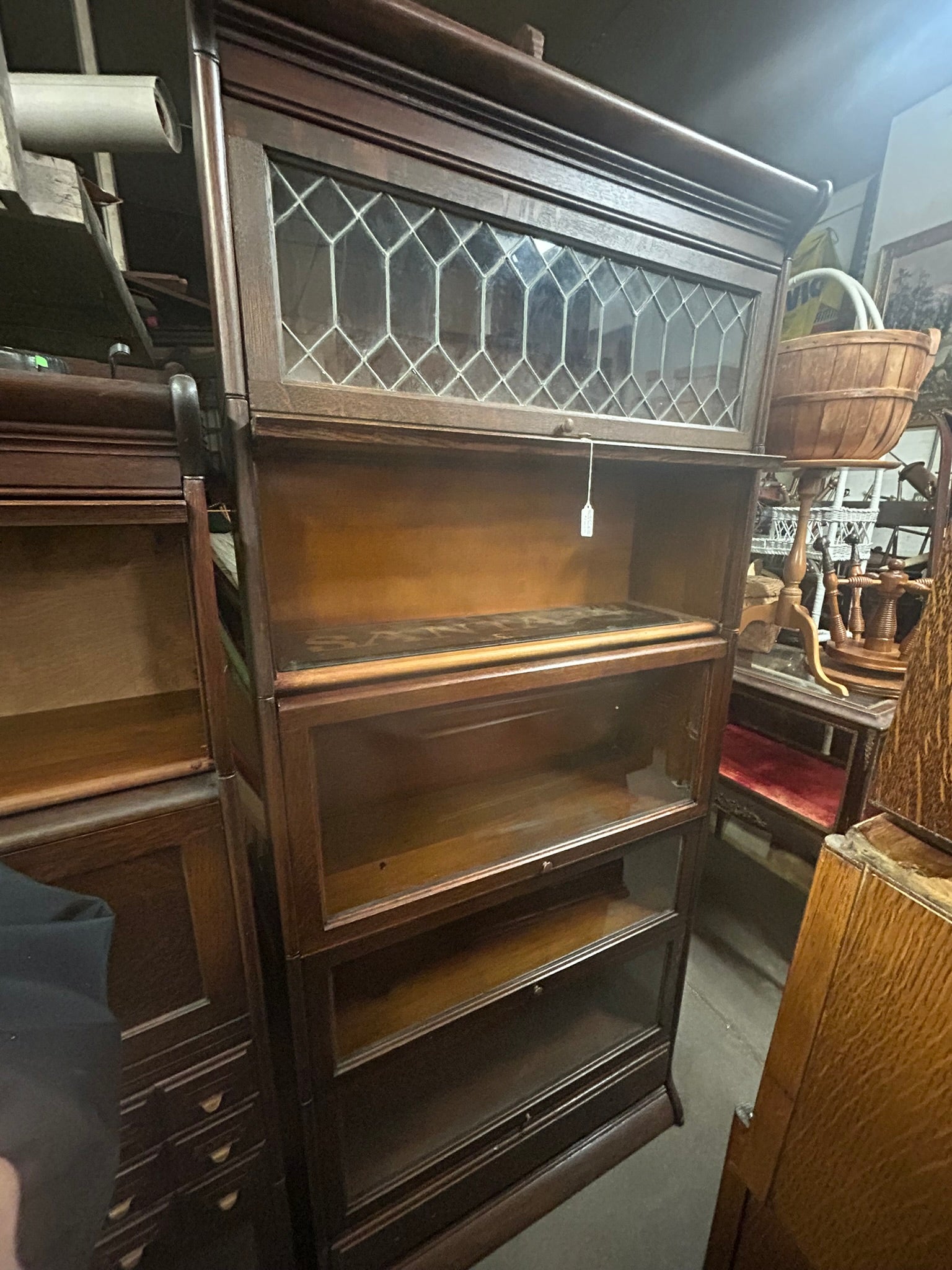 ANTIQUE OAK FIVE SECTION BARRISTER BOOKCASE WITH LEADED GLASS TOP SECTION AND DRAWER IN BASE, 78" TALL X 38" WIDE. CALL, TEXT, OR E-MAIL FOR MORE INFORMATION