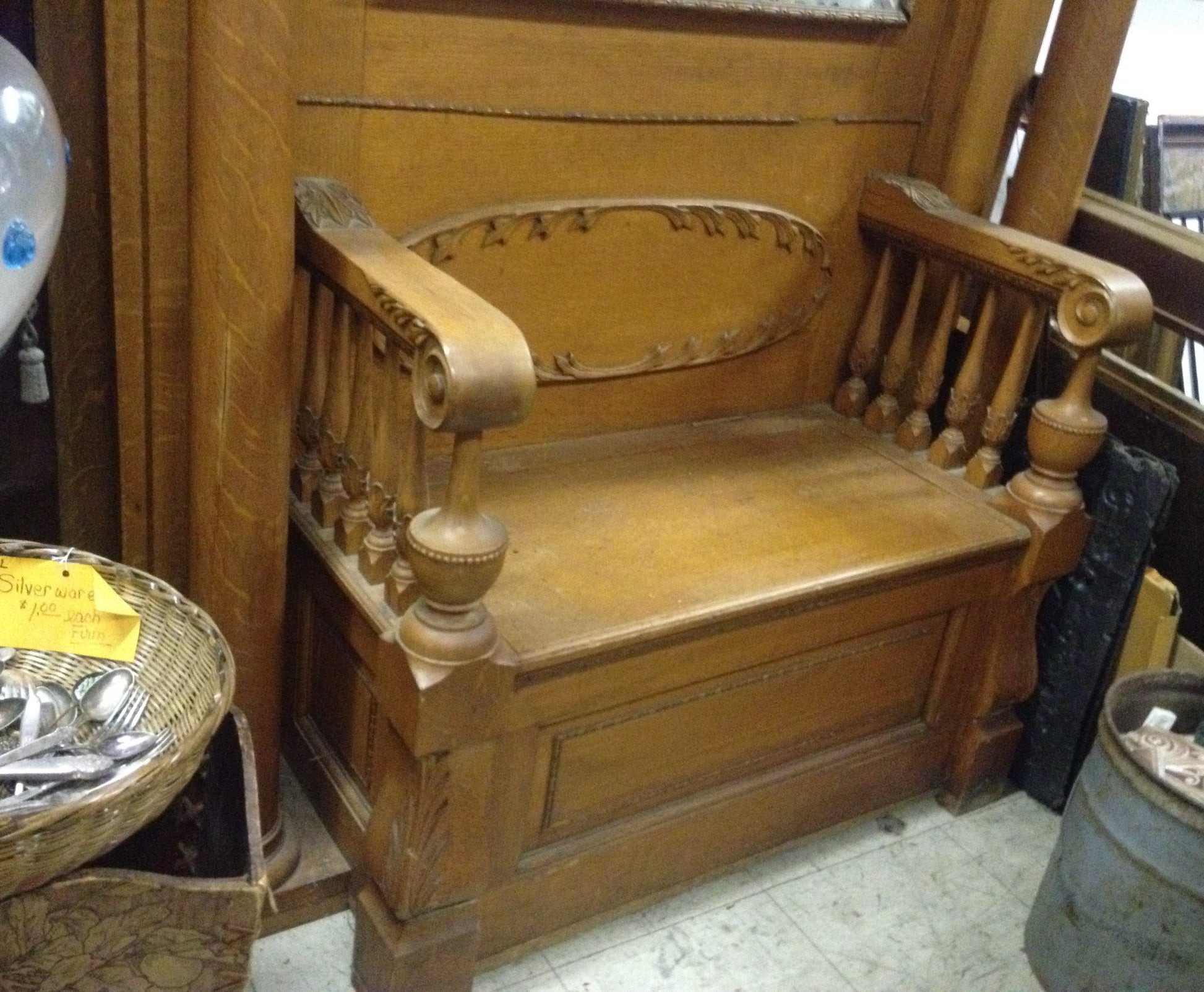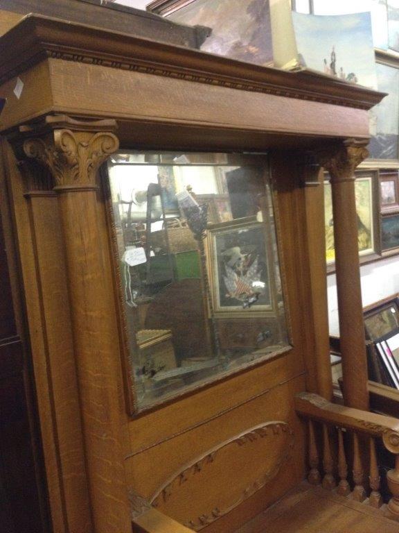ANTIQUE OAK MIRRORED HALL SEAT FROM EARLY CLOTHING STORE IN LINCOLN NEBRASKA