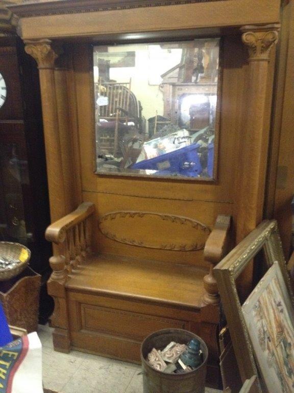 ANTIQUE OAK MIRRORED HALL SEAT FROM EARLY CLOTHING STORE IN LINCOLN NEBRASKA. CALL, TEXT, OR E-MAIL FOR MORE INFORMATION
