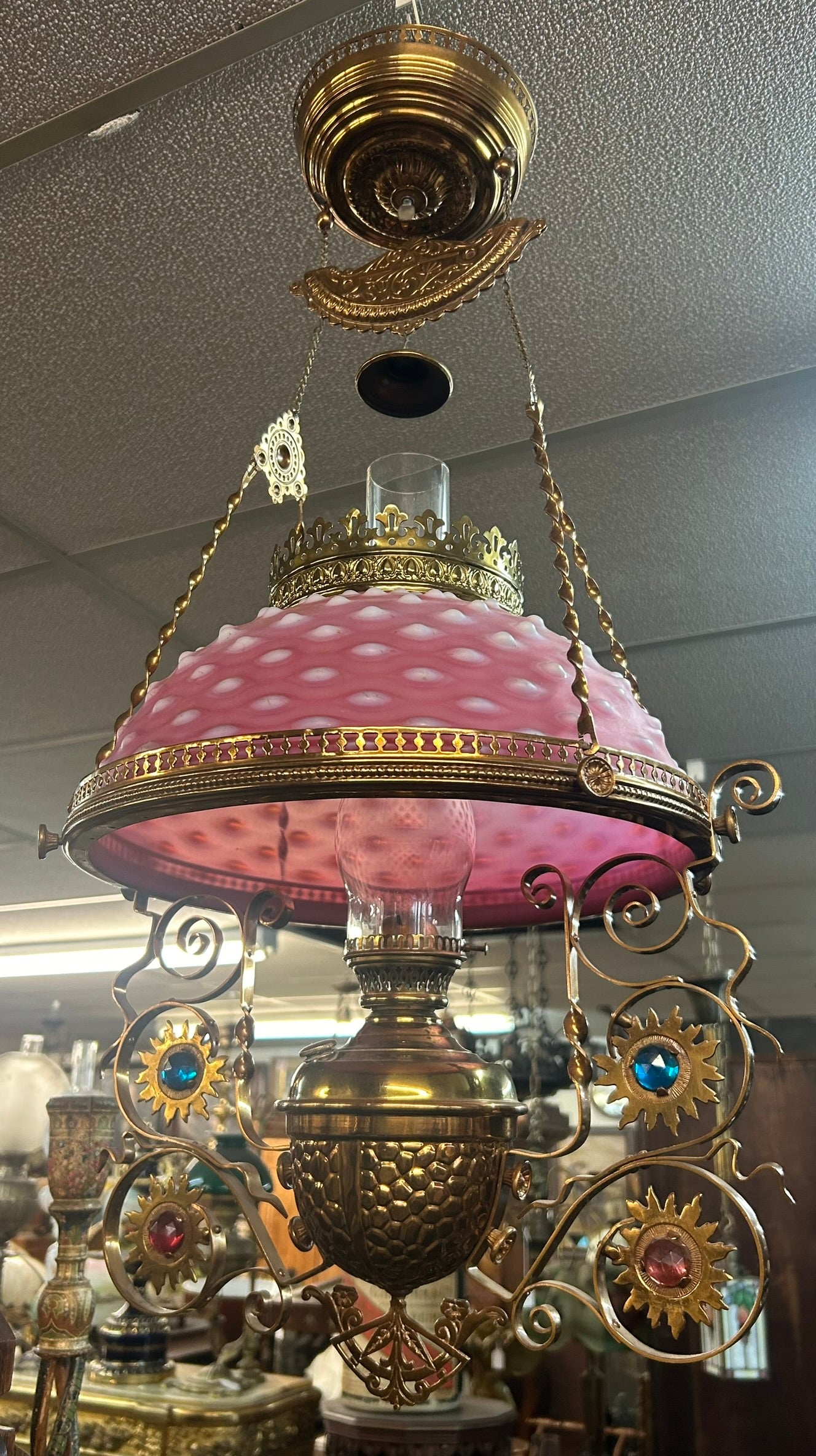ANTIQUE OPALESCENT CRANBERRY HOBNAIL HANGING LIBRARY LAMP