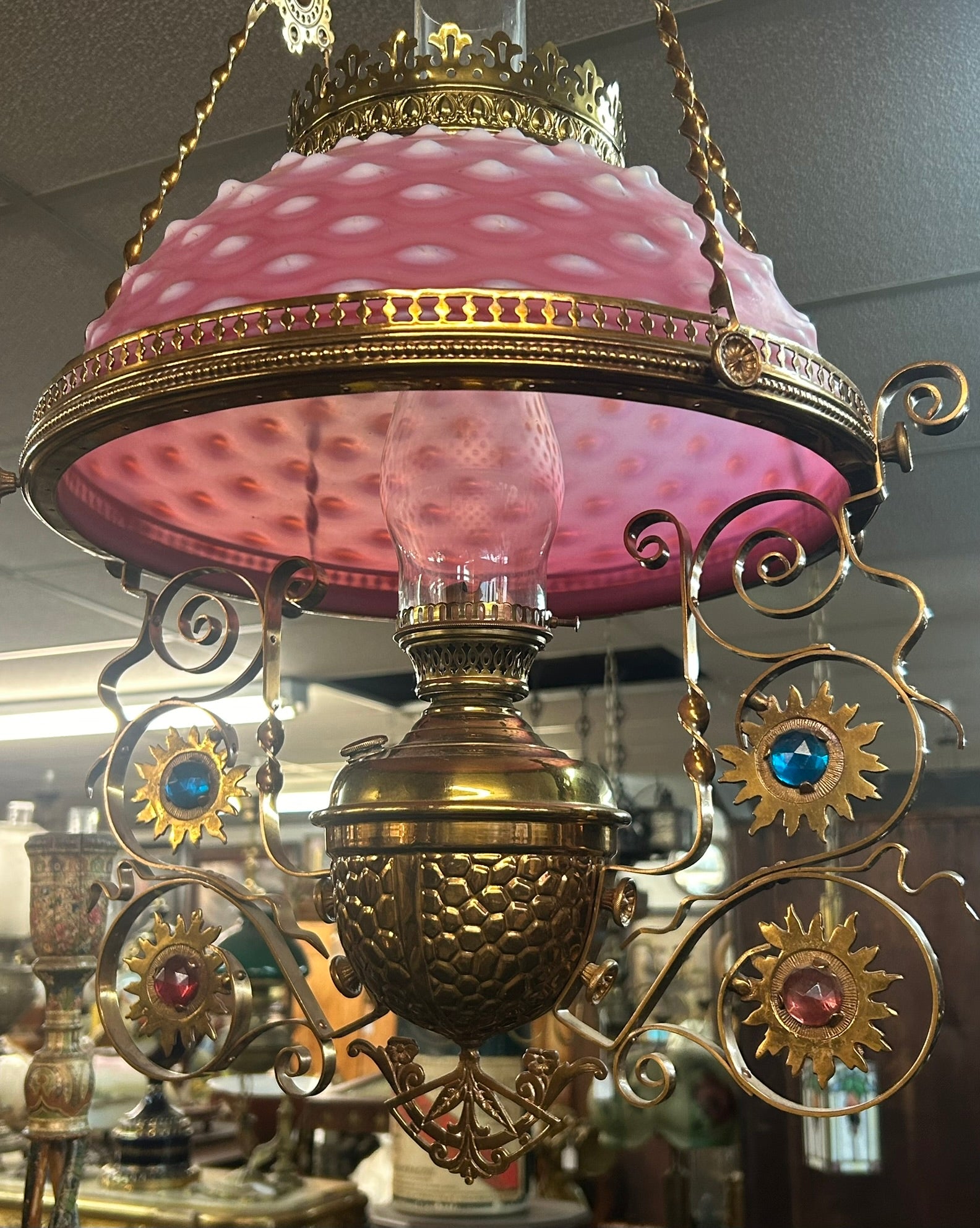 ANTIQUE CRANBERRY OPALESCENT HOBNAIL HANGING KEROSCENE LIBRARY LAMP. CALL OR TEXT FOR MORE INFORMATION