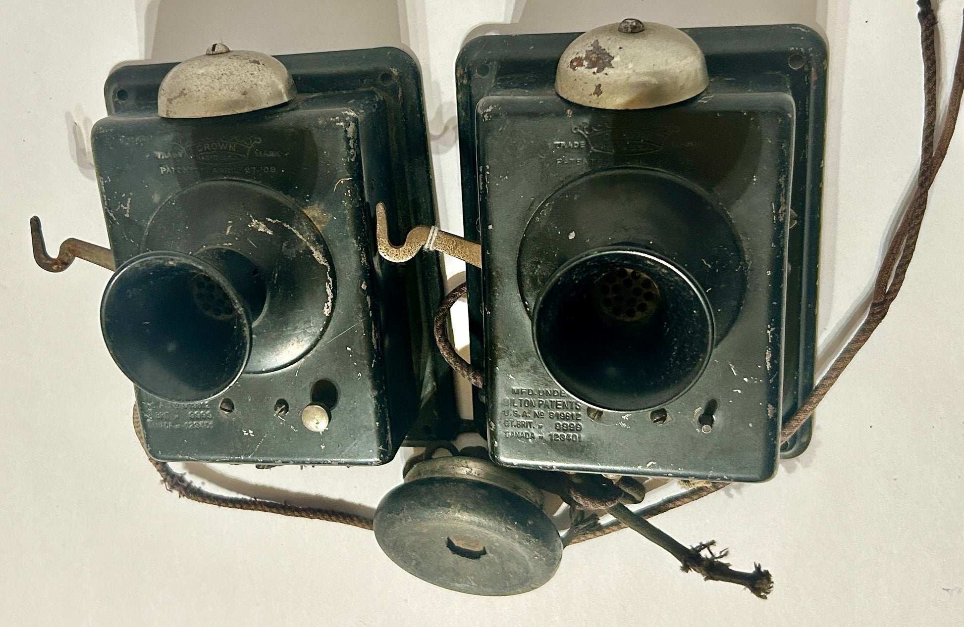 ANTIQUE PAIR OF DATED 1909 WALL INTERCOMS BY CROWN 6" TALL X 4 1/2" WIDE X 3 1/2" DEEP. SHIPPING IS EXTRA SO CALL OR TEXT TO FIND OUT HOW MUCH SHIPPING WILL COST
