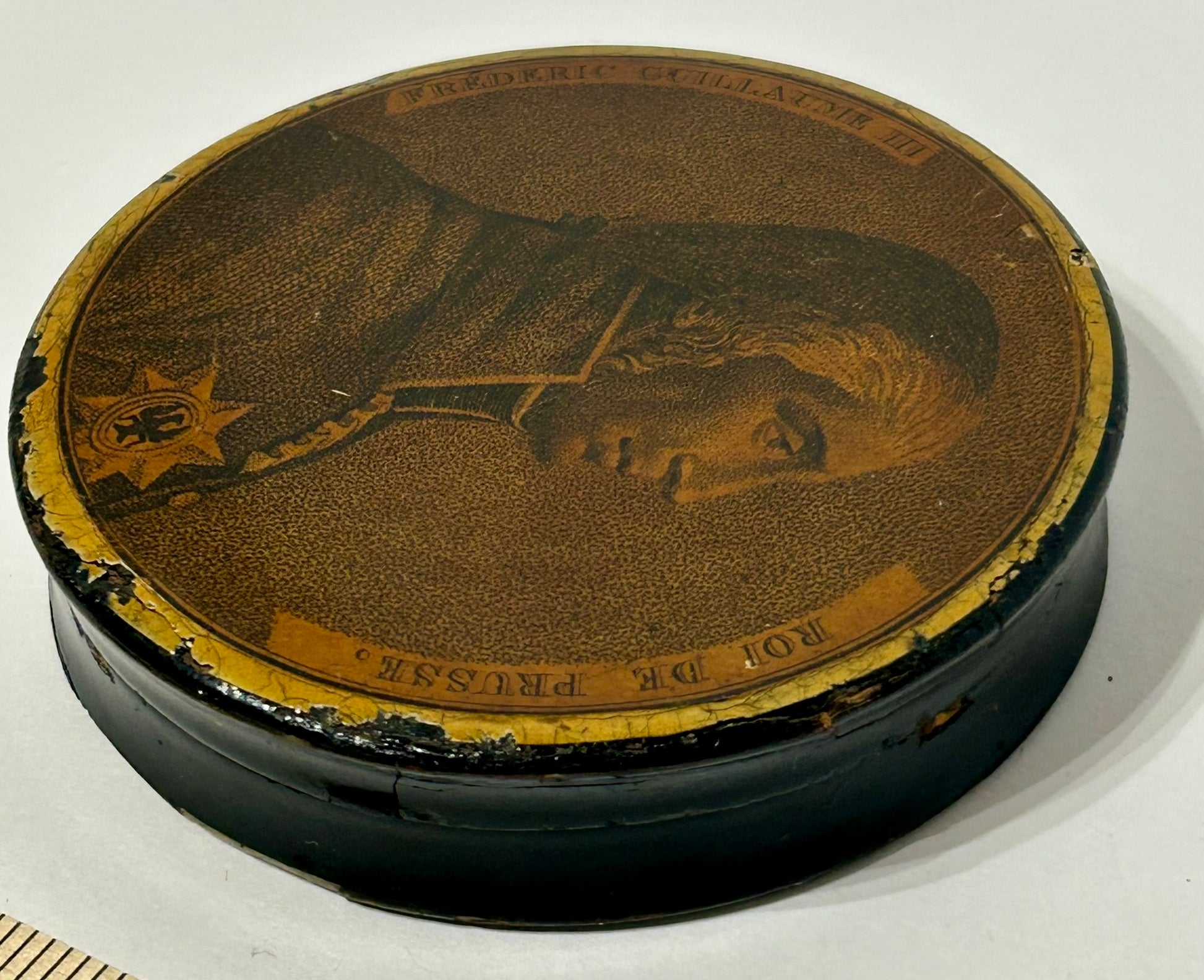 PAPER MACHE SNUFF BOX WITH PORTRAIT OF FREDERICK III OF PRUSSIAN ON LID 3 1/2" DIA. CALL OR TEXT FOR MORE INFORMATION