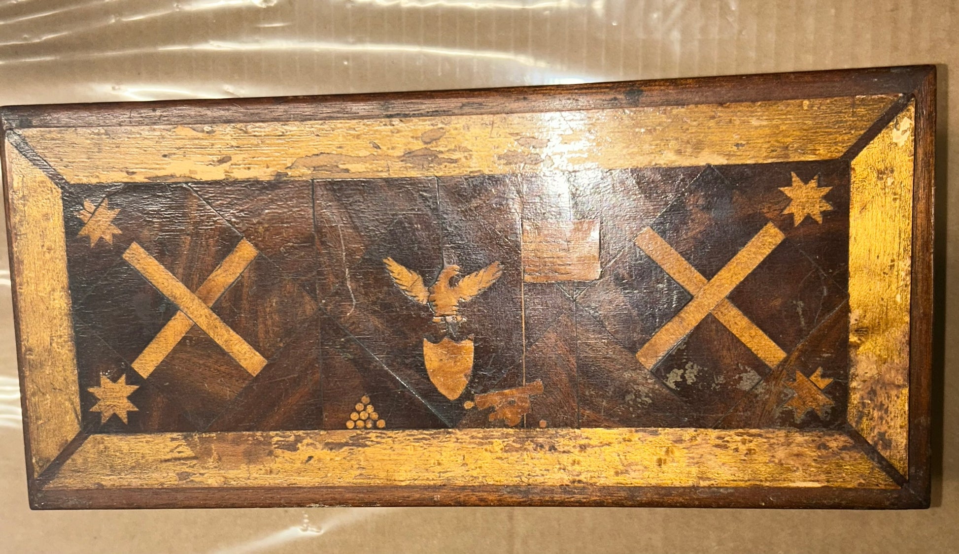 ANTIQUE INLAID PATRIOTIC WOOD DRAWERED BOX 12" LONG X 5" TALL X 5 1/2" DEEP. CALL OR TEXT FOR MORE INFORMATION